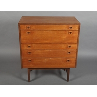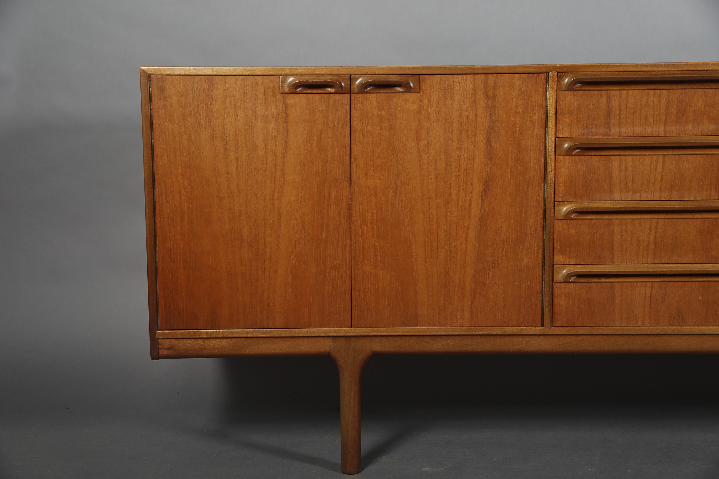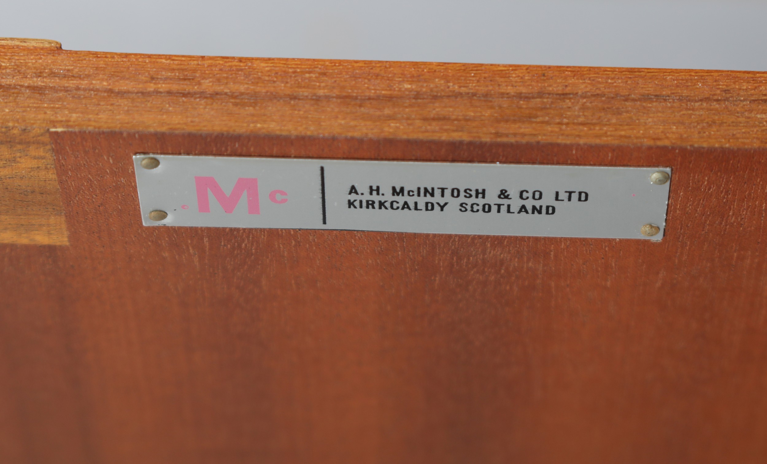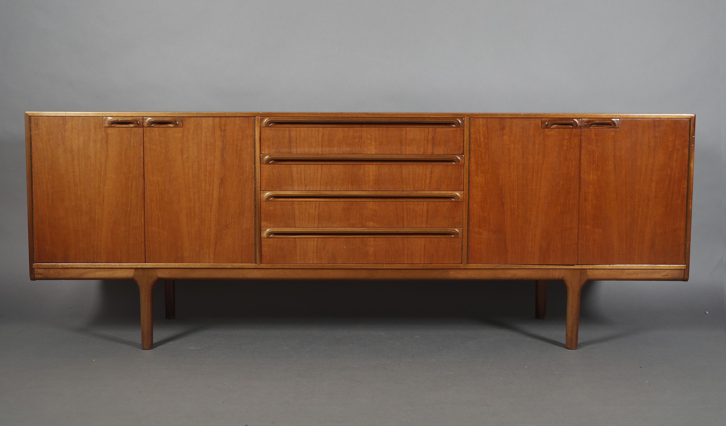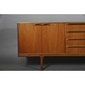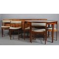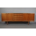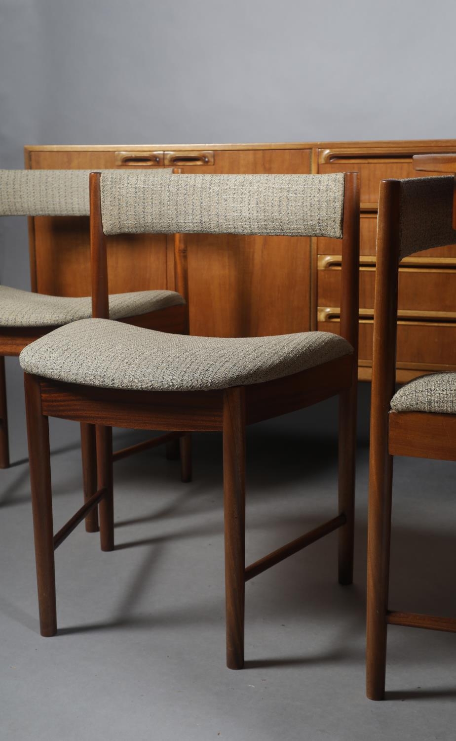 McIntosh of Kirkcaldy, A teak dining suite c1970s, circular extending table with one leaf, 168cm x 122cm, set of six chairs with cloth upholstered seats, sideboard with four drawers to the centre flanked by a two door cupboard to either side, 214cm wide x 46cm deep x 78cm high