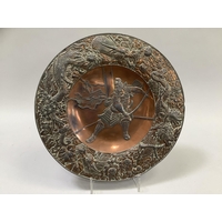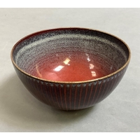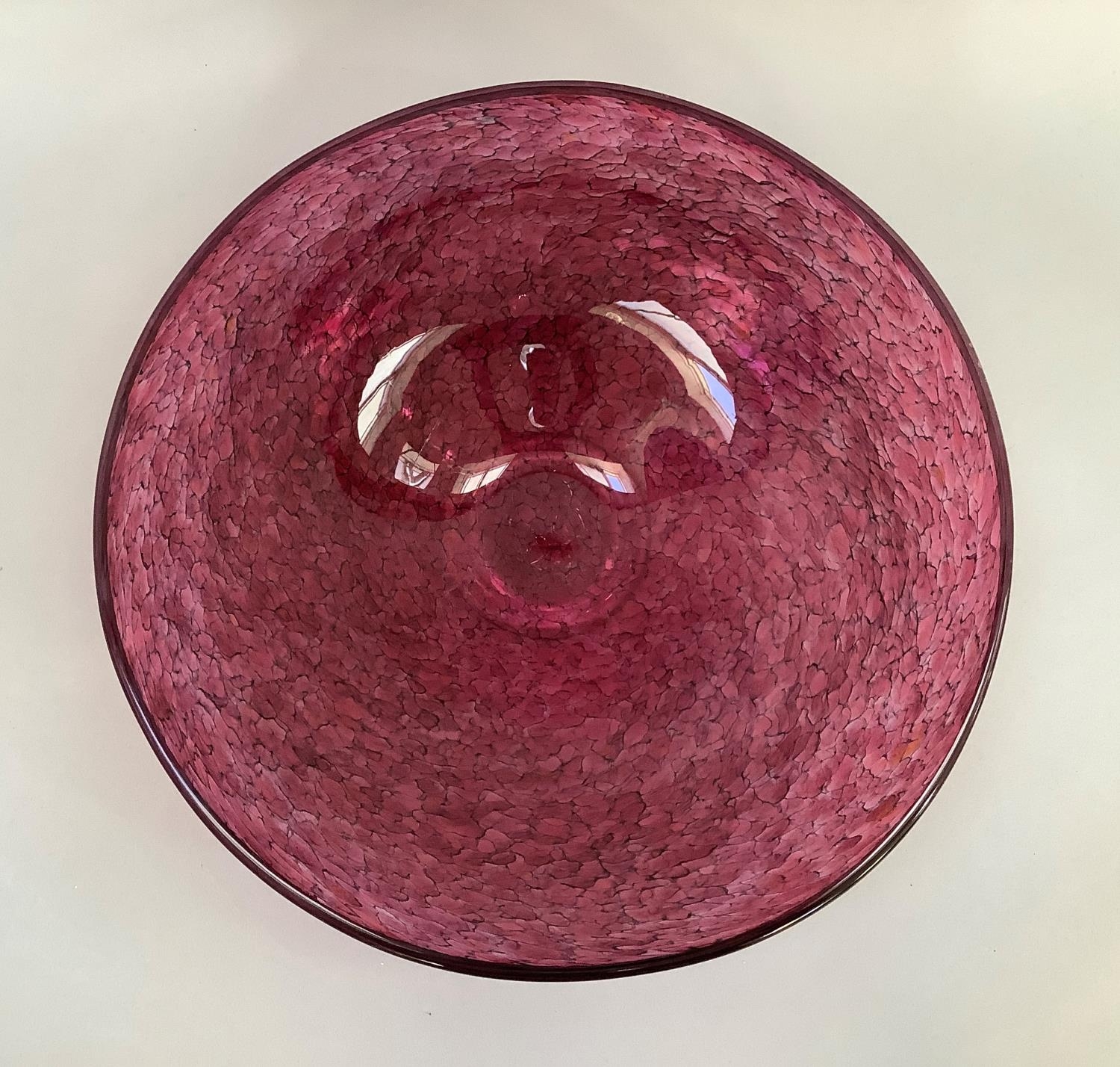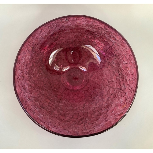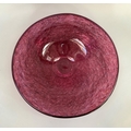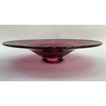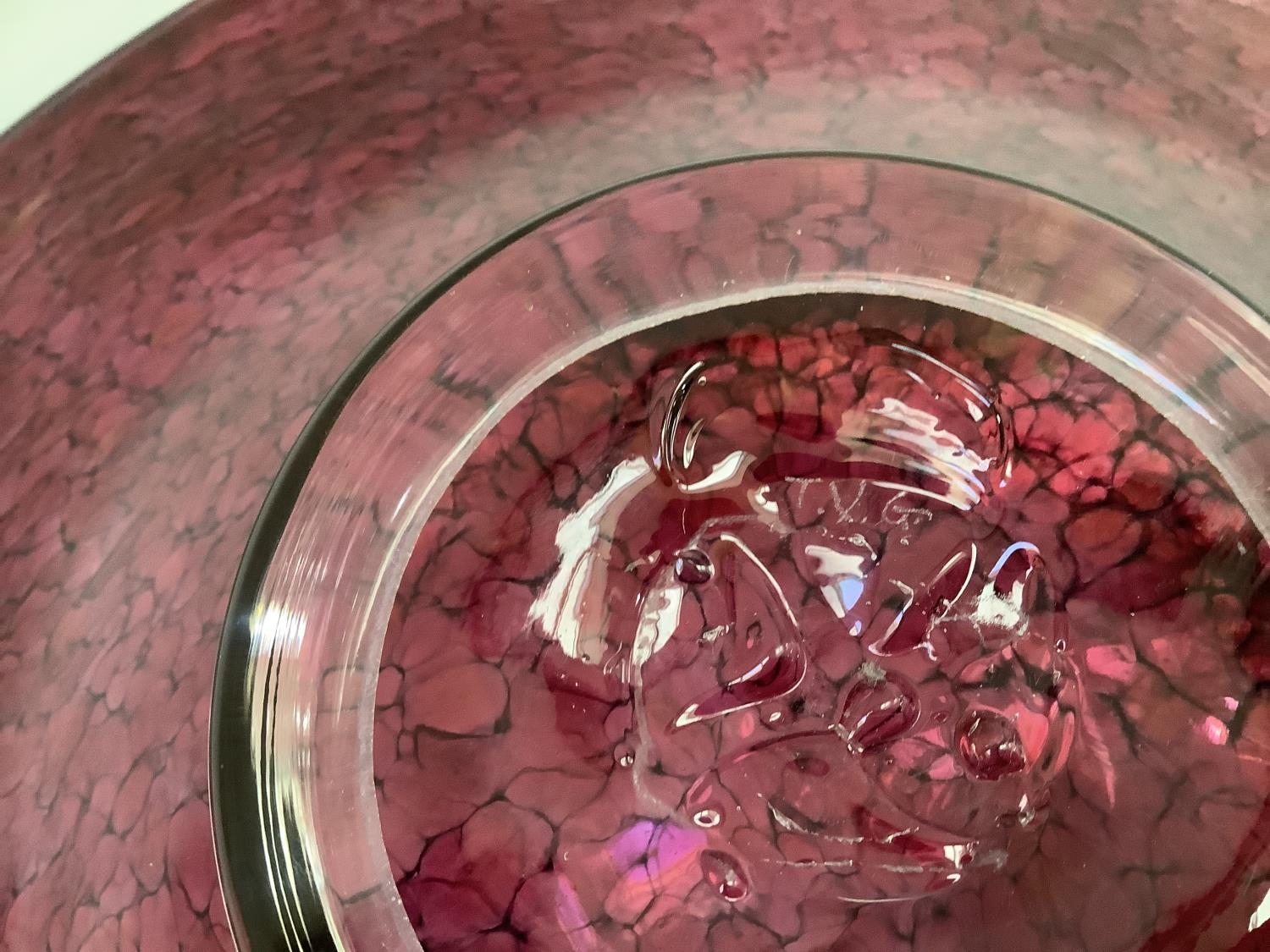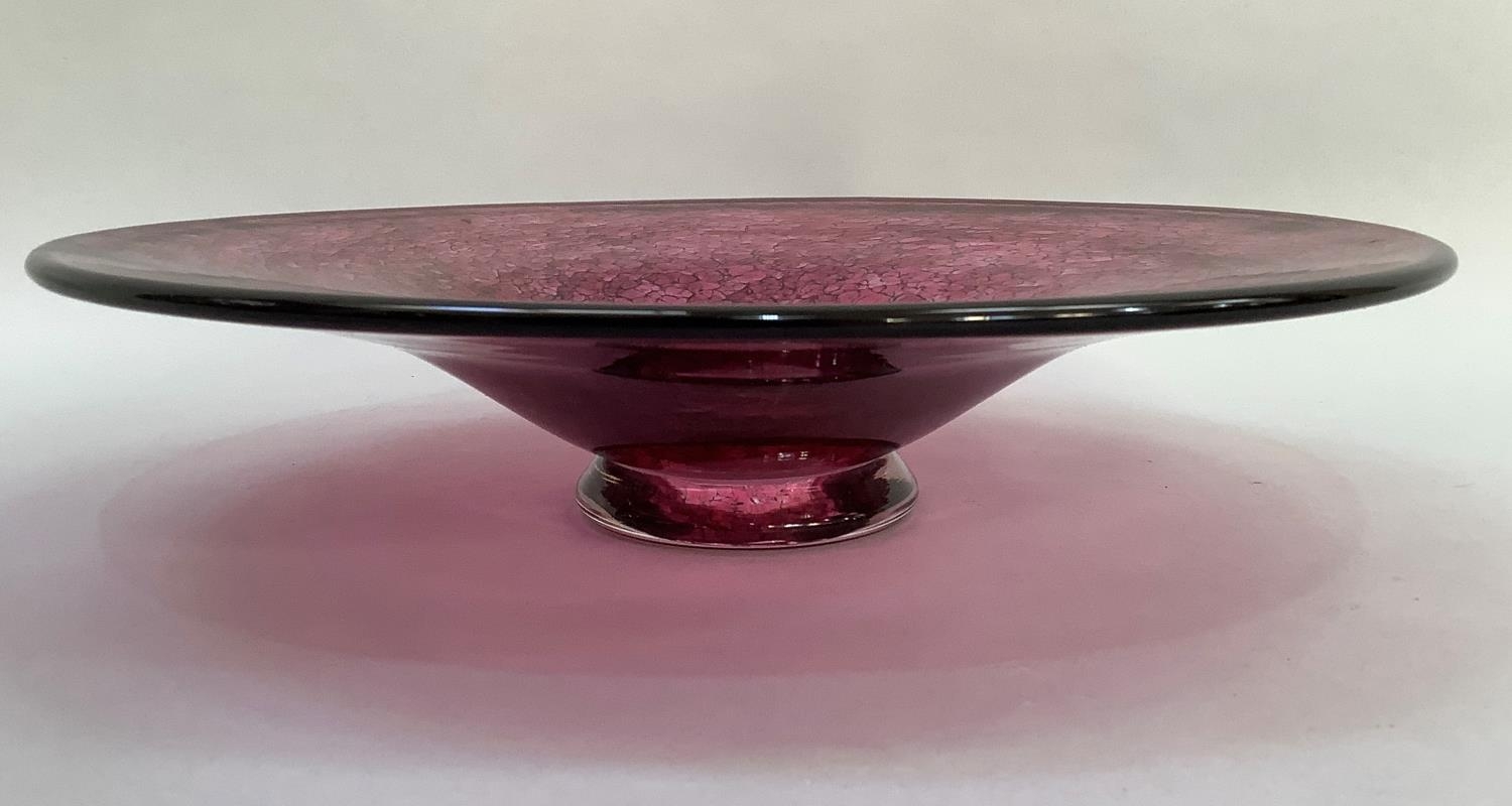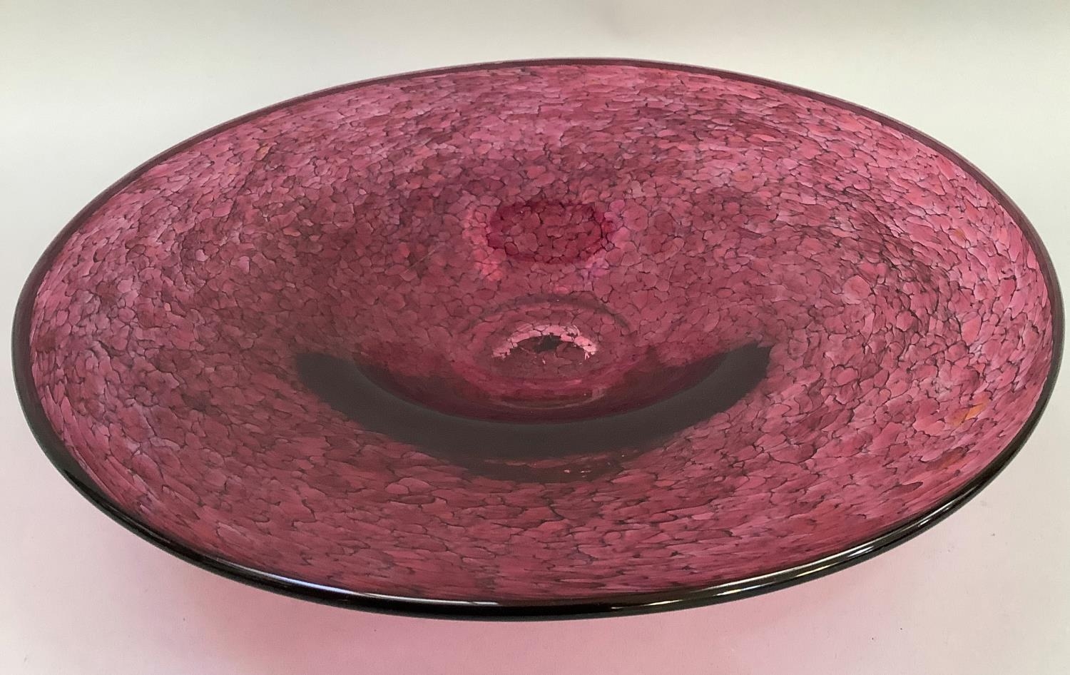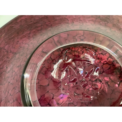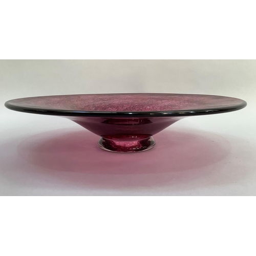 Teign Valley Glass, a cranberry mottled glass dish, circular on pedestal foot, initialled to underside 'TVG', 36.5cm diameter x 8cm high