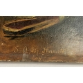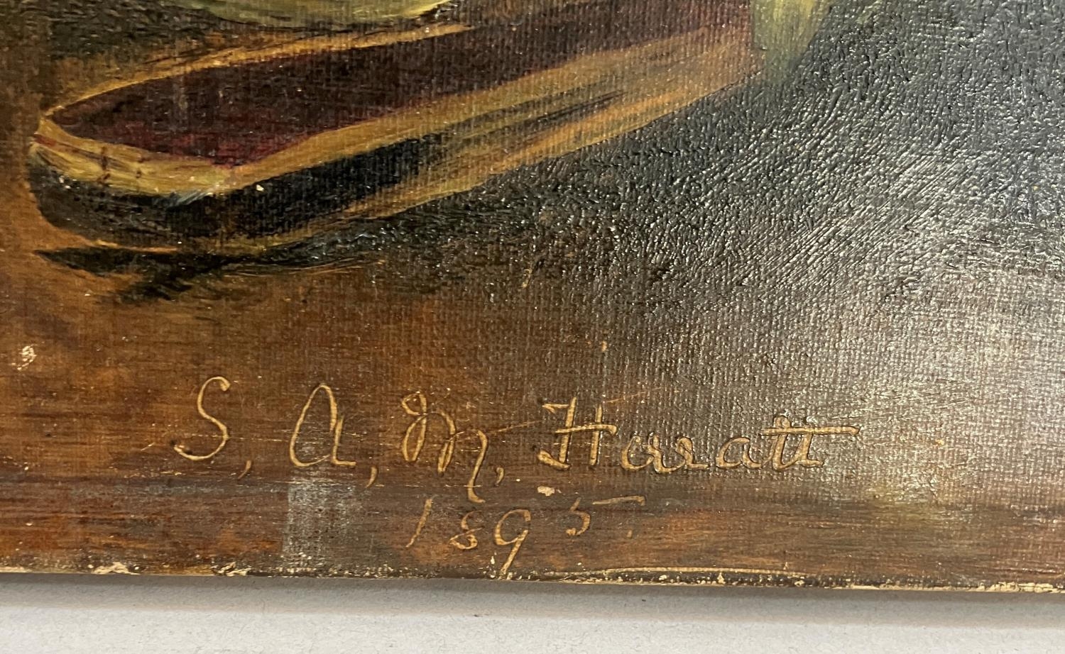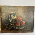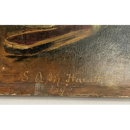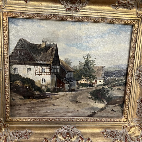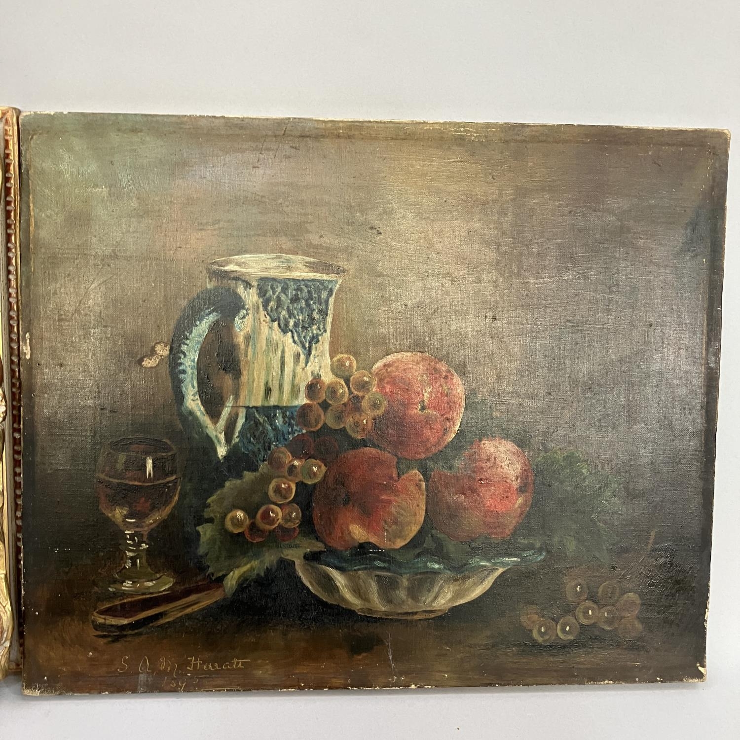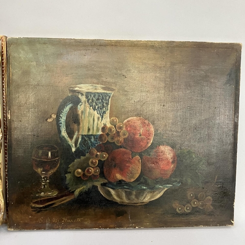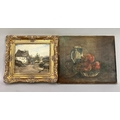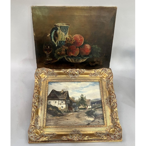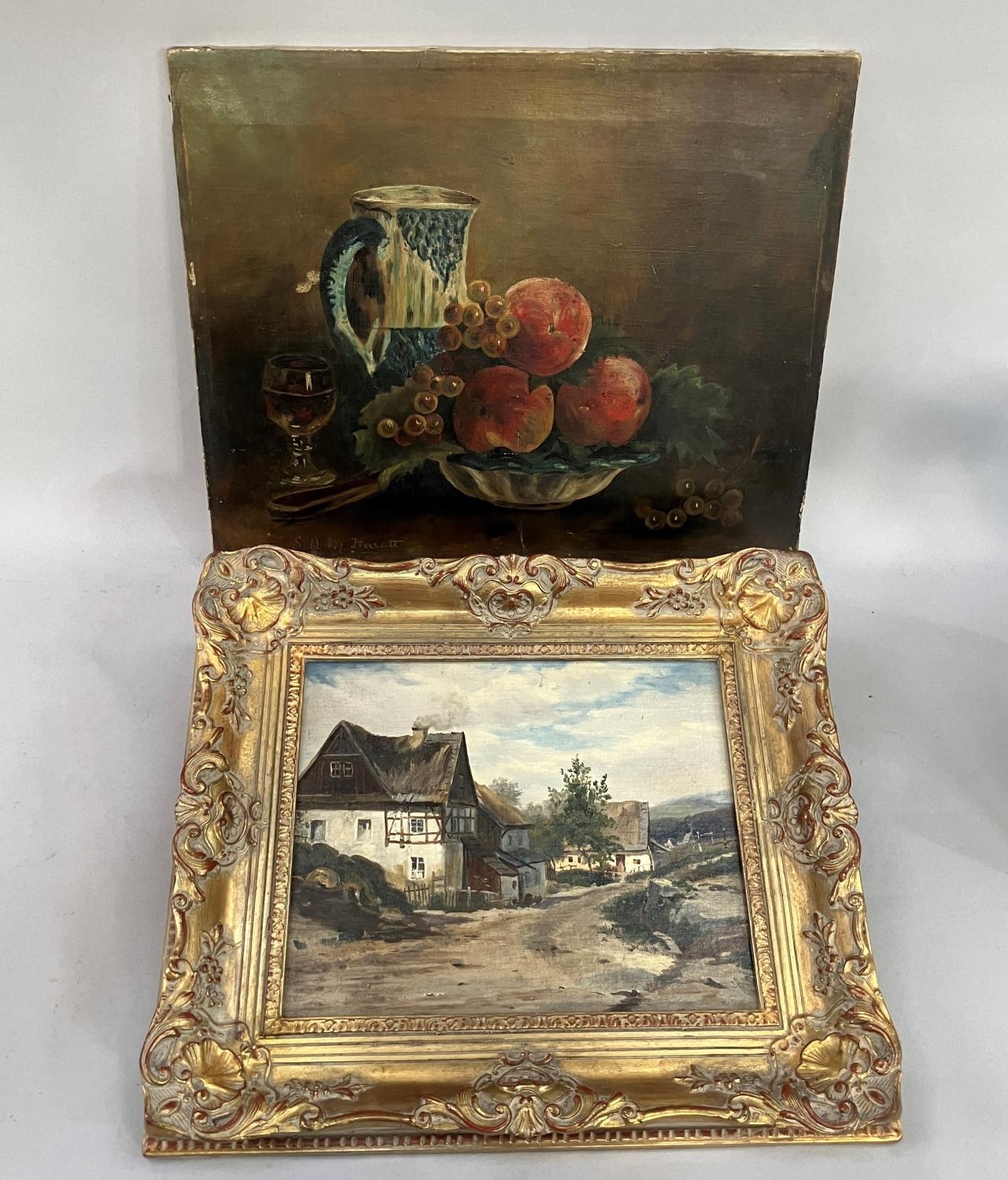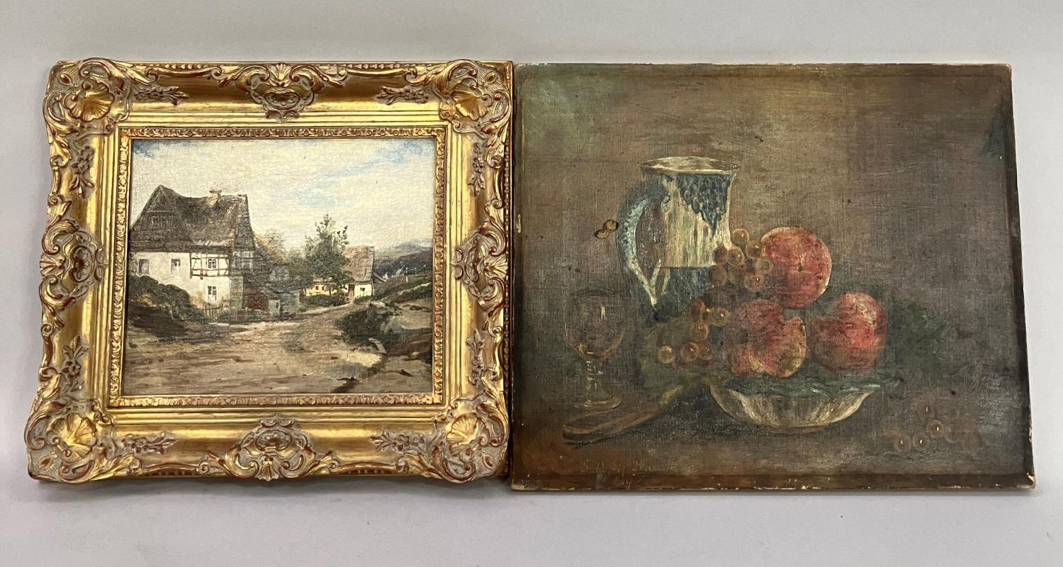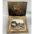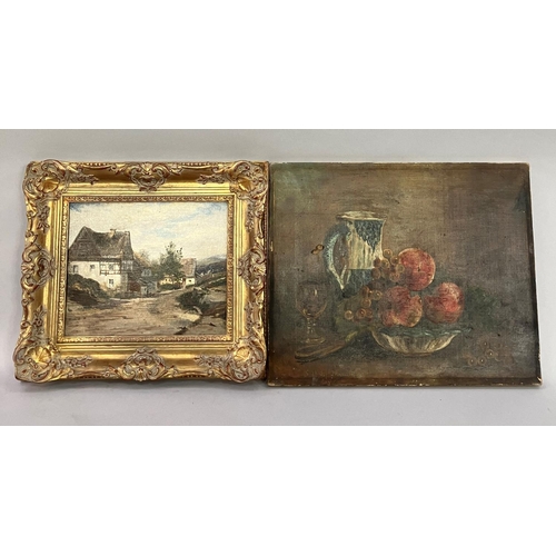 An early 20th century village scene with half timbered house, oil on board, unsigned measuring 24cm x 29cm together with a still life of fruit, blue and white jug, oil on canvas signed S A M Herratt 1895, measuring 39.5cm x 38cm