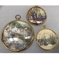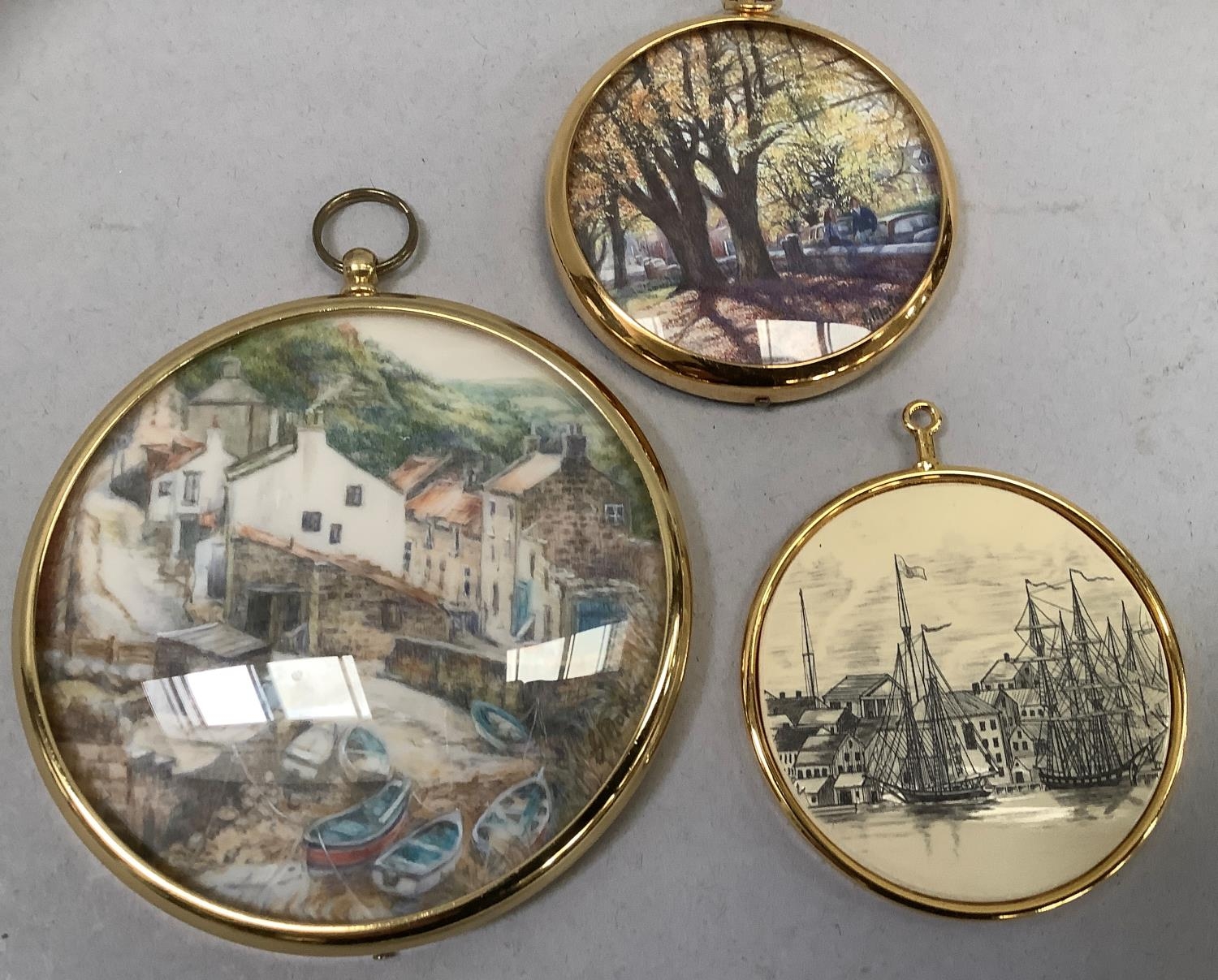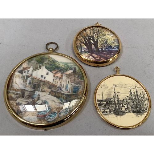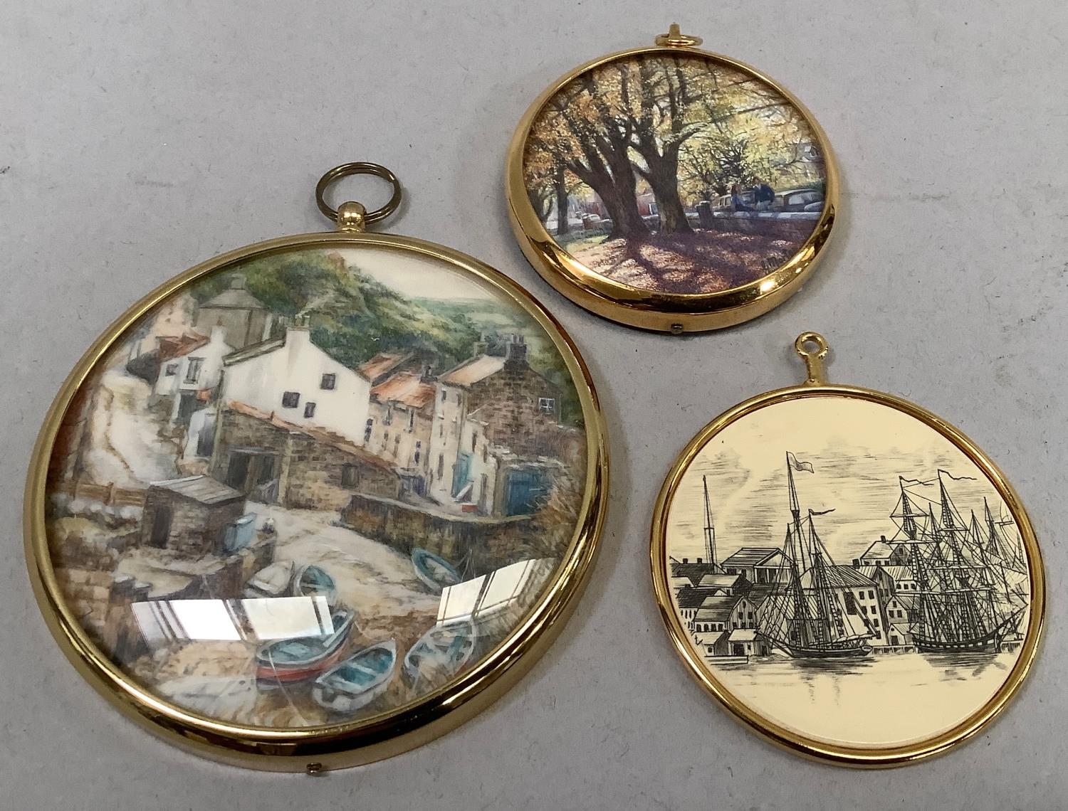 A miniature landscape 'Slipway Staithes', watercolour on ivorine by Gina Morton, signed, 7cm diameter, another by Morton of parkland with figures beside a wall, 4.75cm diameter and a scrimshaw-style view of sailing ships at anchor in gilt metal mount