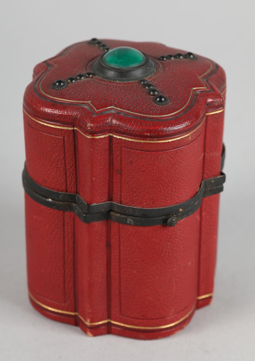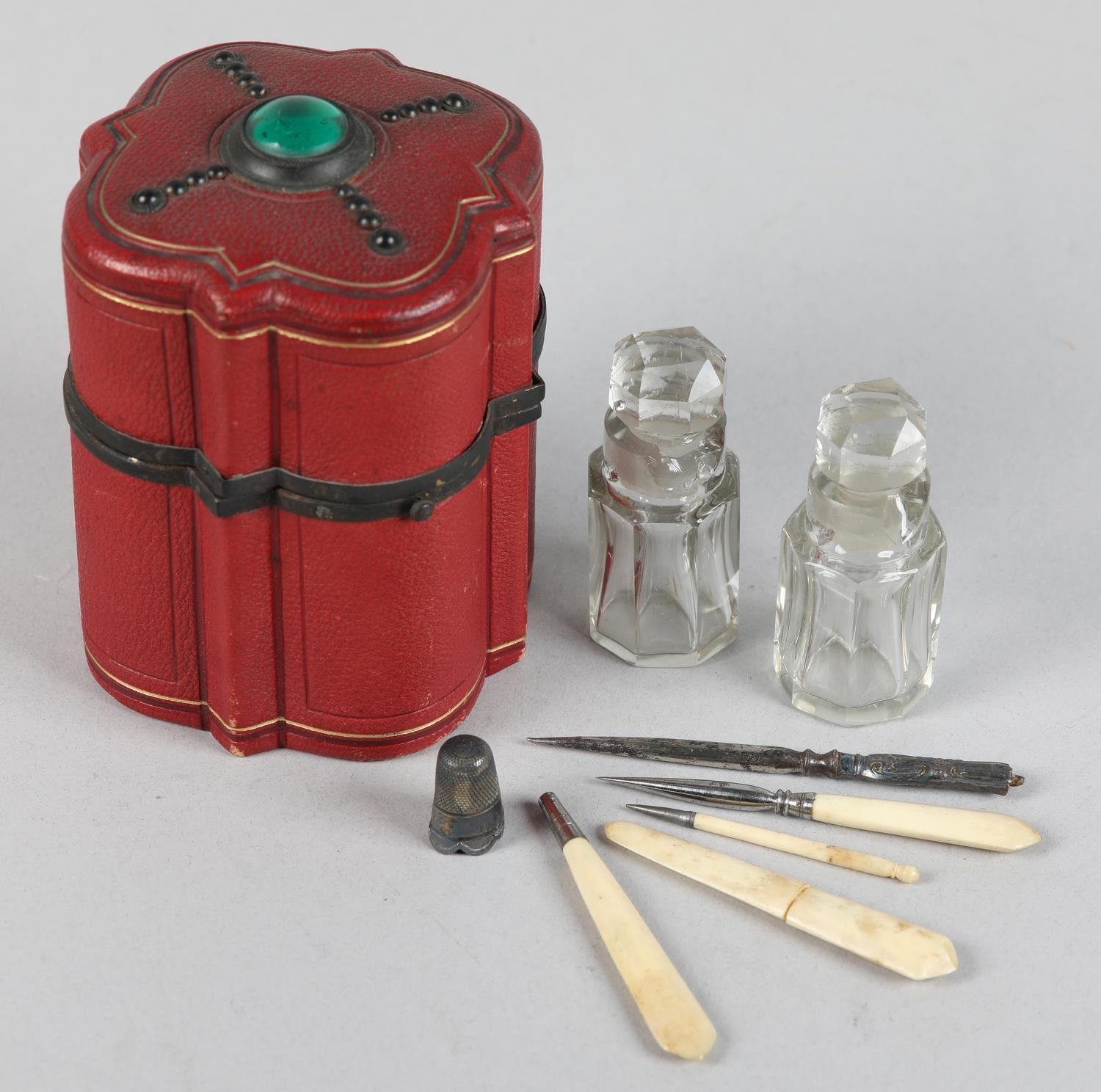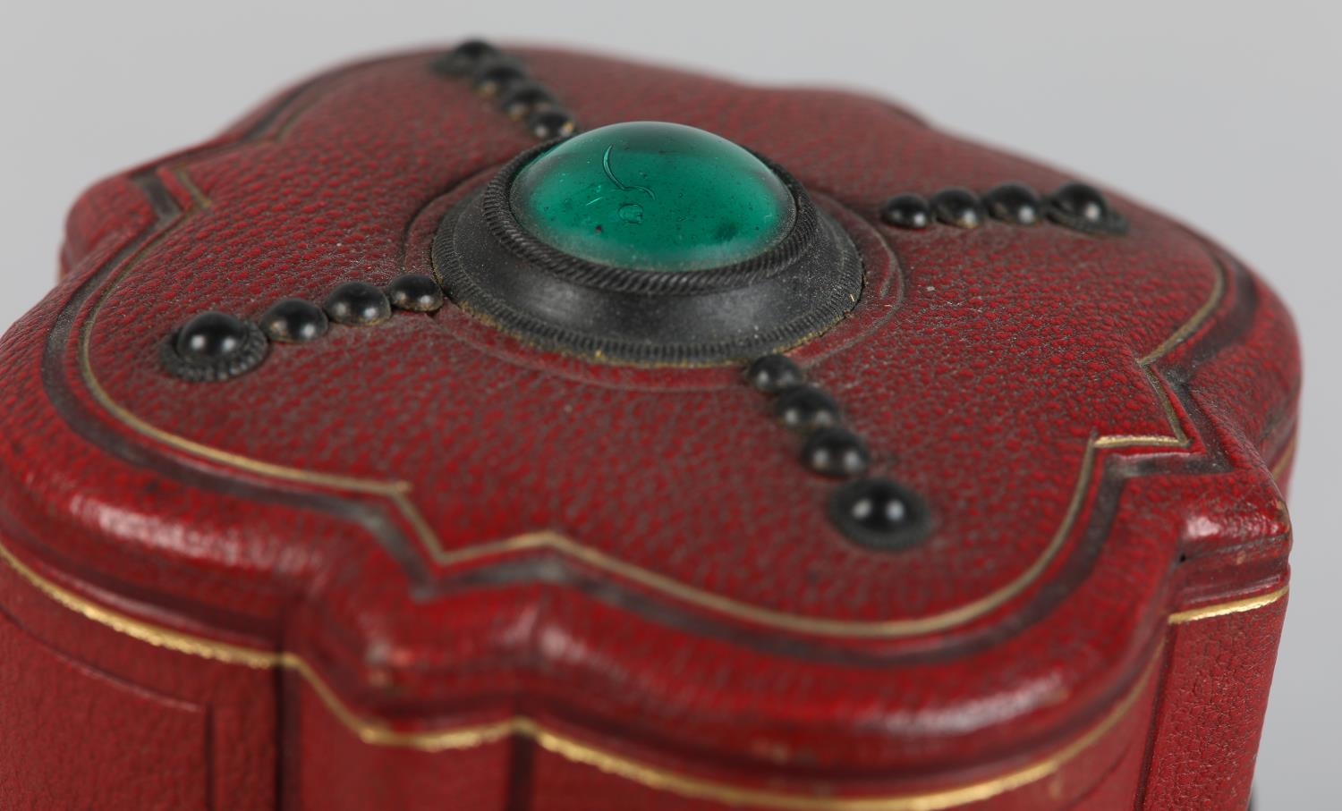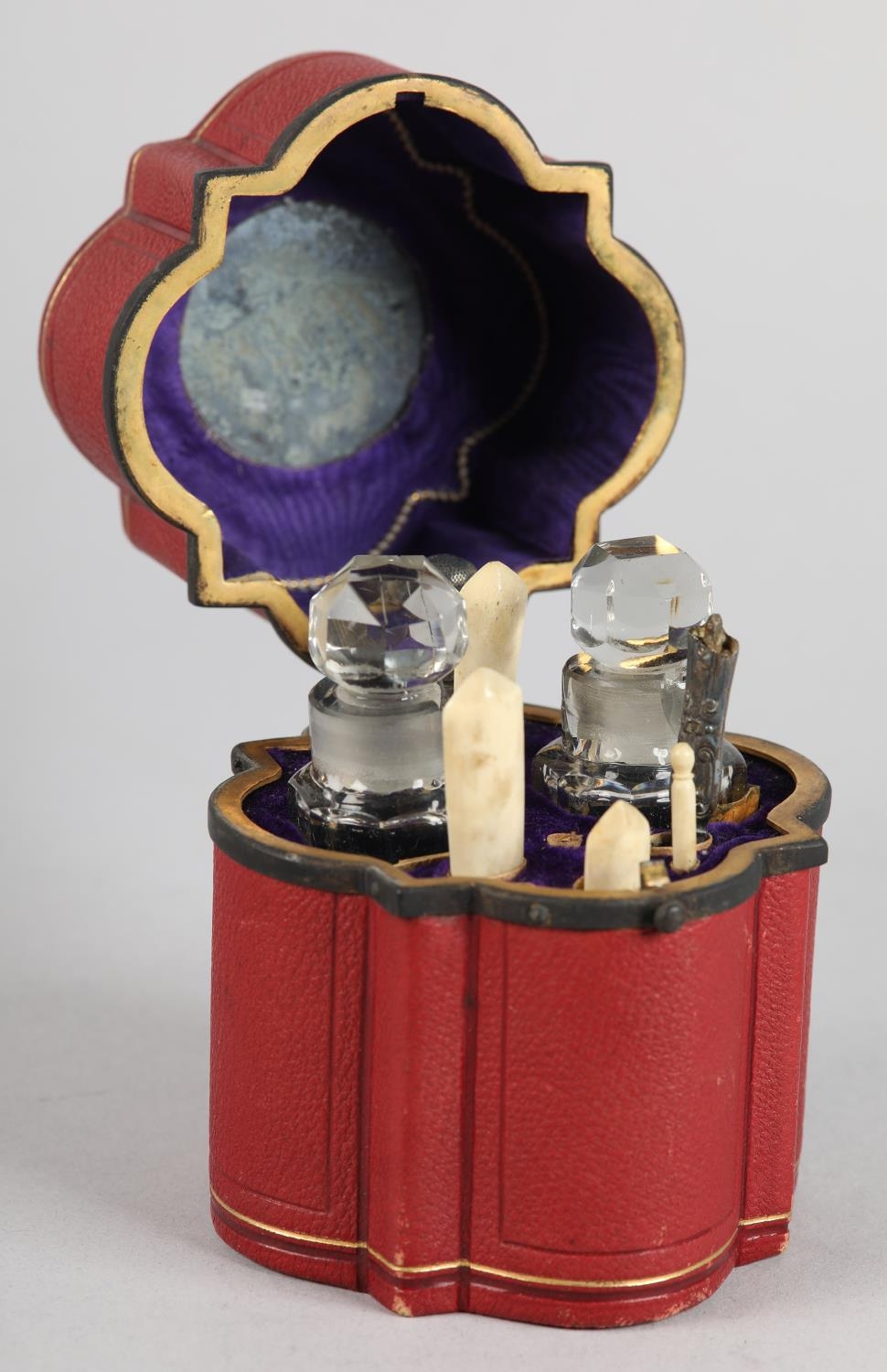 A 19TH CENTURY RED MOROCCO NECESSAIRE of quatrefoil outline, the cover set to the centre with a green 'jewel', the interior lined in purple silk and velvet, fitted with mirror, glass bottles and stoppers, various original and associated implements, 9cm diameter x 12cm high