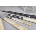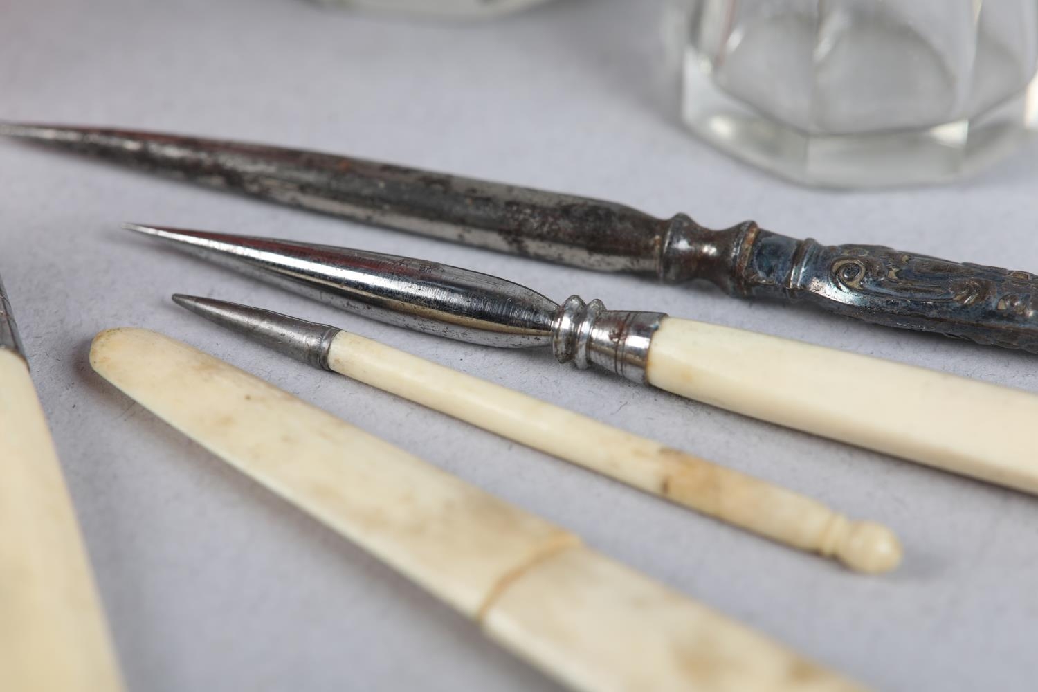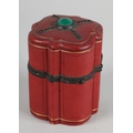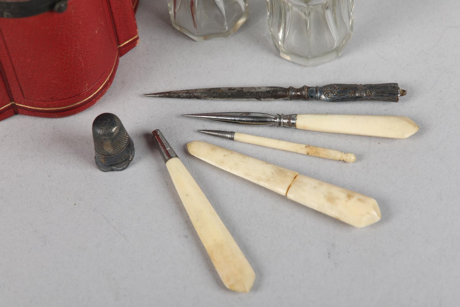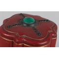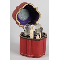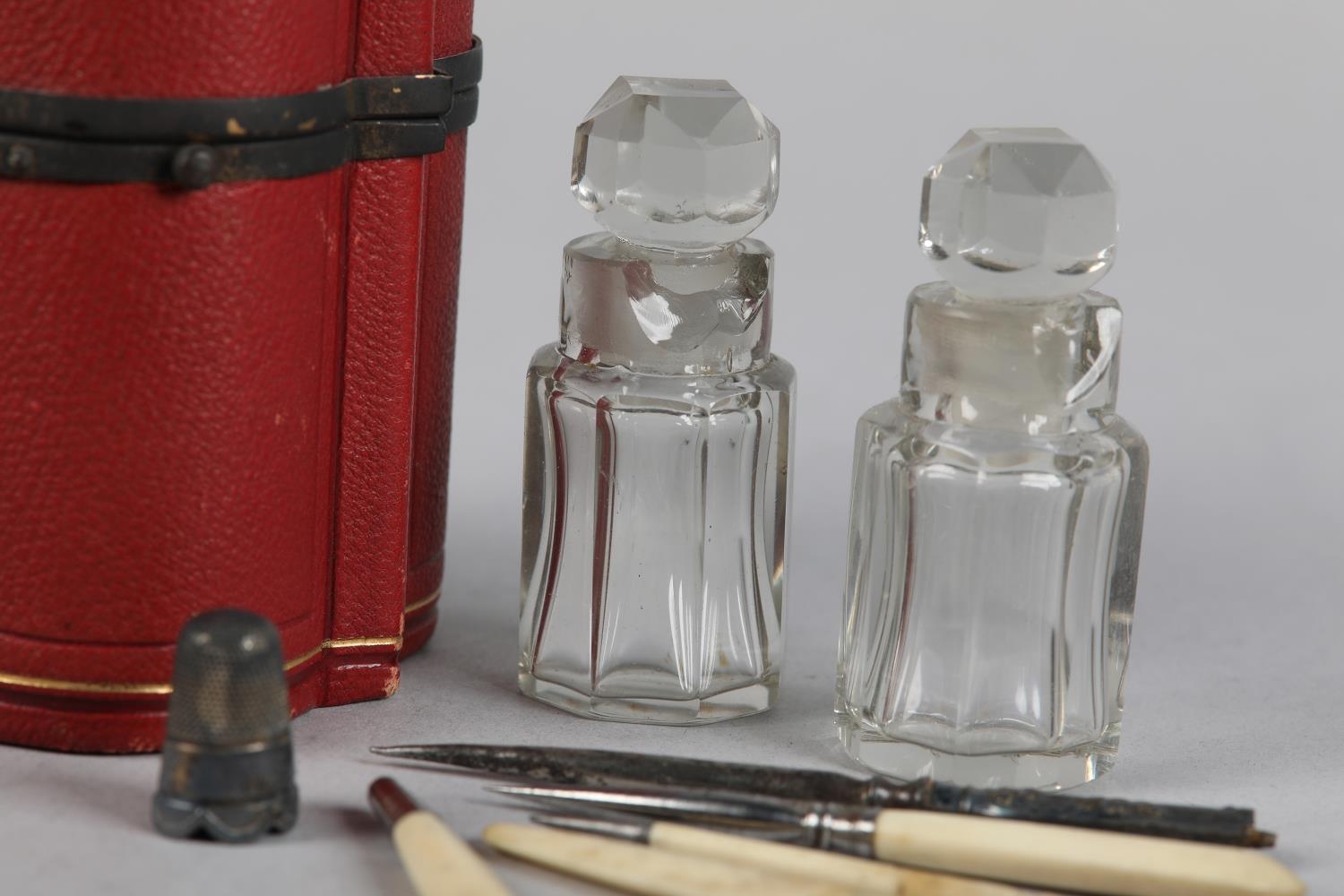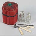 A 19TH CENTURY RED MOROCCO NECESSAIRE of quatrefoil outline, the cover set to the centre with a green 'jewel', the interior lined in purple silk and velvet, fitted with mirror, glass bottles and stoppers, various original and associated implements, 9cm diameter x 12cm high