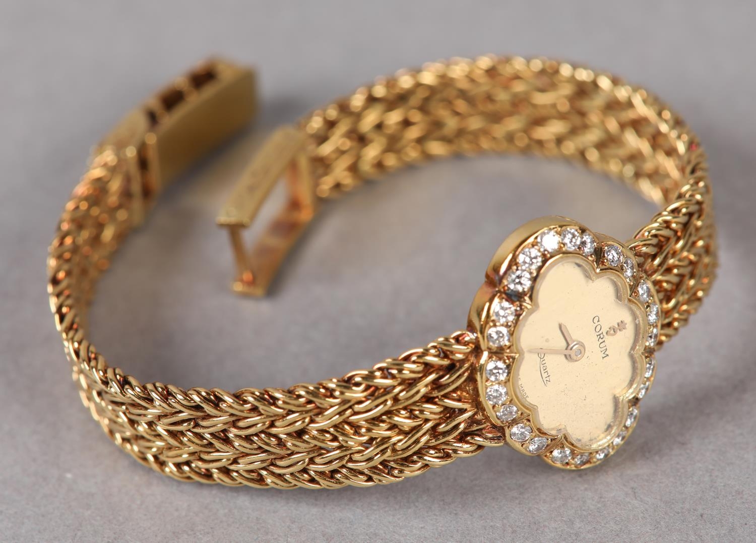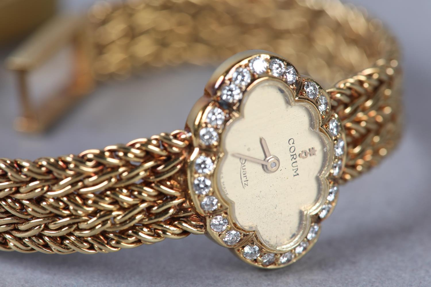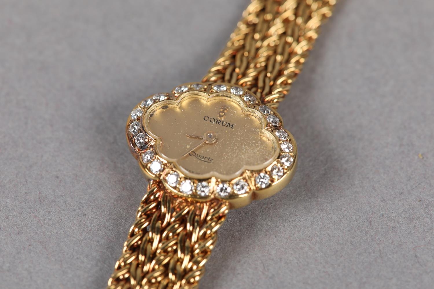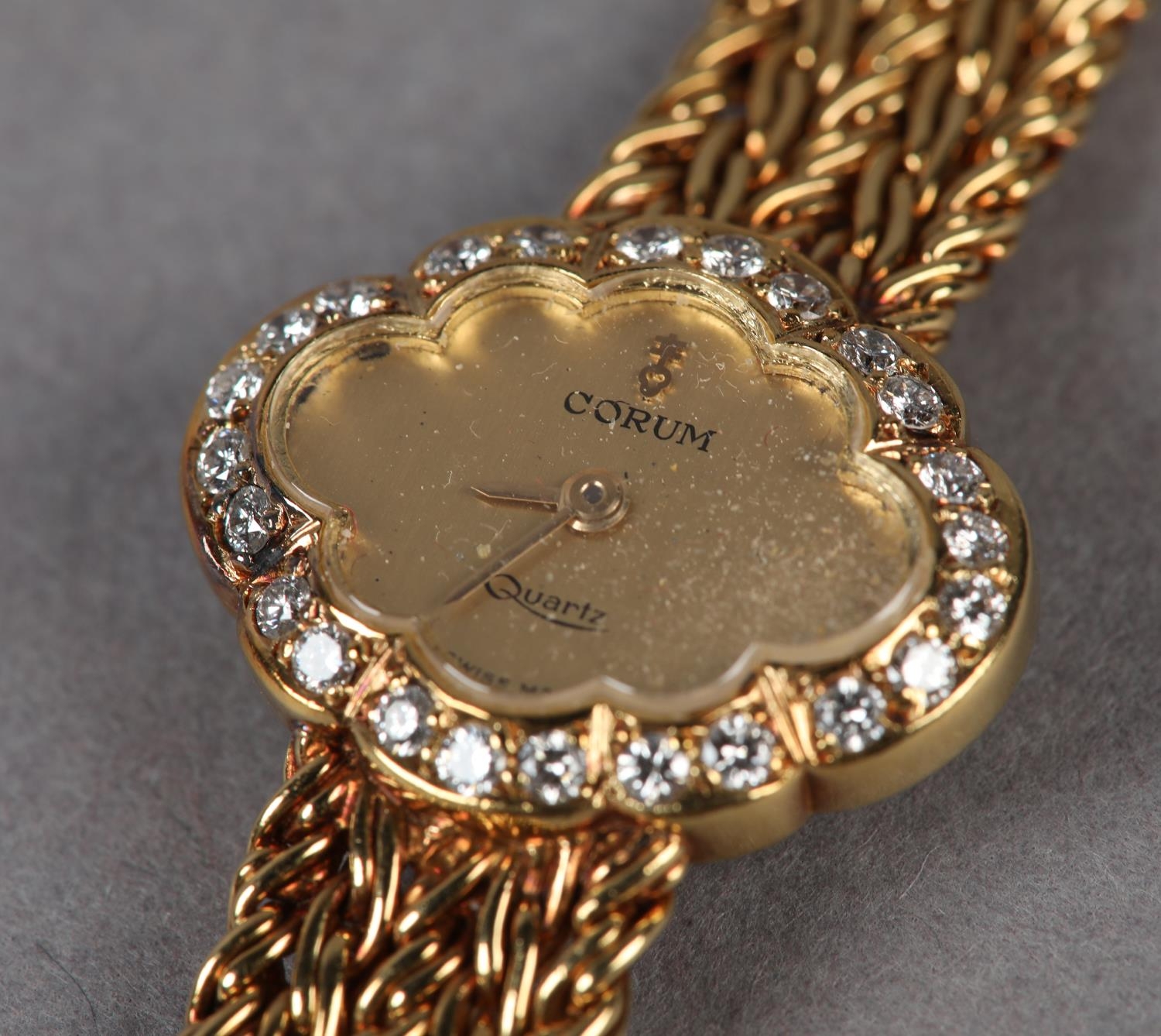 A LADY’S DIAMOND SET COCKTAIL WATCH BY CORUM, c.1995, in 18ct gold, case no. 372 54 65 M41 on the original signed integral Milanese bracelet, quartz movement, matt gilt dial with gilt hands, under an oval bracketed mineral crystal within a corresponding bezel set with brilliant cut diamonds, with original leather wallet and some papers, approximate length 16cm, approximate watch head size 21mm x 17mm, approximate weight of diamonds 0.70ct, total approximate weight 31.8g