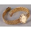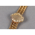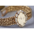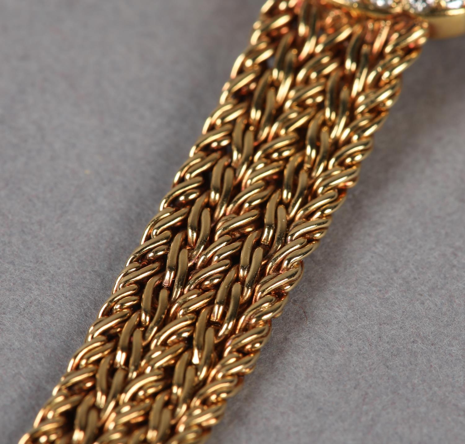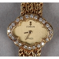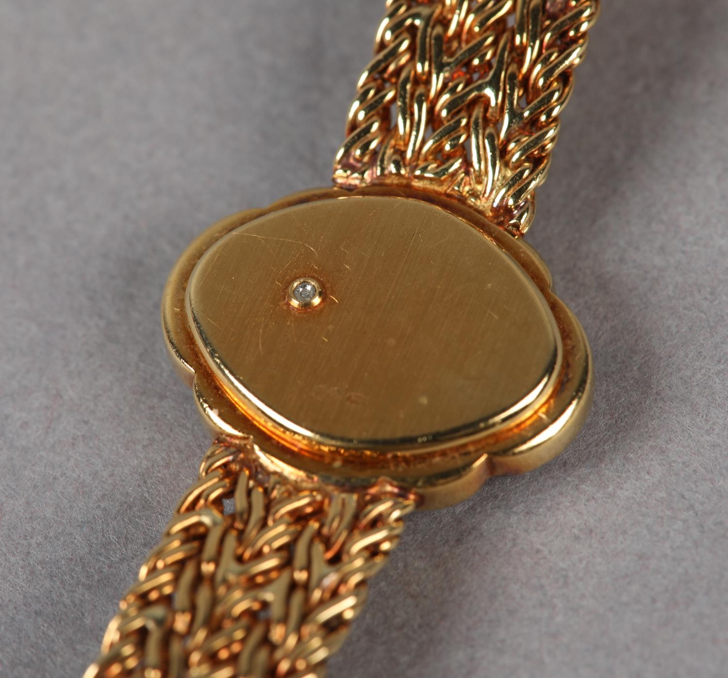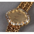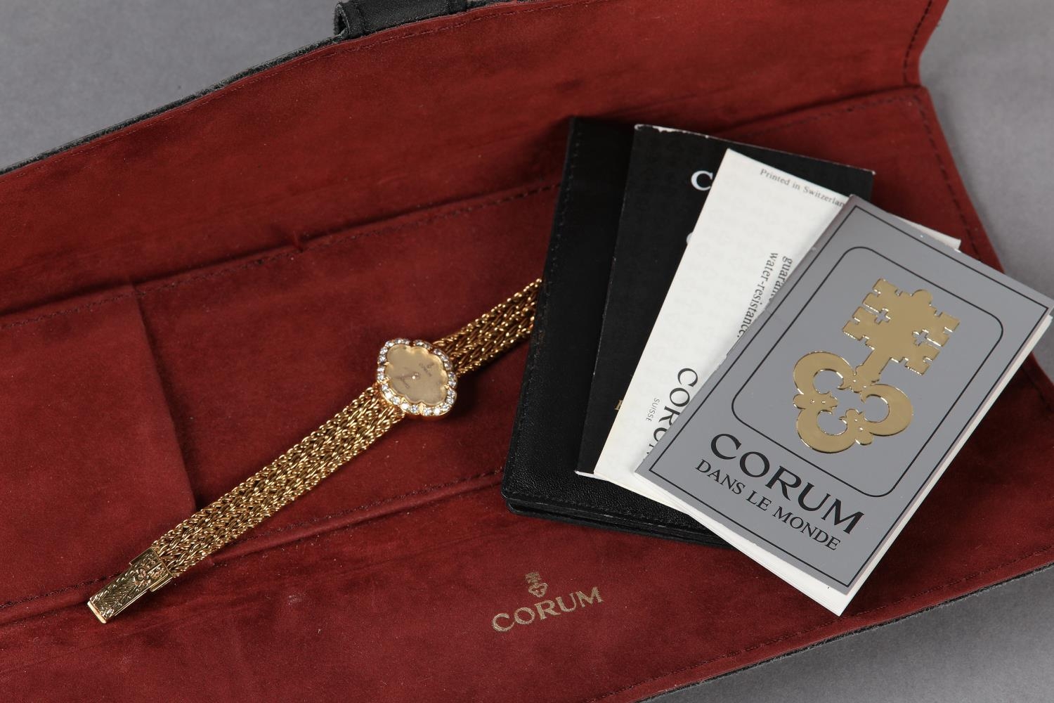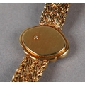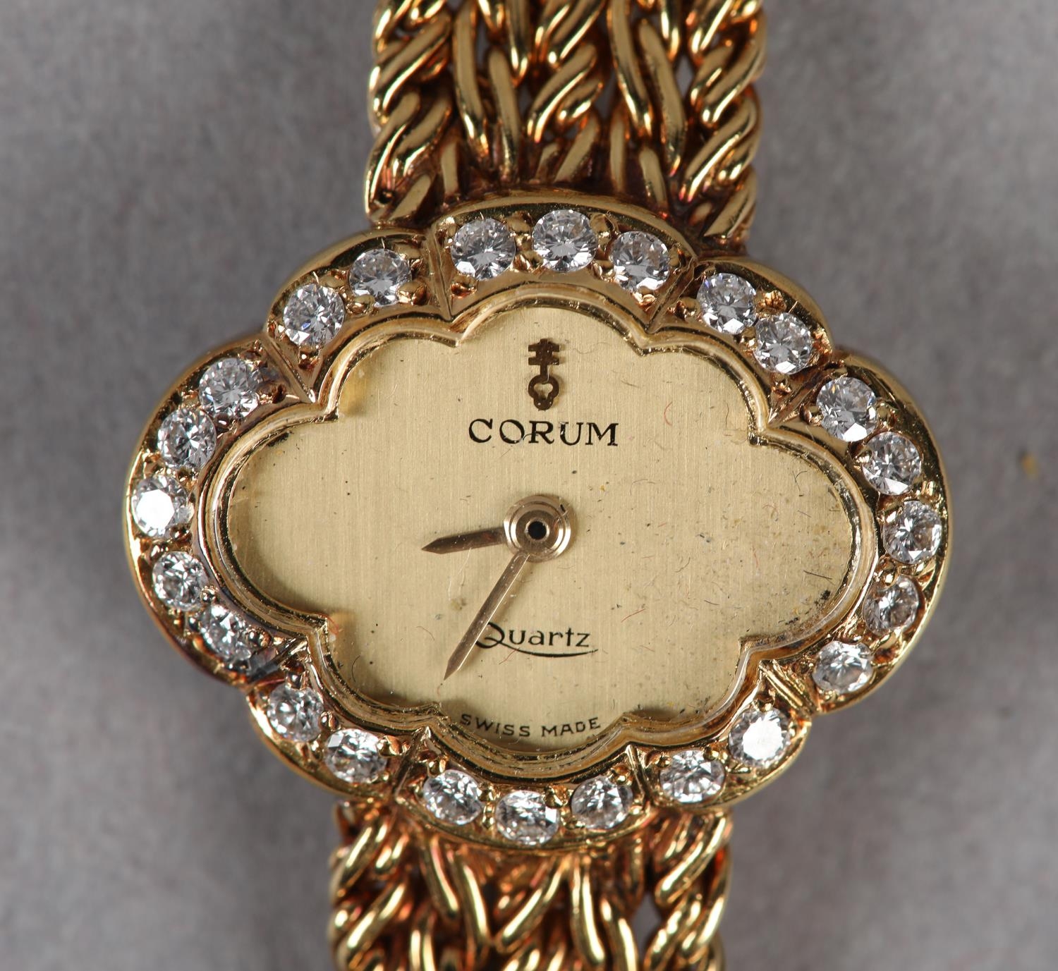 A LADY’S DIAMOND SET COCKTAIL WATCH BY CORUM, c.1995, in 18ct gold, case no. 372 54 65 M41 on the original signed integral Milanese bracelet, quartz movement, matt gilt dial with gilt hands, under an oval bracketed mineral crystal within a corresponding bezel set with brilliant cut diamonds, with original leather wallet and some papers, approximate length 16cm, approximate watch head size 21mm x 17mm, approximate weight of diamonds 0.70ct, total approximate weight 31.8g