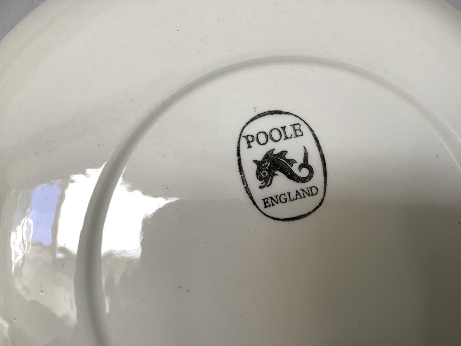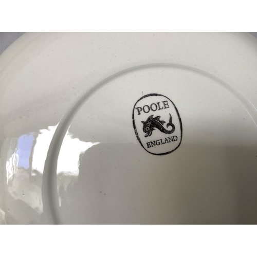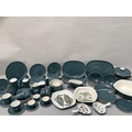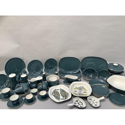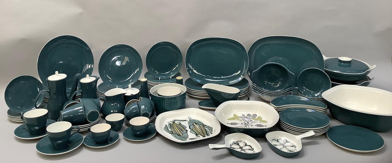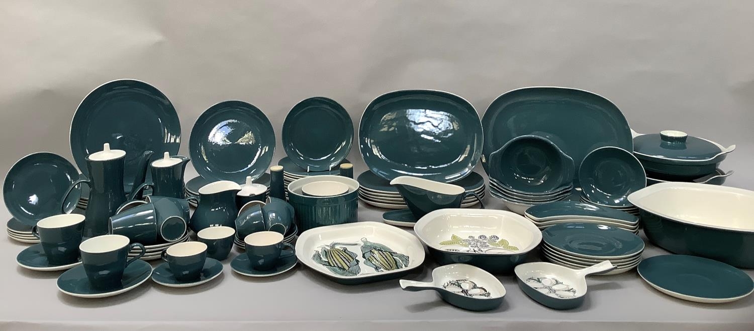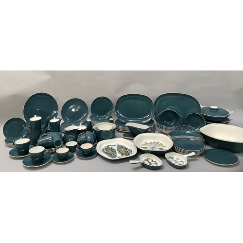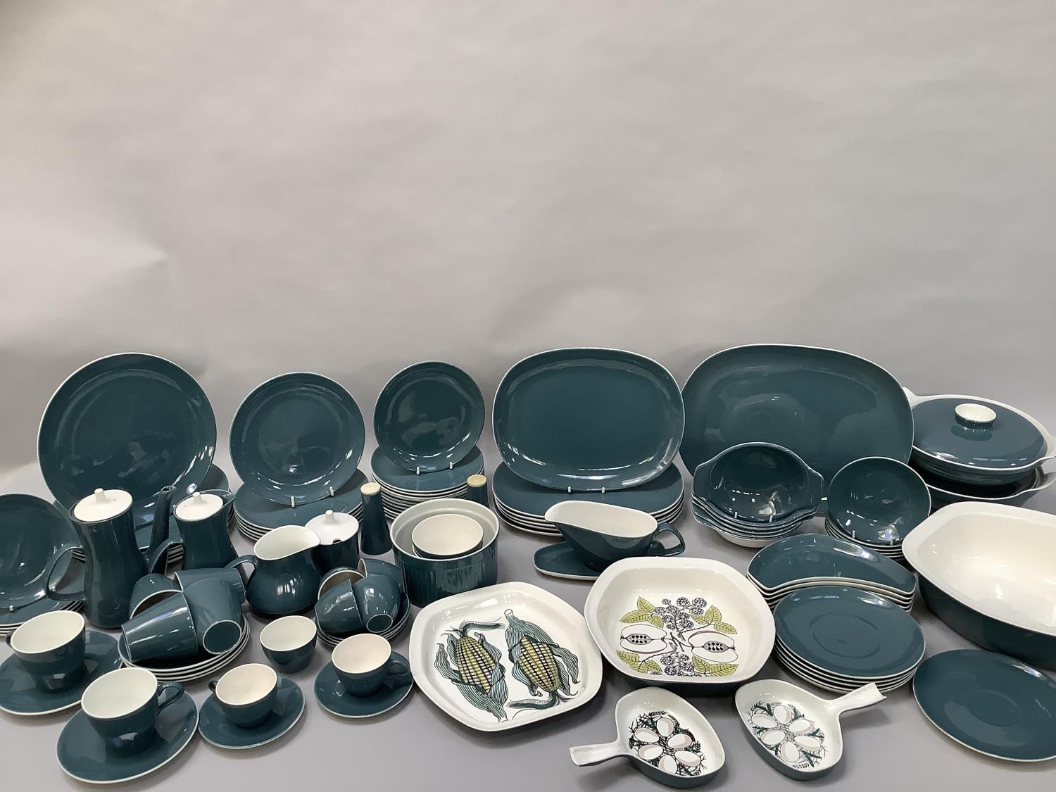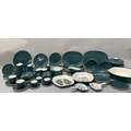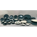 Robert Jefferson for Poole Pottery mid 1950s, A Blue Moon dinner and tea service, seven dinner plates, six large oblong plates, six salad plates, twelve dessert plates, five tea plates, six kidney shaped side plates, six soup bowls and saucers, six dessert dishes, meat dish, gravy boat and stand, two two-handled tureens and covers, souffle dish, large serving bowl, medium serving bowl and serving plate, pair of single handled egg dishes, coffee pot, seven coffee cups and six saucers, teapot, six tea cups and six saucers, milk jug, two sugar bowls, preserve pot and cover, salt and pepper