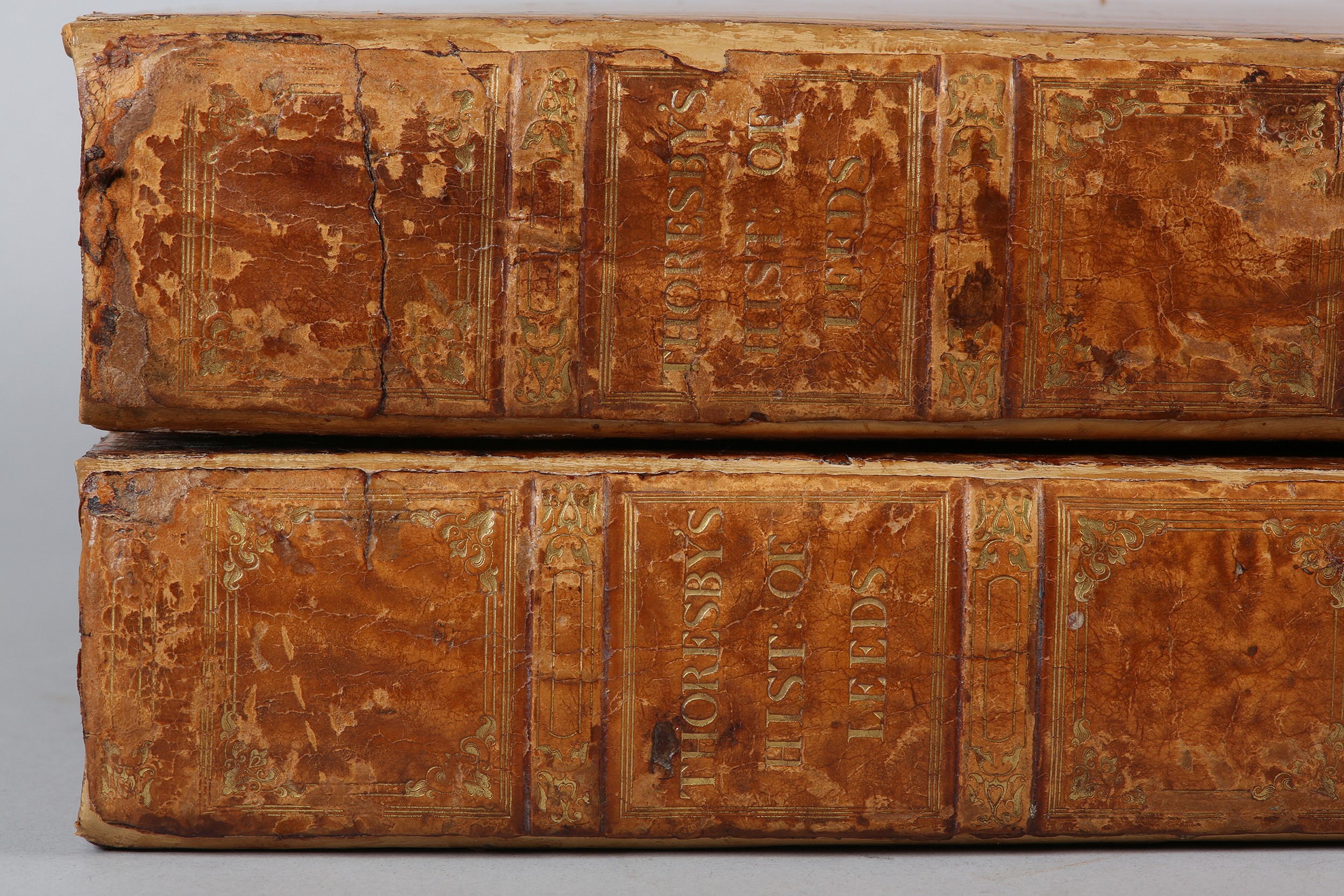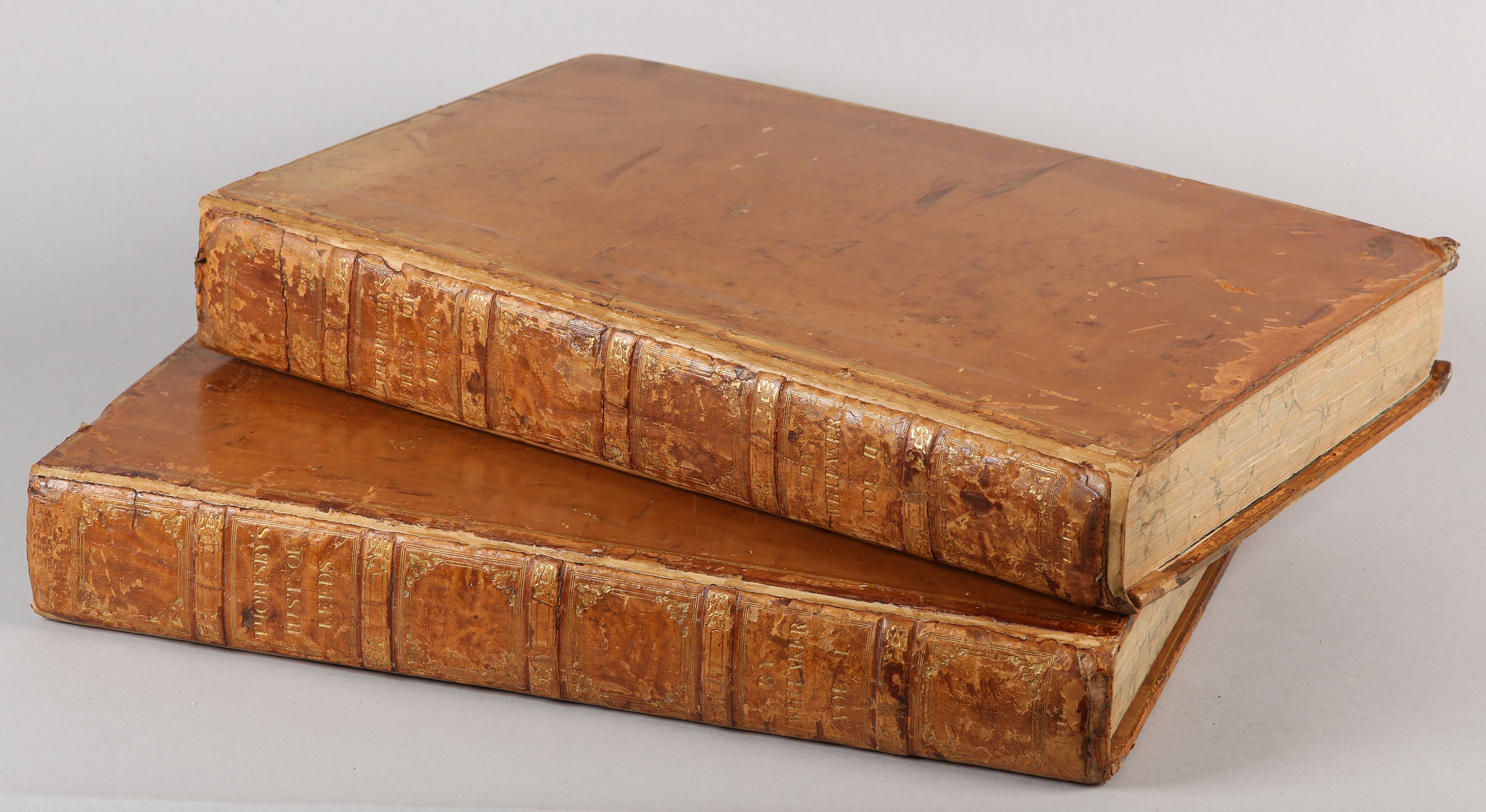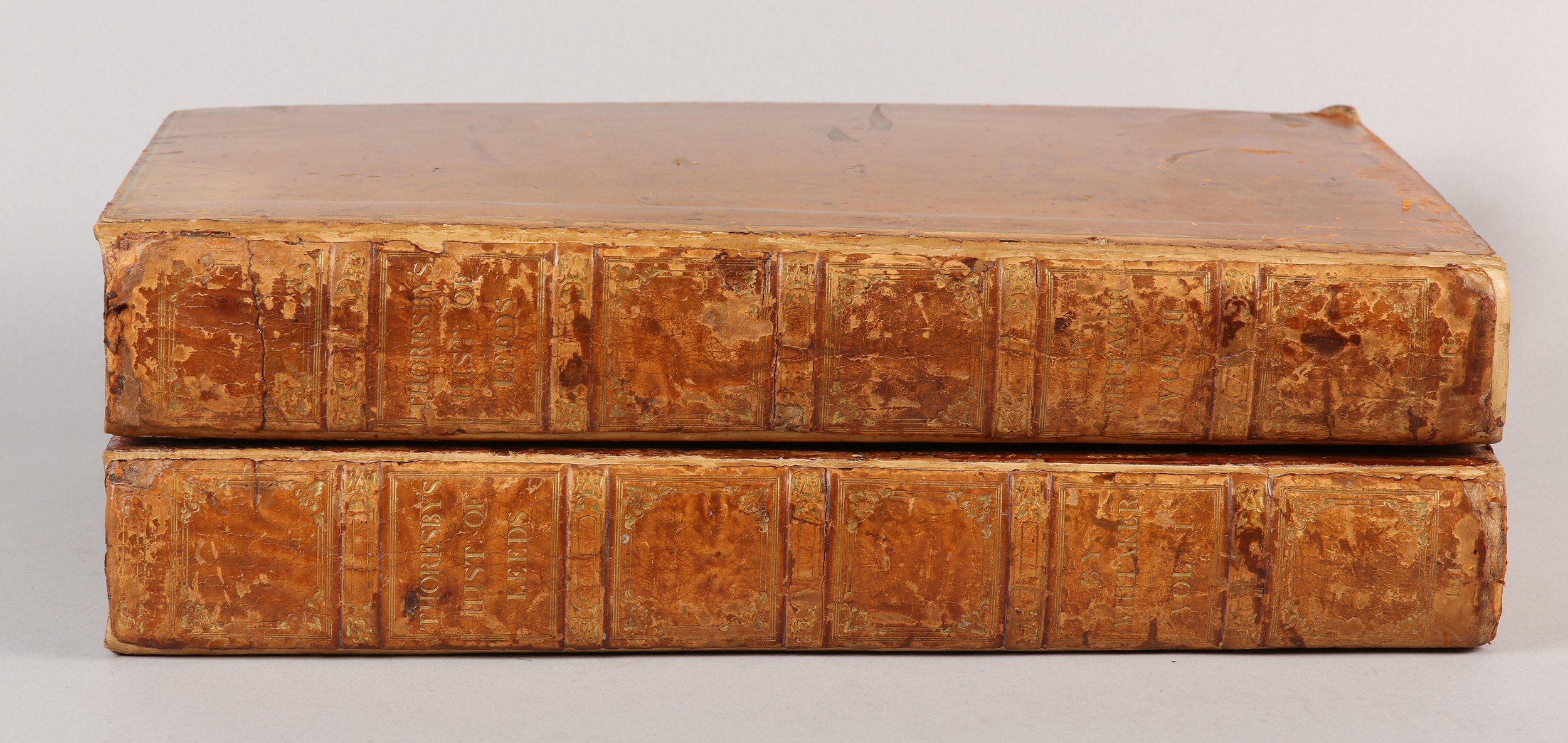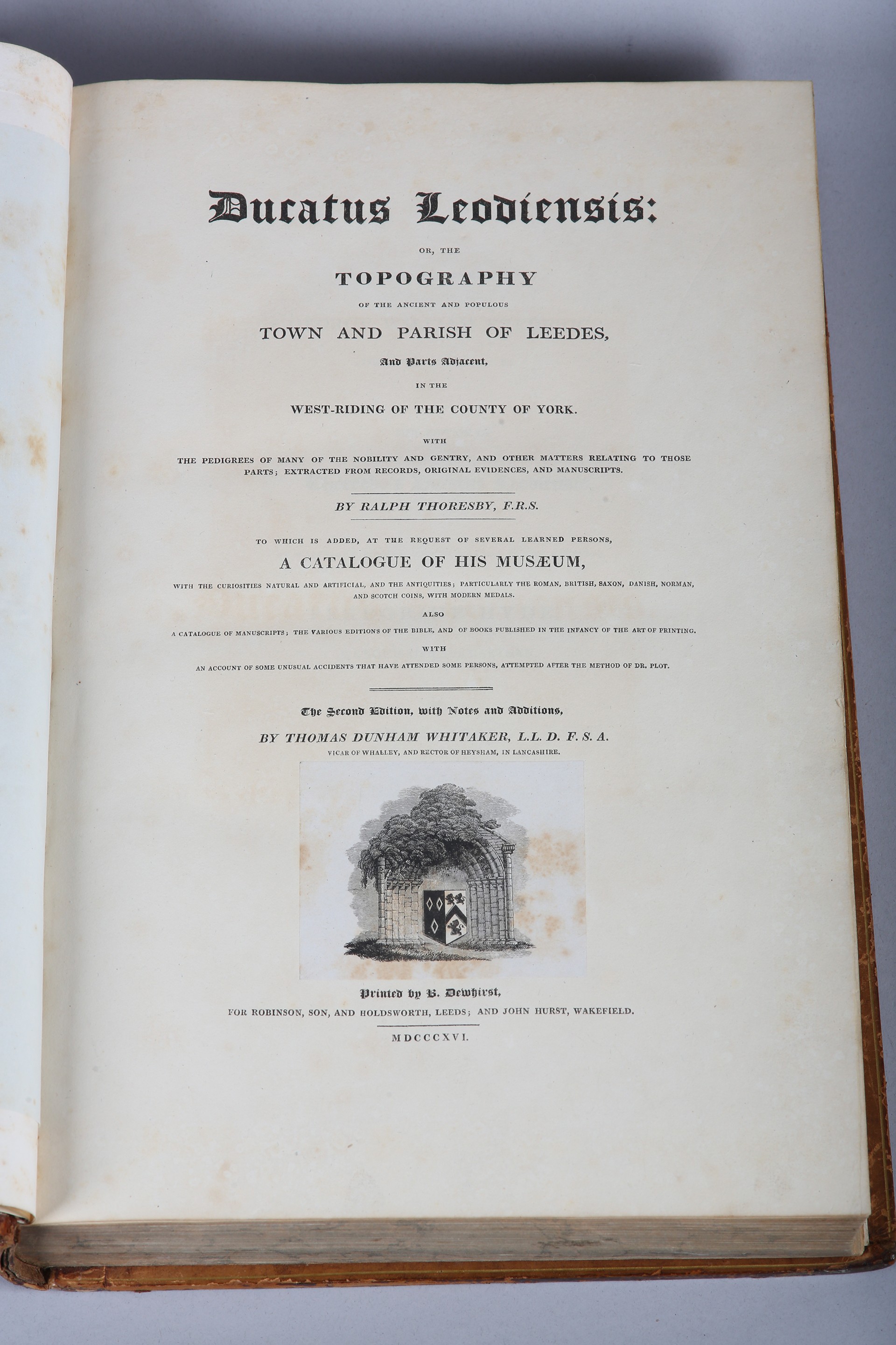 WHITAKER, THOMAS DUNHAM - RALPH THORESBY'S HISTORY OF LEEDS, in 2 vols, printed Robinson, Son & Holdsworth 1816, 2nd edition, large paper edition, elephant folio, engr. illus. to frontispiece and vignette to title page, illus. throughout full calf with gilt dentelles, marbled end papers