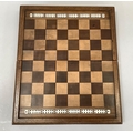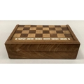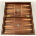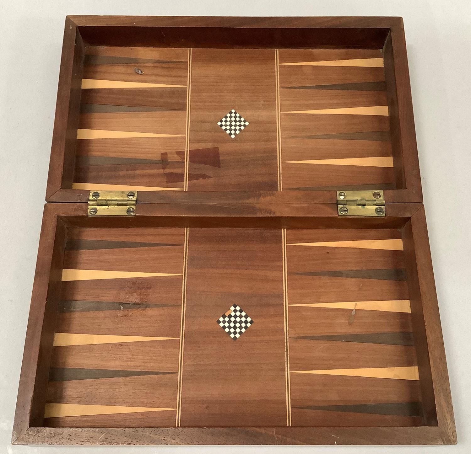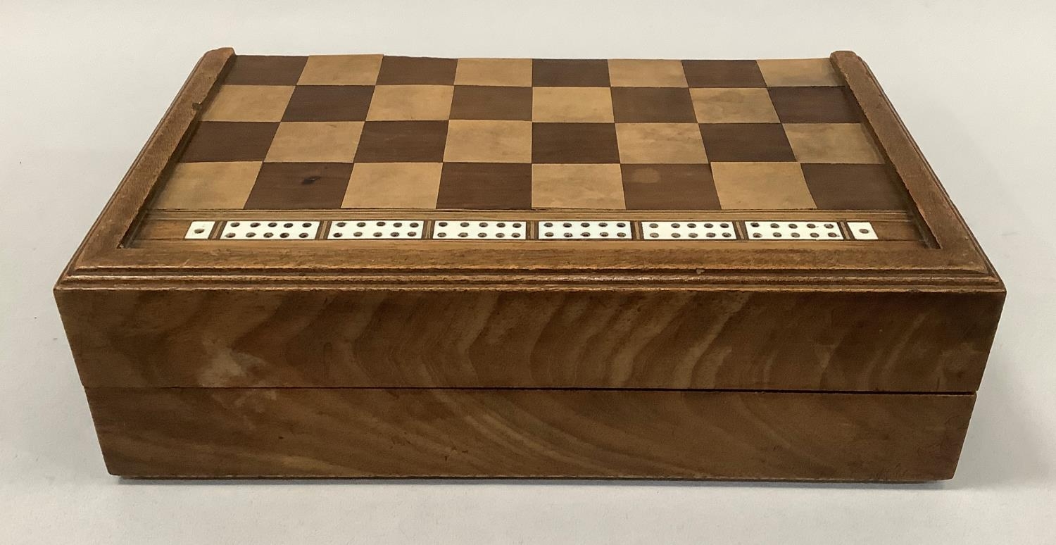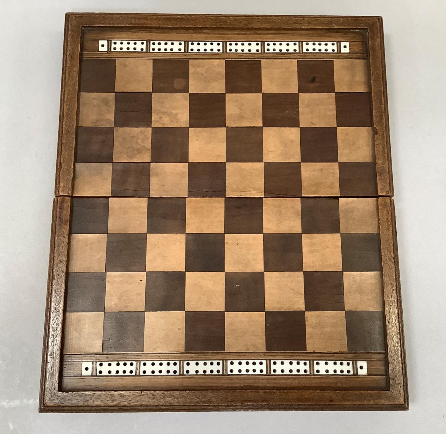 AN EARLY 20TH CENTURY WALNUT AND PEARWOOD GAMES BOX, the exterior with chequered board, inlaid with ivory cribbage to either side, the interior inlaid for backgammon 25cm wide x 15cm closed, 30cm open, ivory exemption certificate no. SKSW22SV