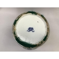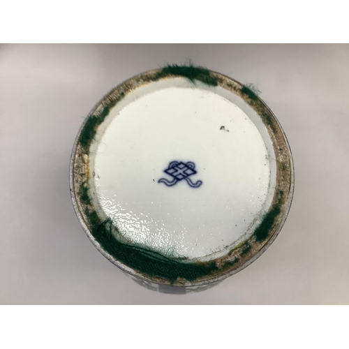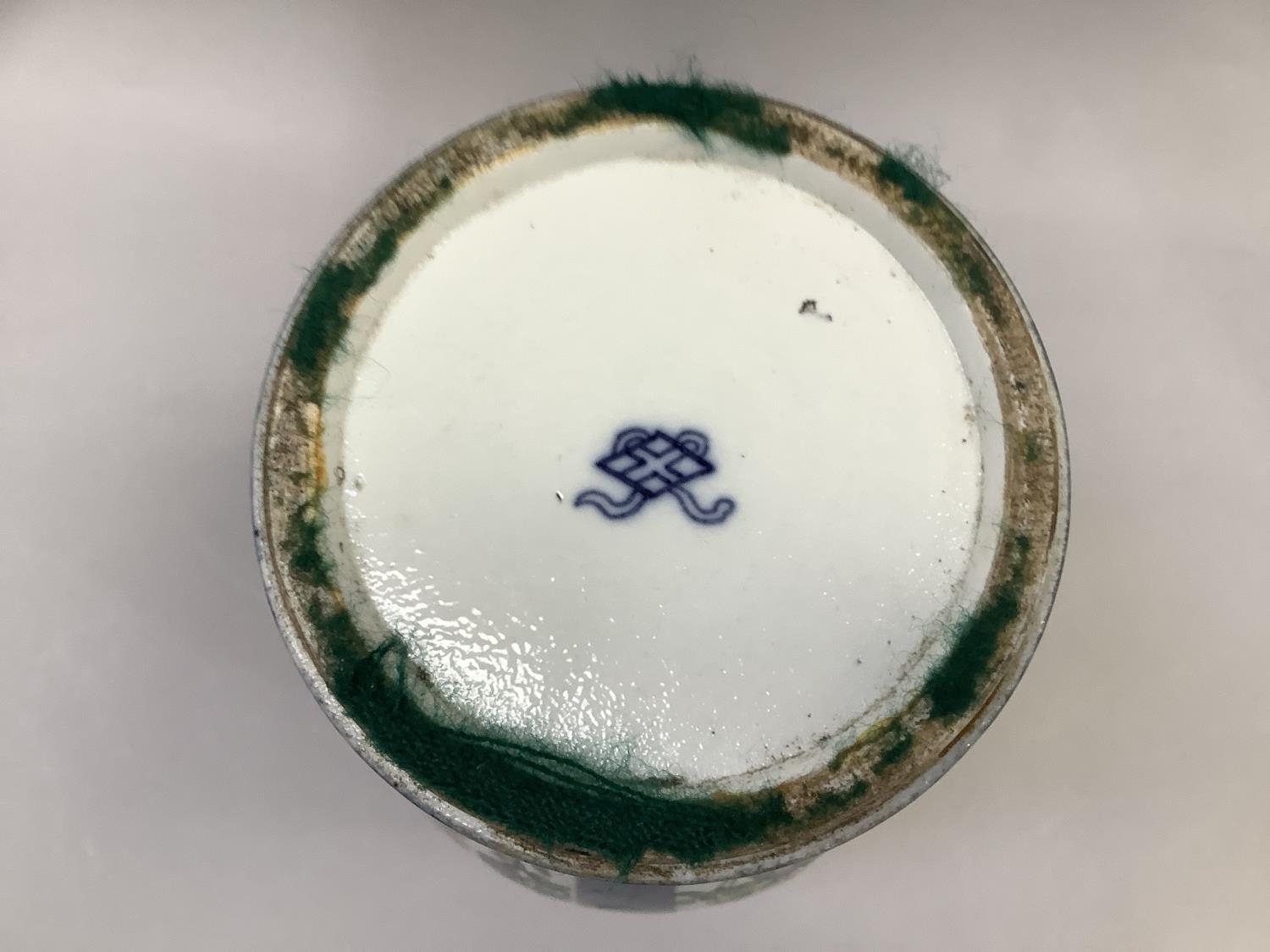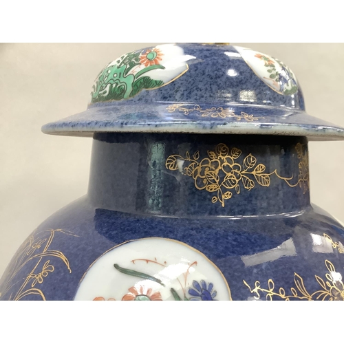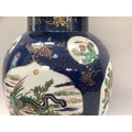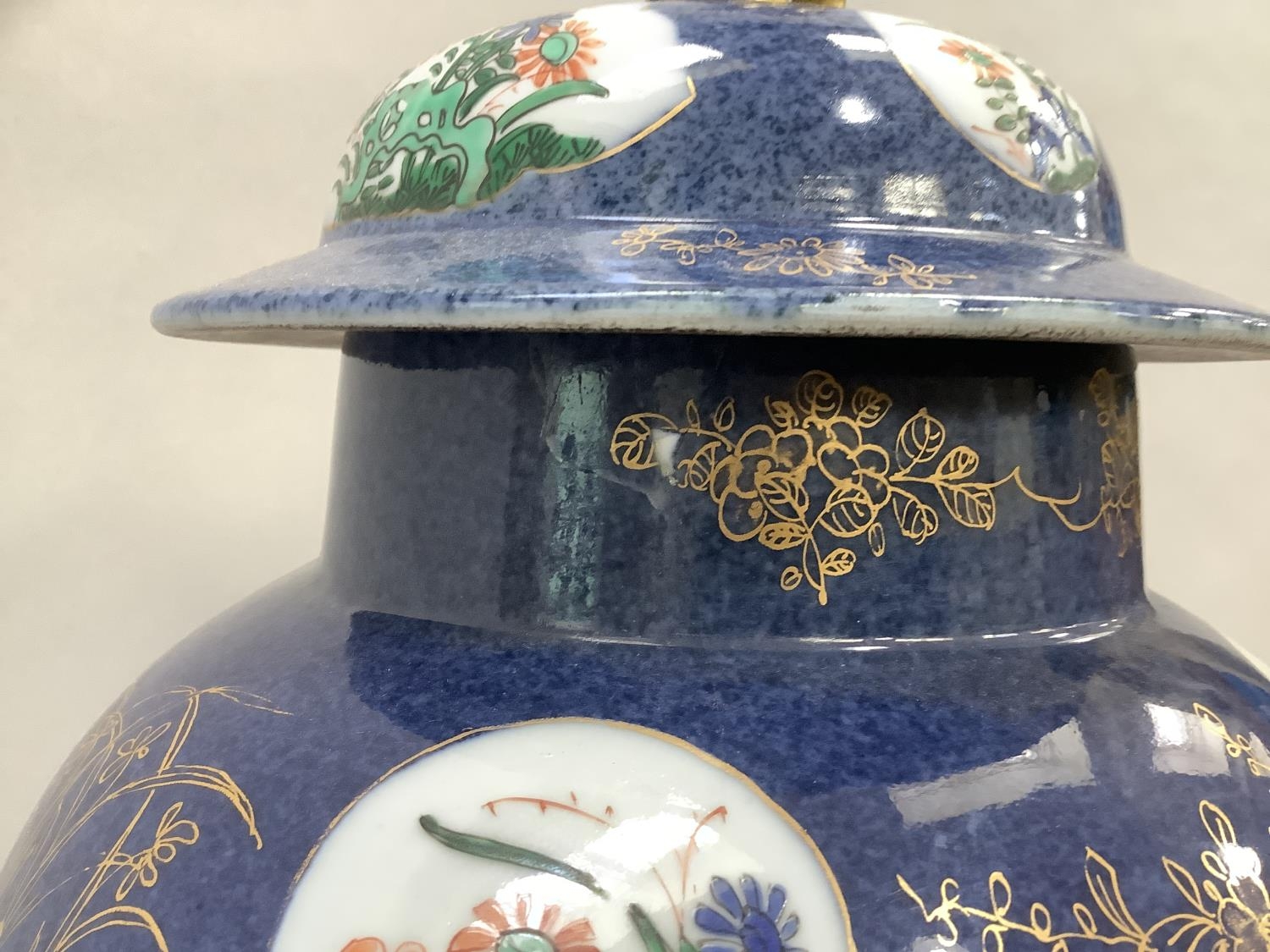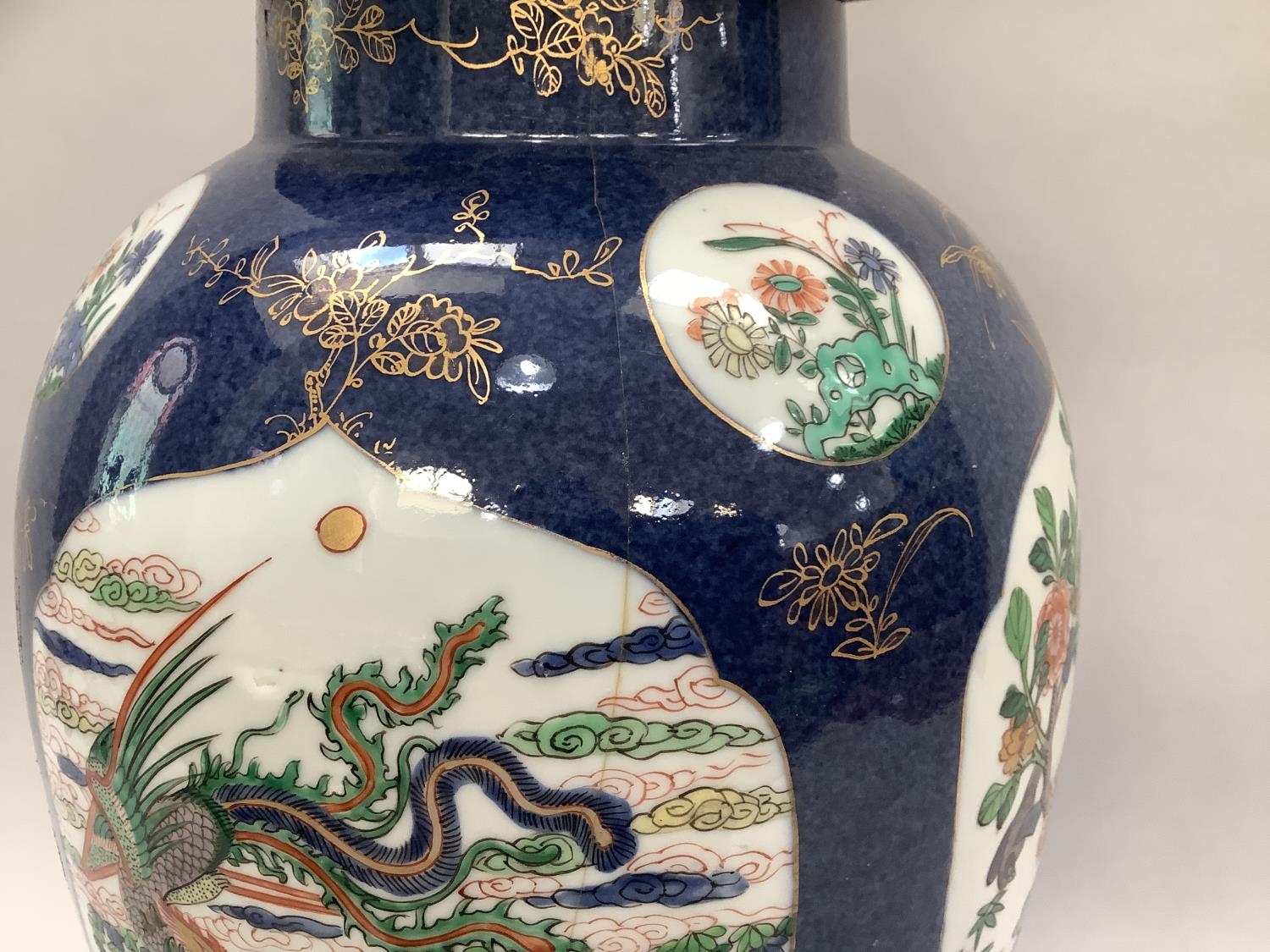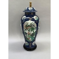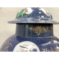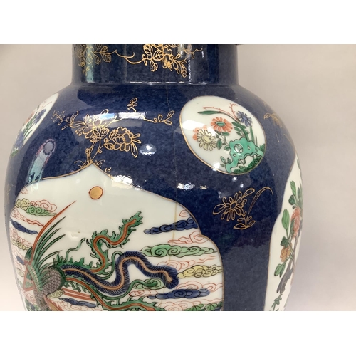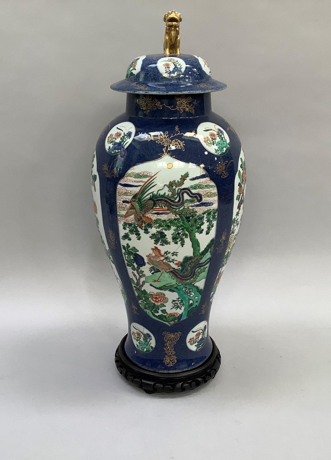 A 19th century Chinese famille verte vase and cover with FO dog finial, enamelled with rocks issuing peonies and exotic birds on a blue mottled ground with vignettes of flowers, 54cm high approx. together with a hardwood stand, the vase extensively damaged and repaired, underglaze blue painted knot like motif to underside