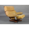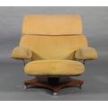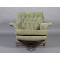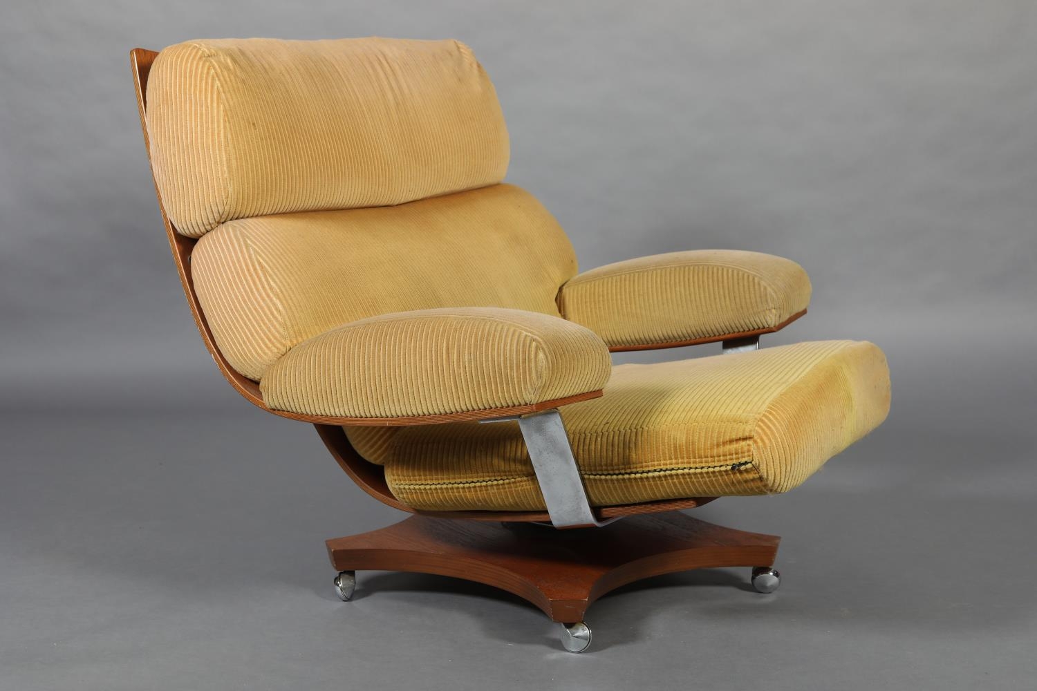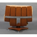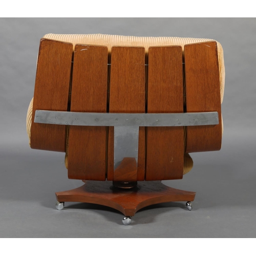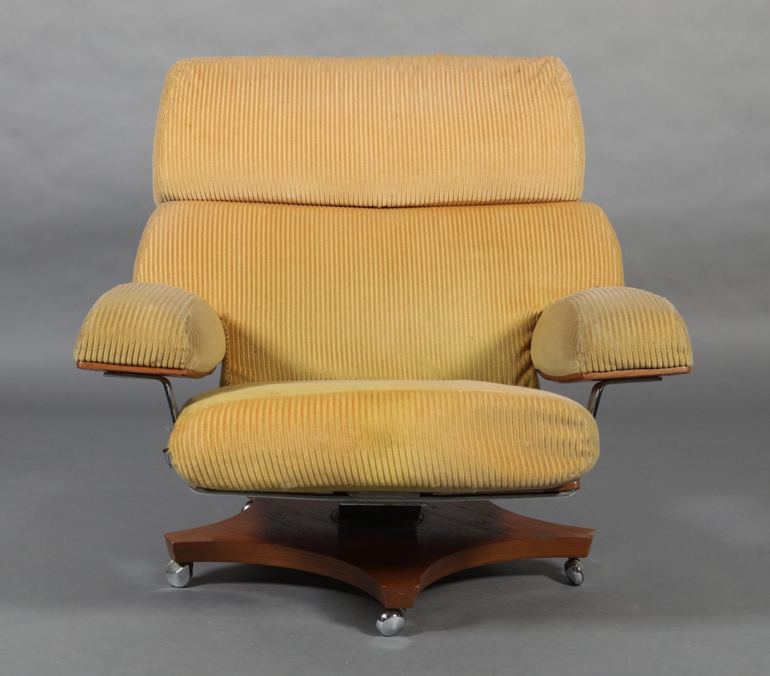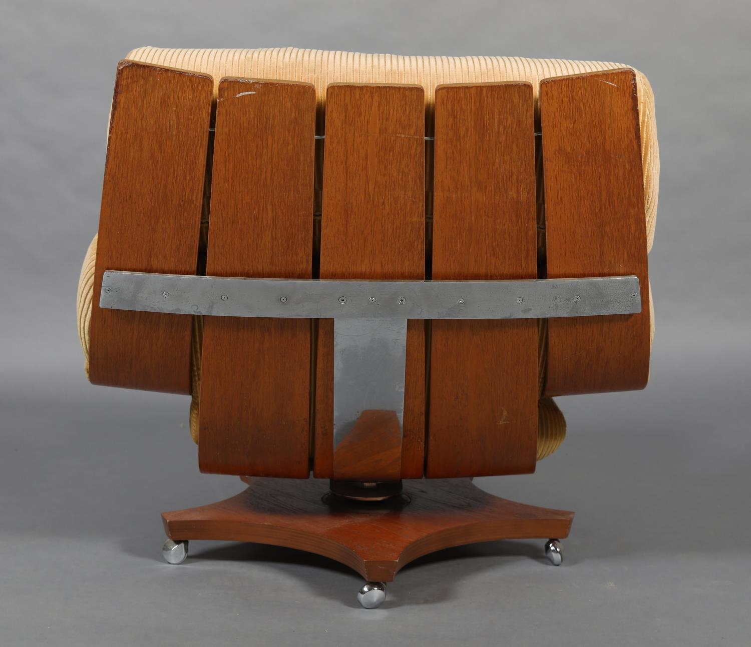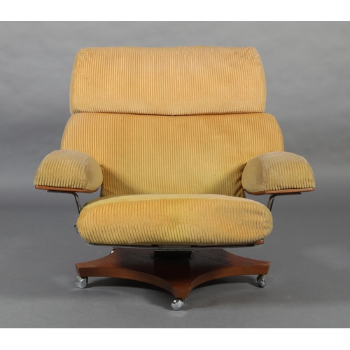 G-Plan Housemaster 6250 swivel armchair, 1960s, teak slatted and polished steel frame, the arms, back and seat cushions upholstered in butterscotch corduroy