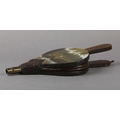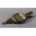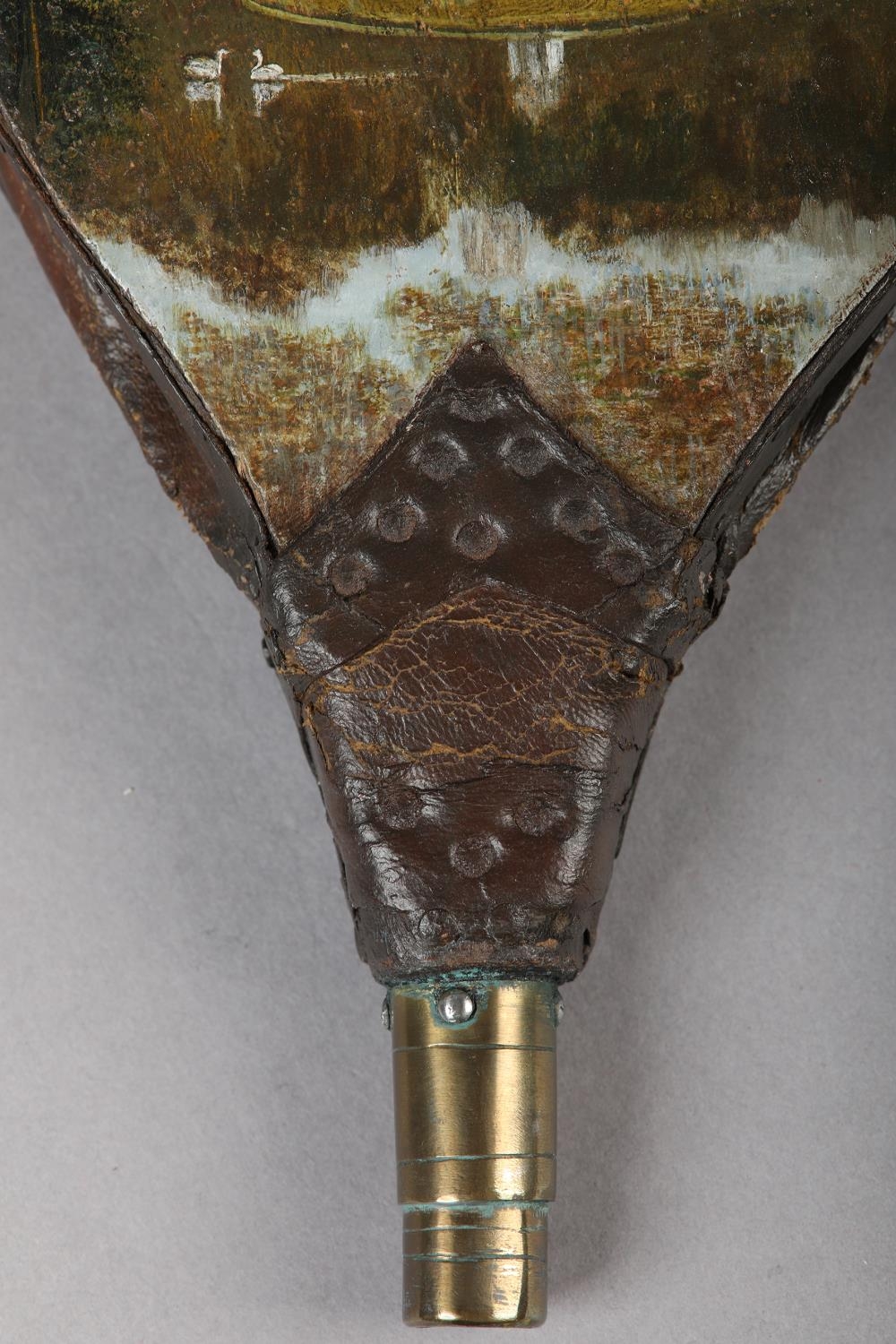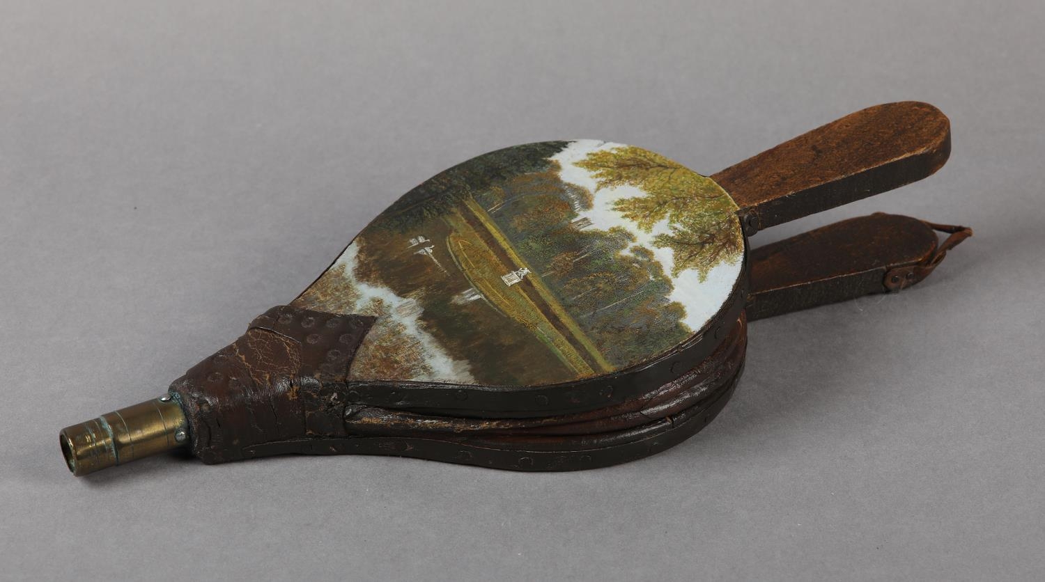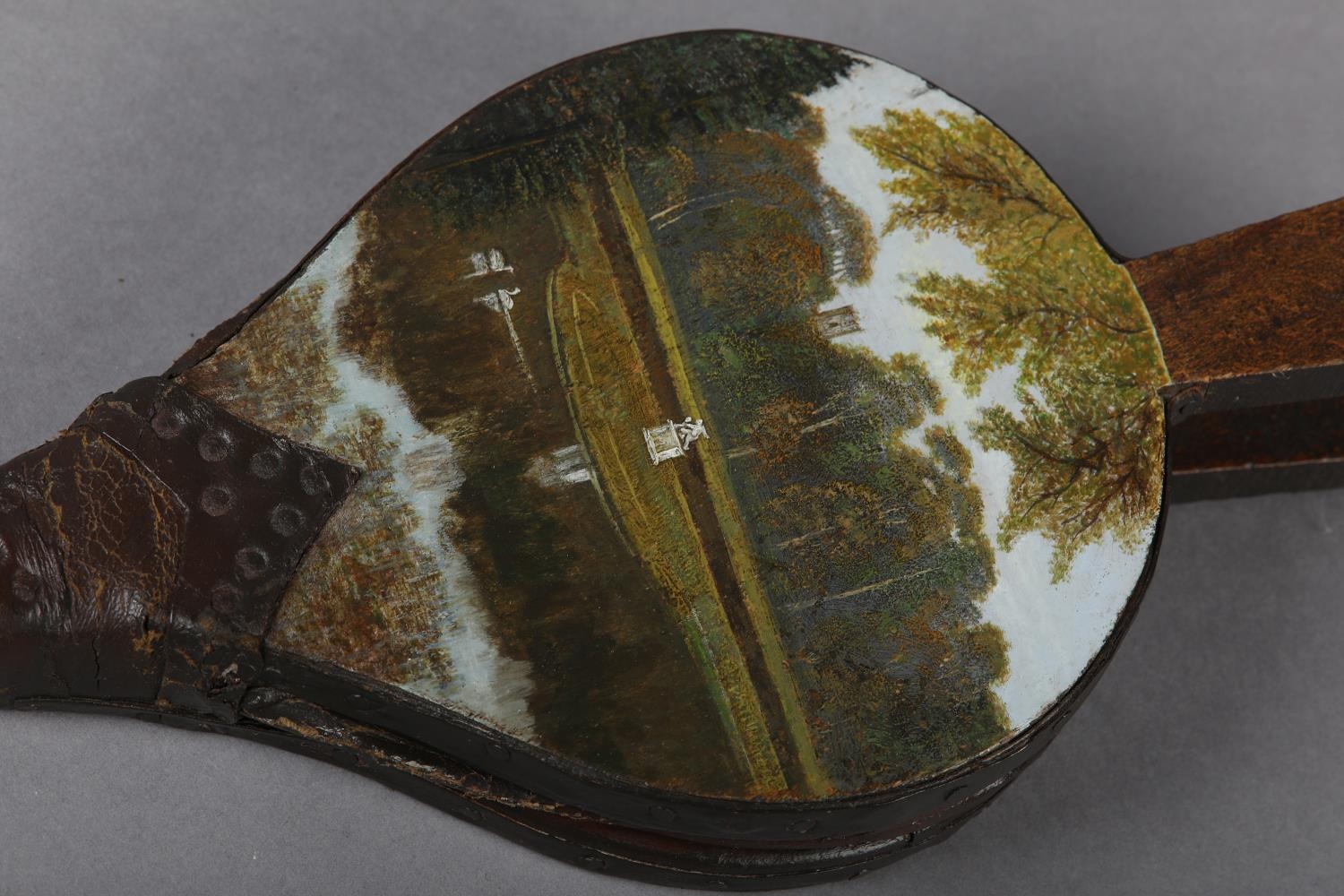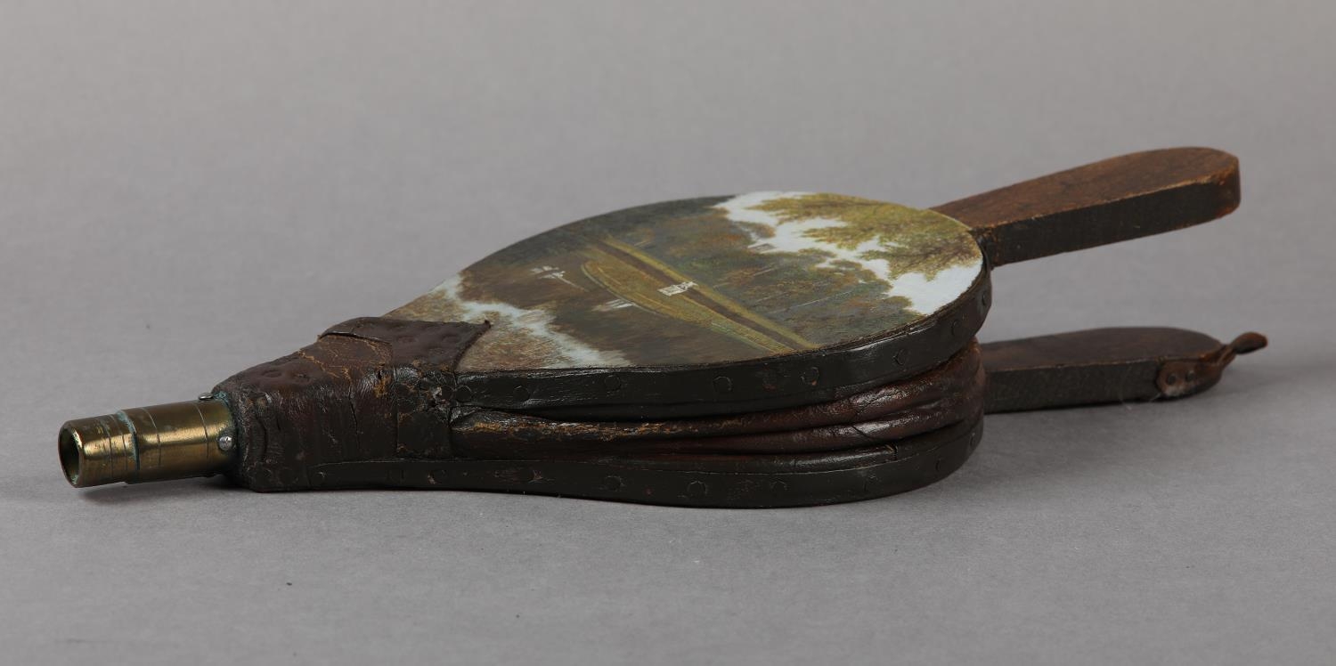 A PAIR OF VICTORIAN BELLOWS, painted to the panel with a view of Studley Royal Water Garden, 33.5cm long