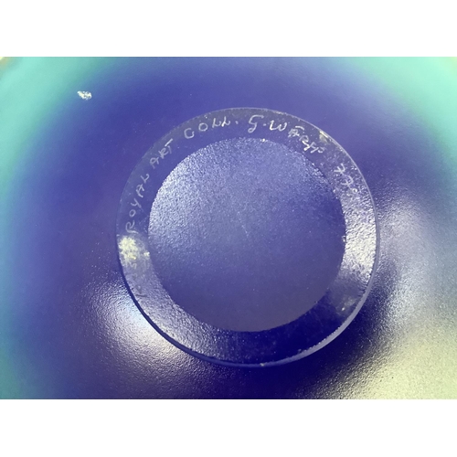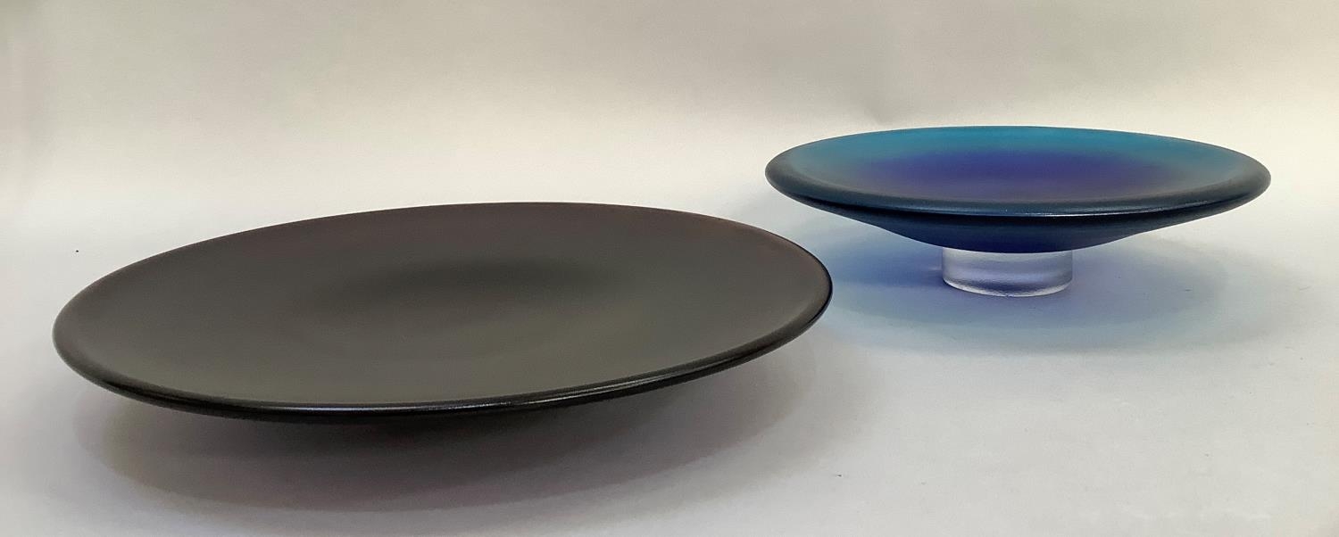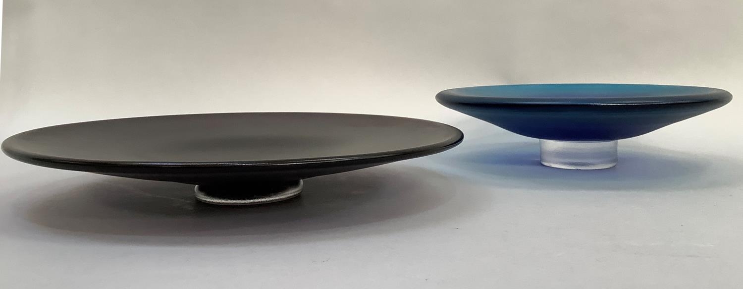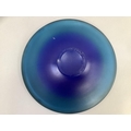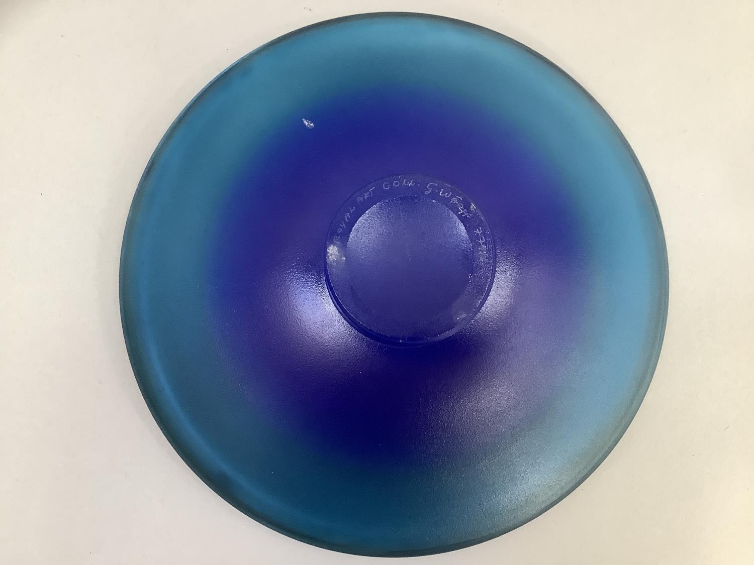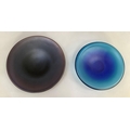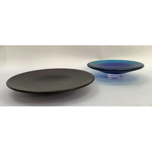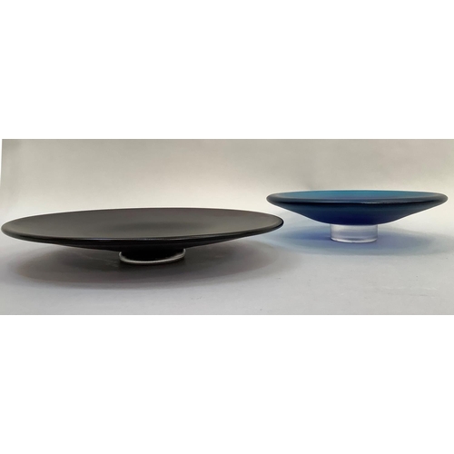 Goran Worff for Kosta Royal Art Collection, A blue acid finished textured glass comport, on pedestal foot, signed and no. G Warff, 26.5cm diameter x 7.5cm high, together with an amethyst glass comport of similar design, 32.5cm x 4.75cm high (2)