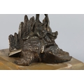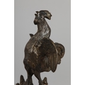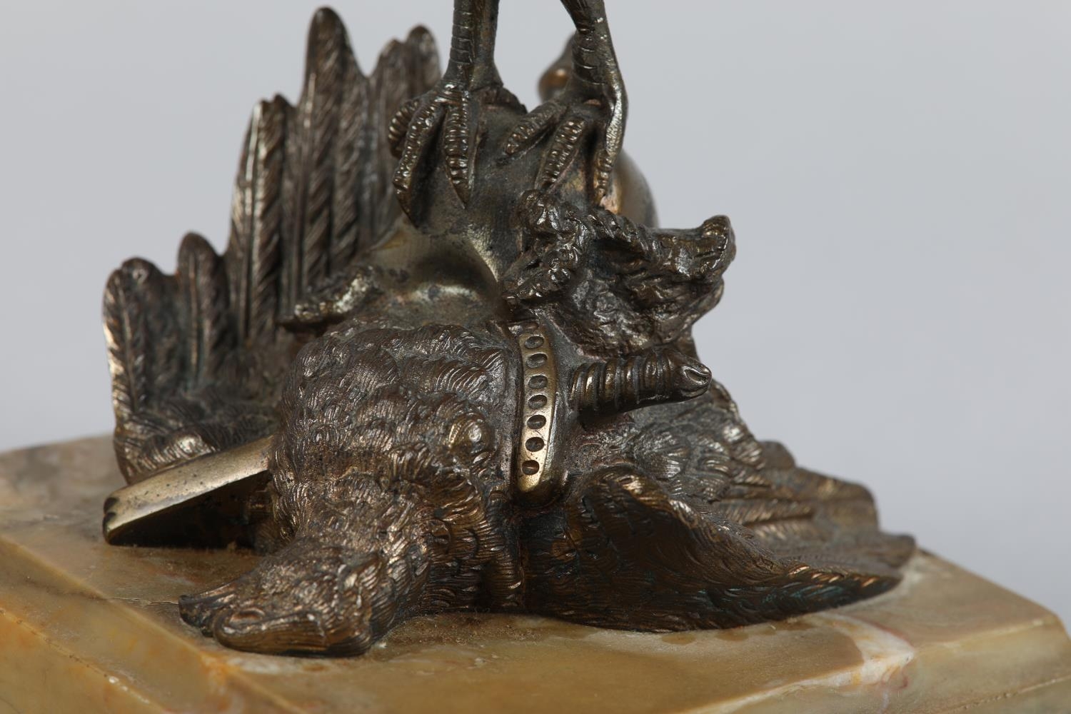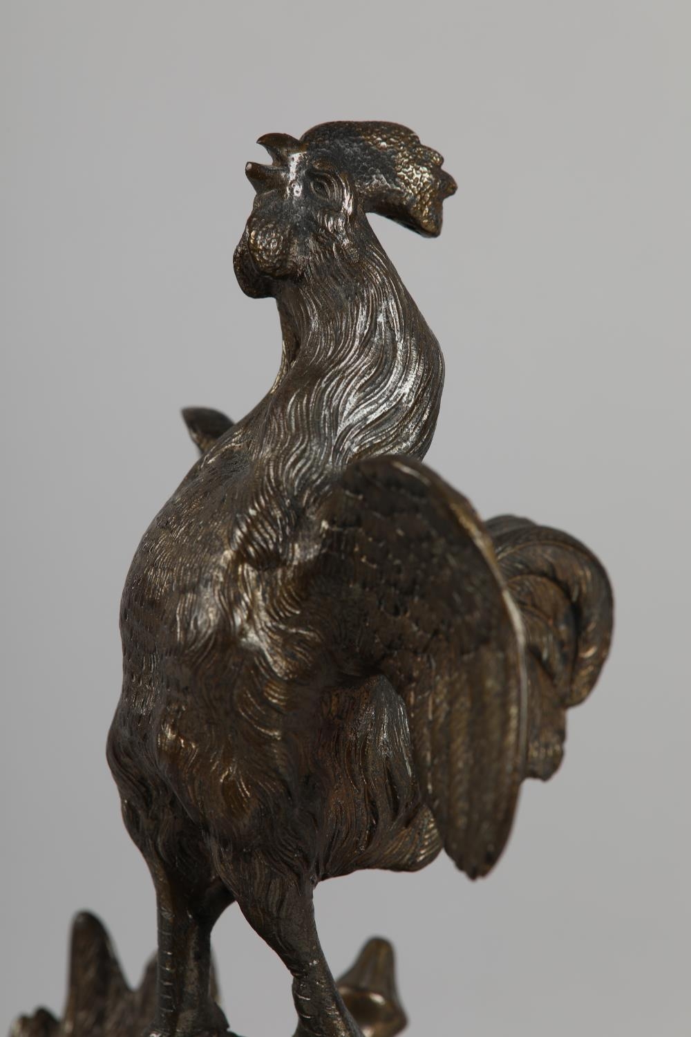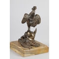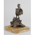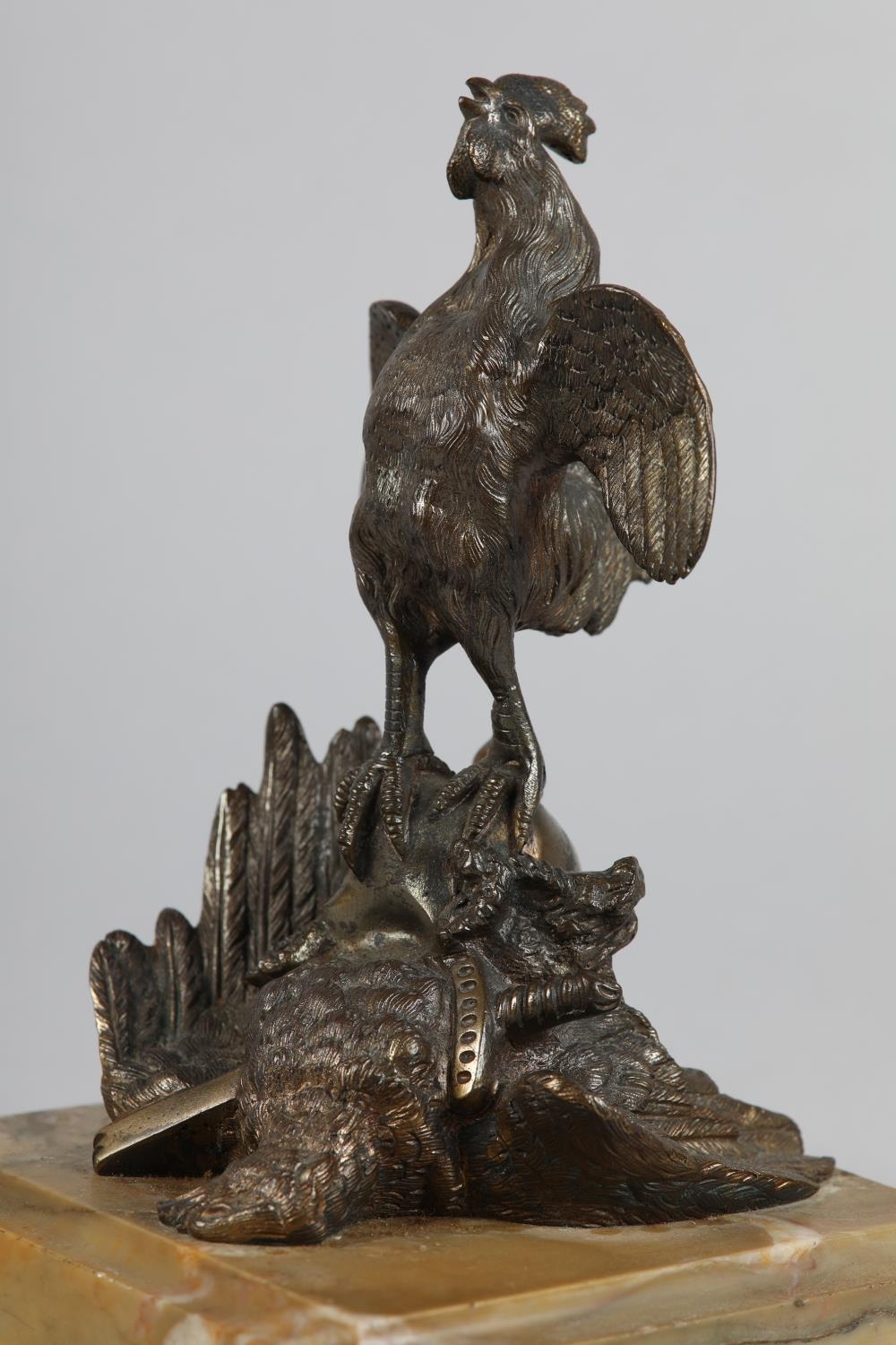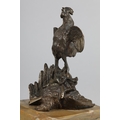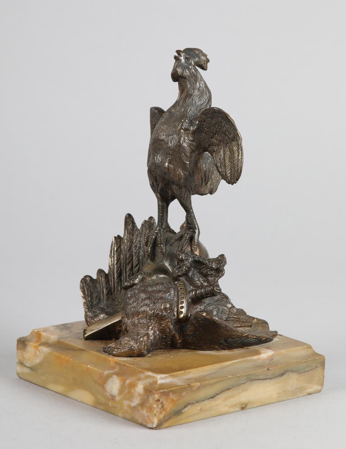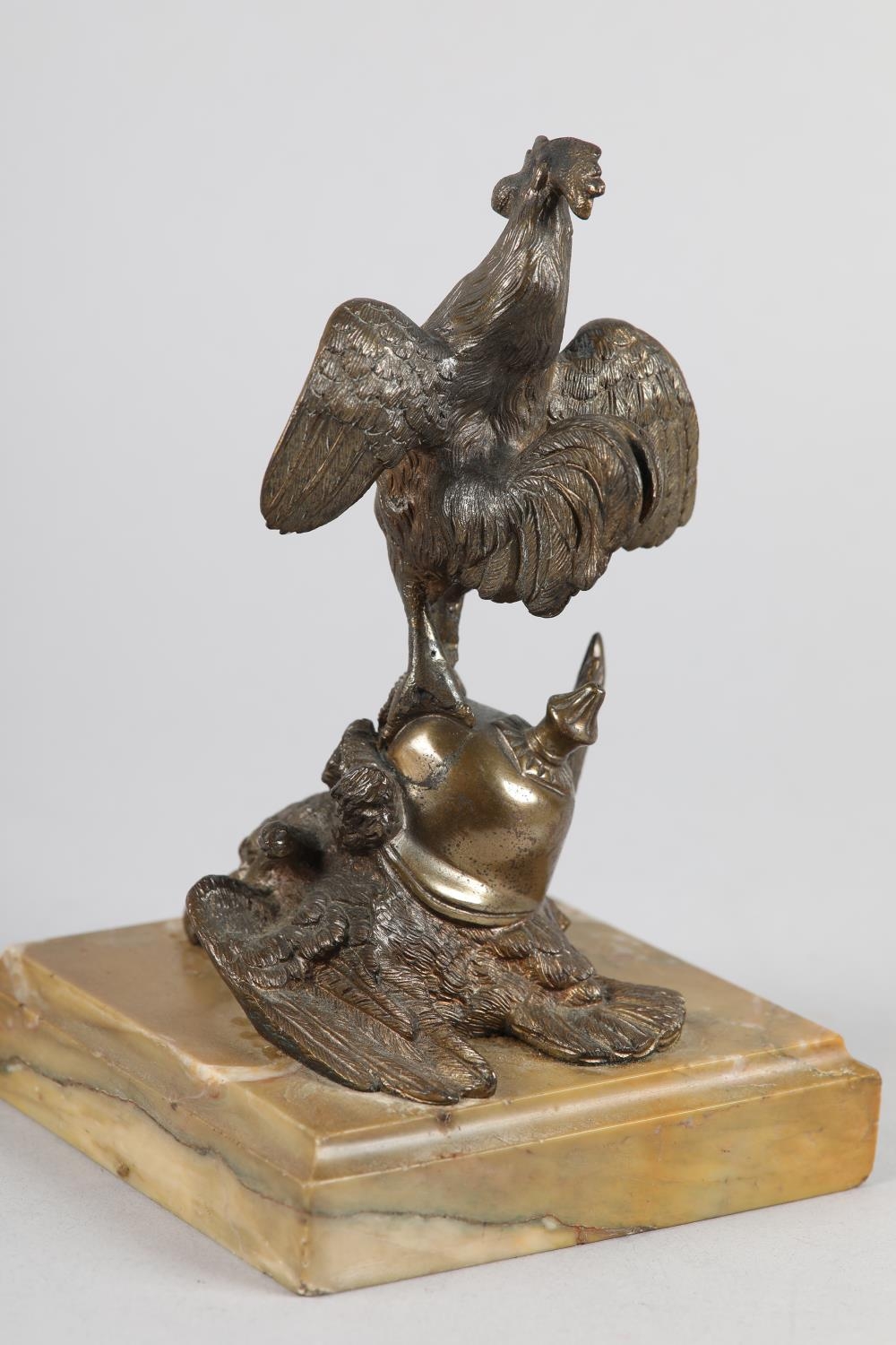 A GILDED BRONZE SCULPTURE OF A COCKEREL standing on a Prussian helmet and eagle with sword plunged through its chest, on a square marble base, 19.5cm high, probably French late 19th century