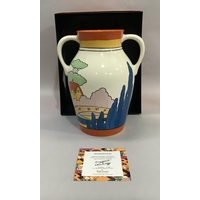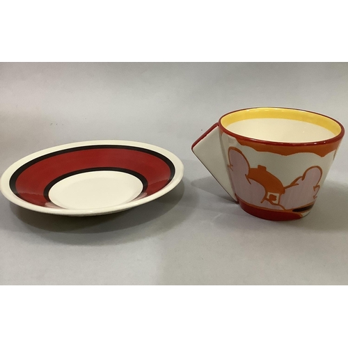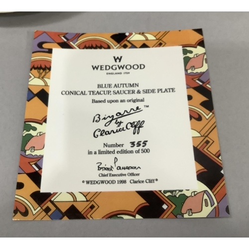A Wedgwood Bizarre by Clarice Cliff Blue Autumn conical teacup, saucer and side plate, no. 355 of 500, with certificate and original packaging
