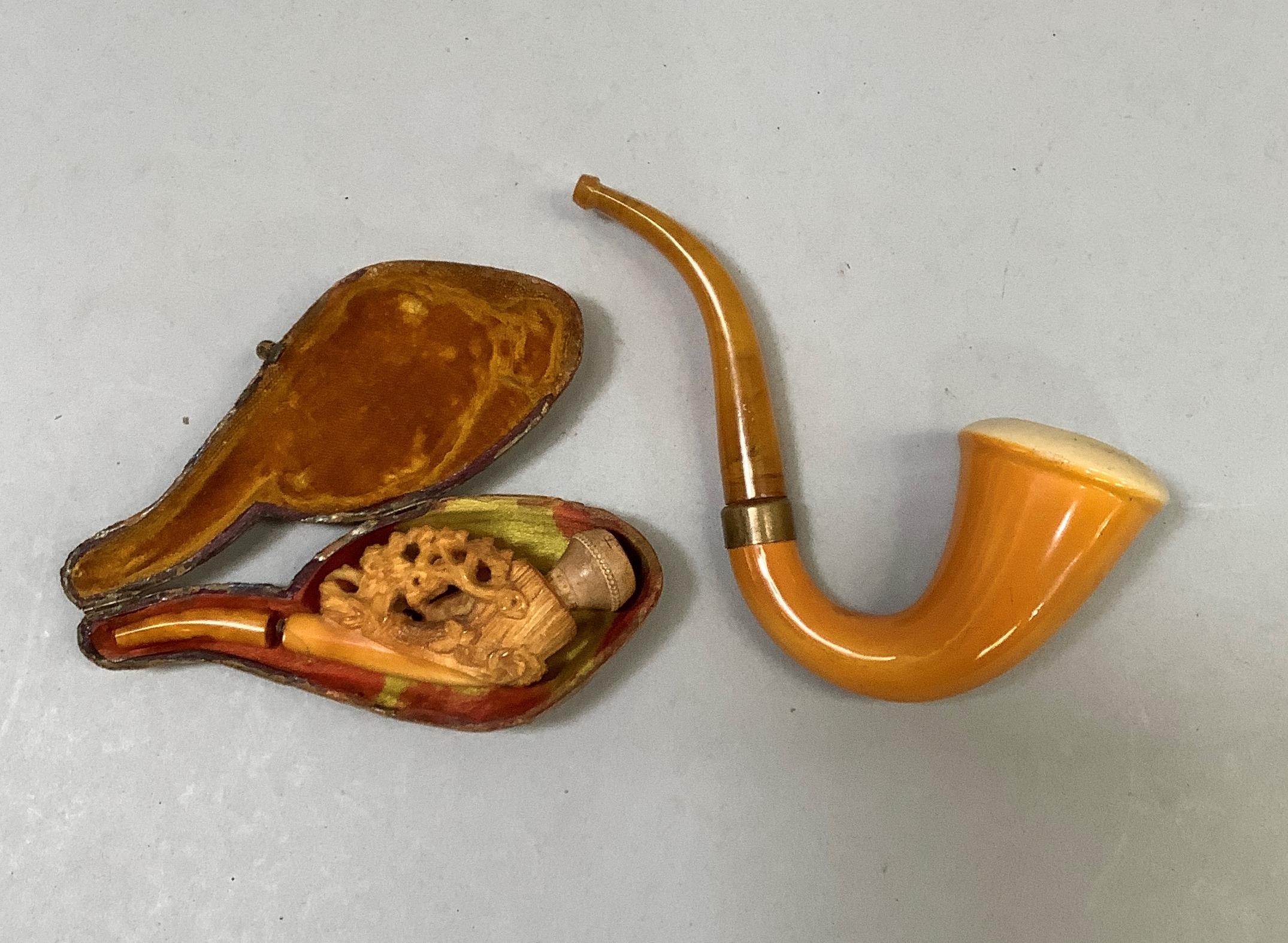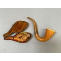 A Meerschaum style pipe modelled as children play fighting over a doll, mouthpiece at fault in original case together with a larger pipe made in Holland