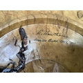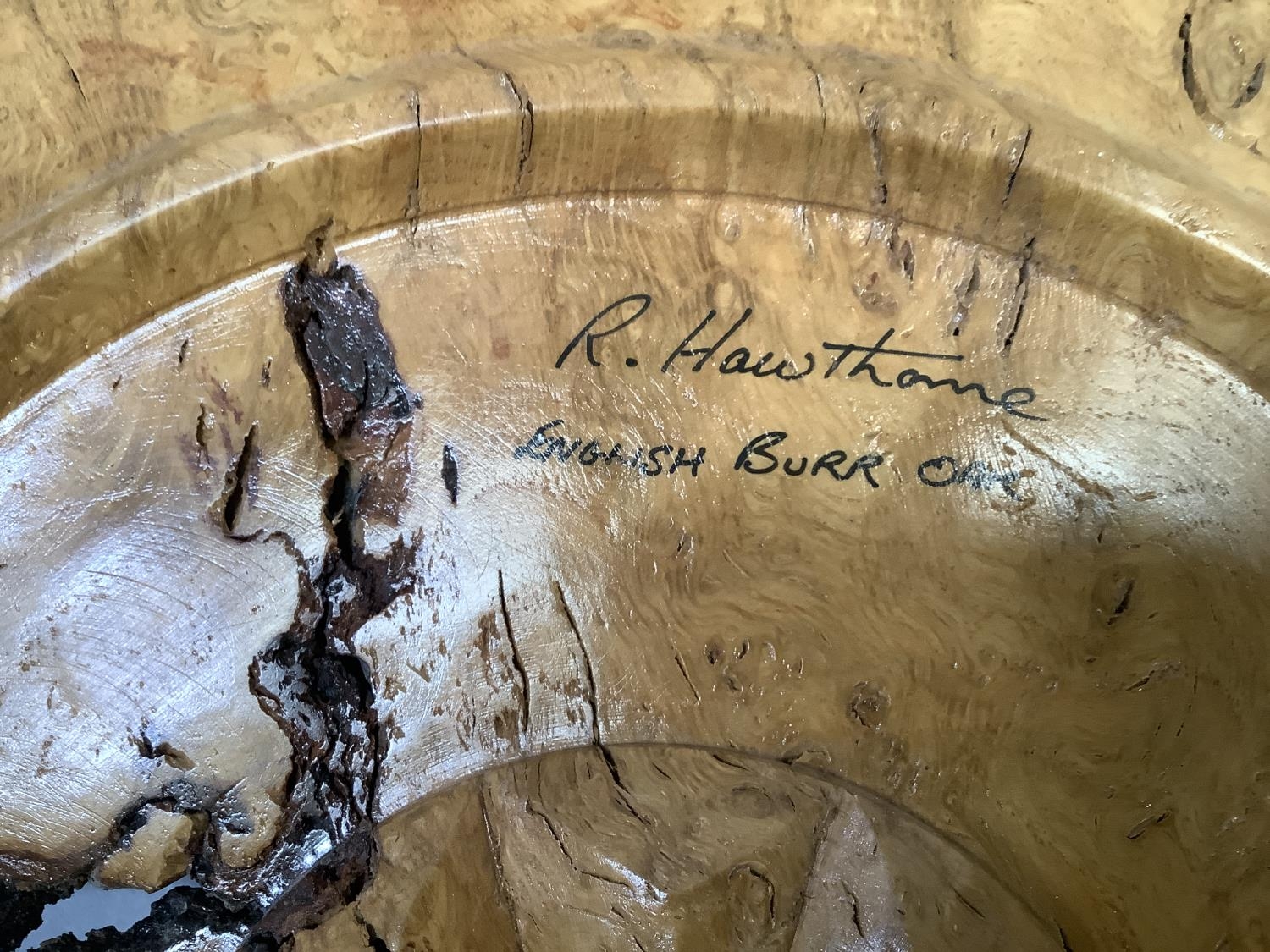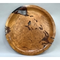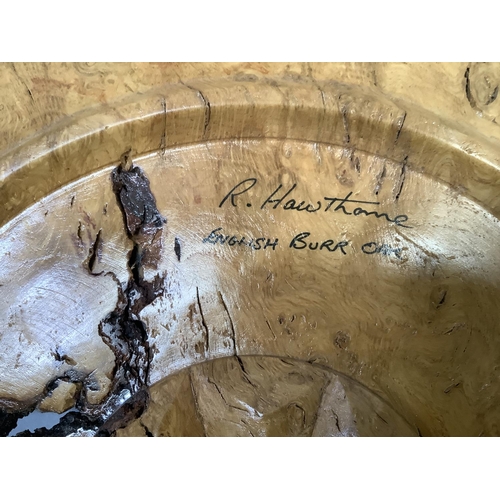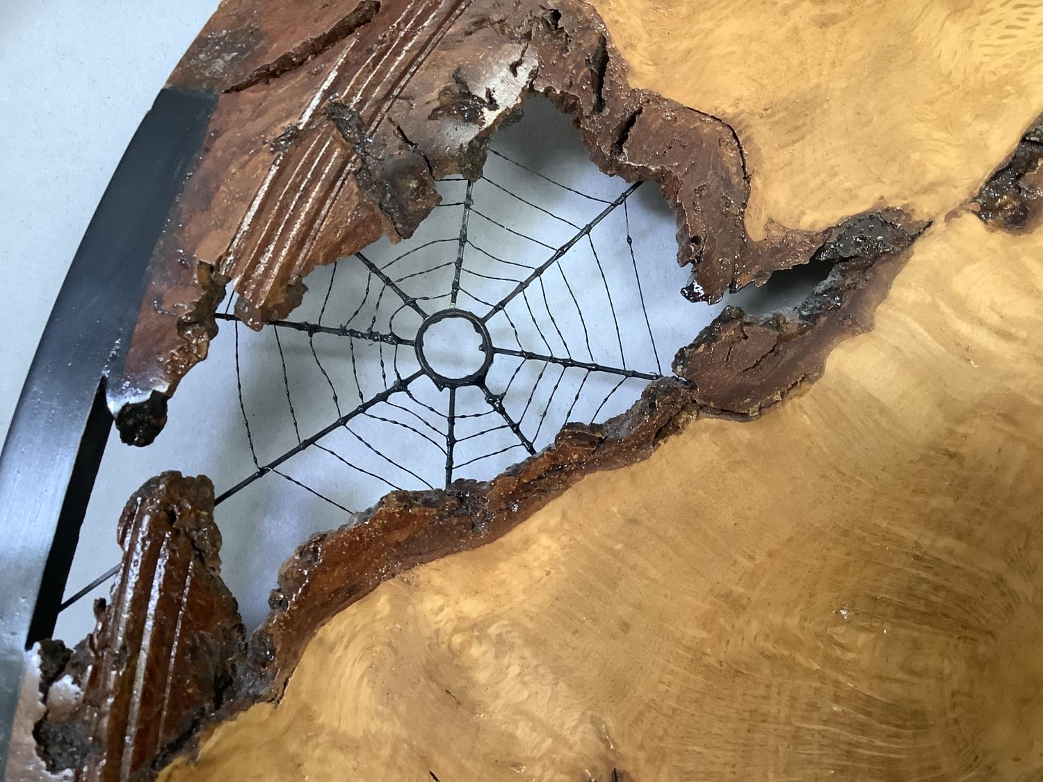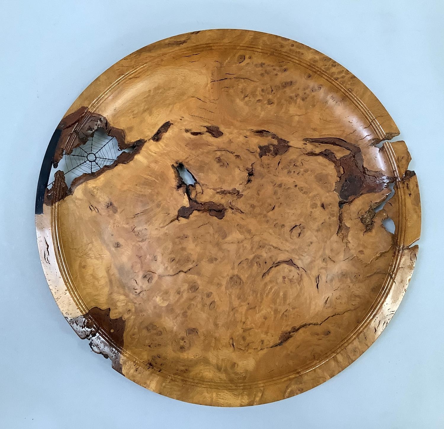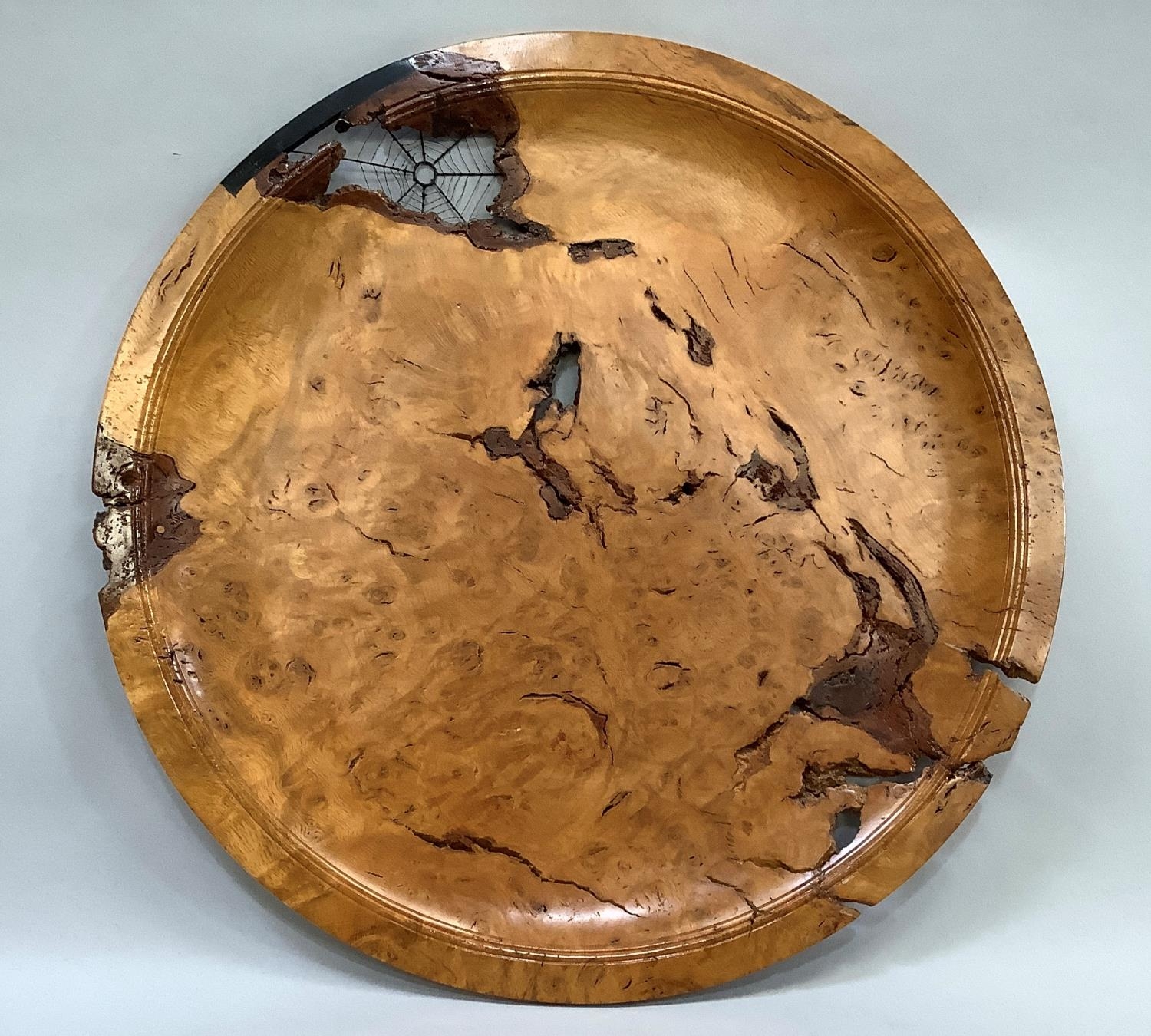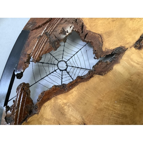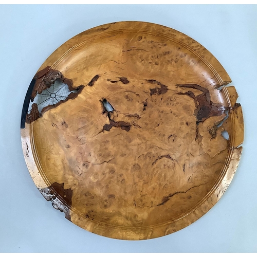 A large English burr oak turned platter by R Hawthorne inset with a spider's web, signed to underside, 49cm diameter