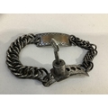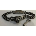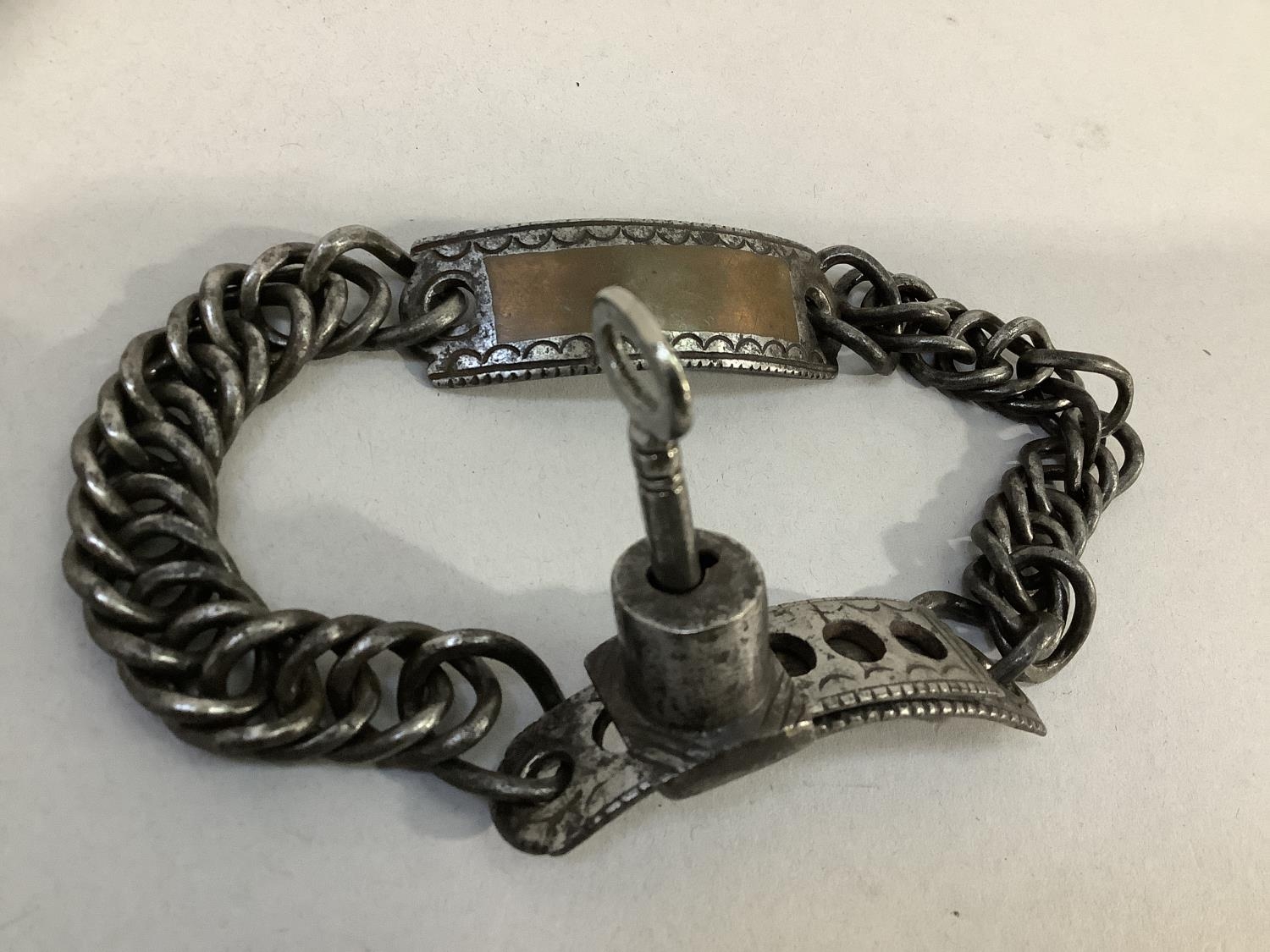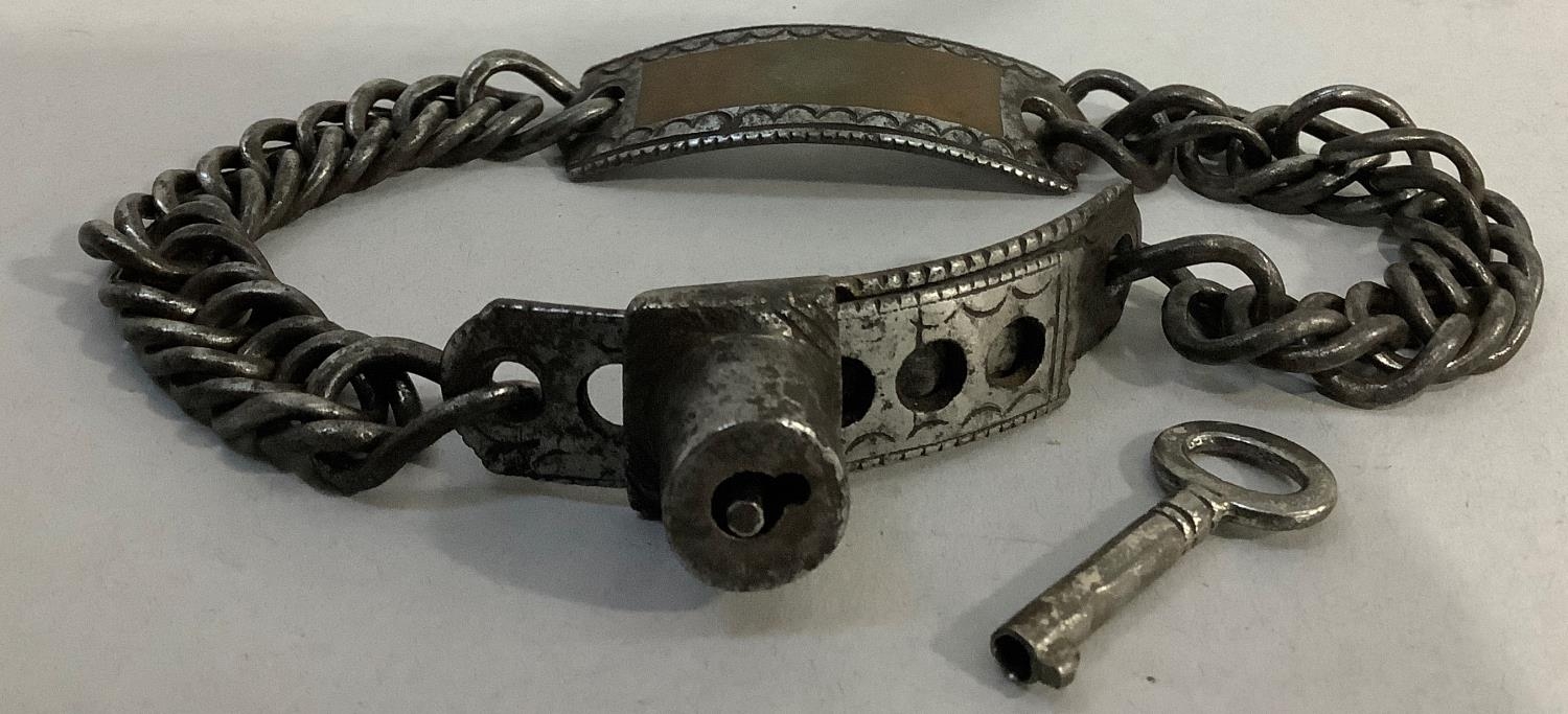 A 19TH CENTURY STEEL CURB LINK DOG COLLAR with locking mechanism, the name plate inset with copper panel, (without inscription), complete with later key