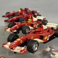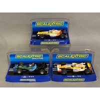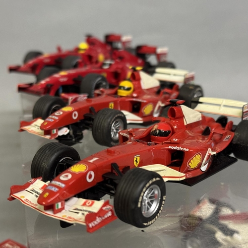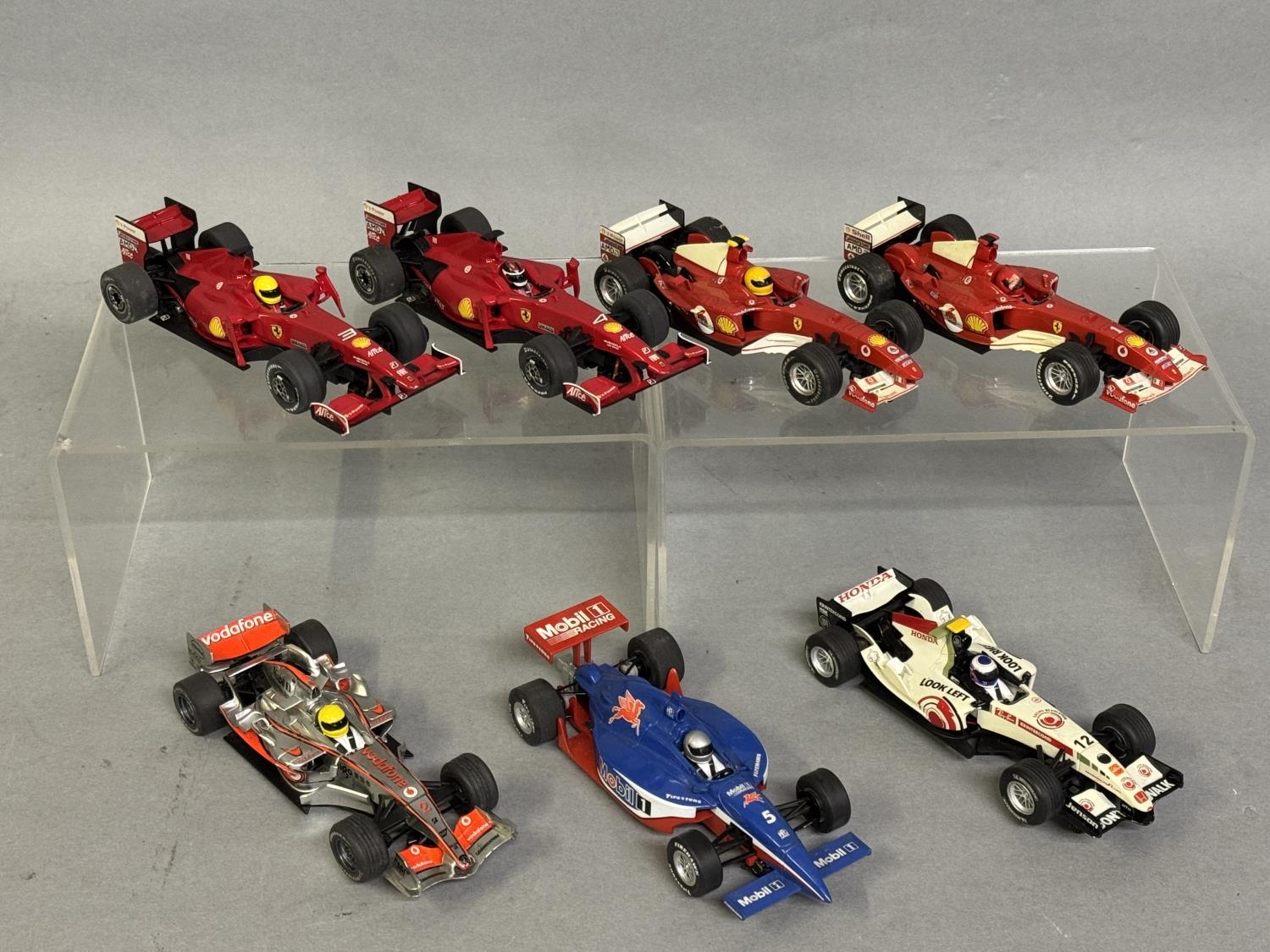 Three Scalextric F1 model cars, including two Ferrari F2004, two Ferrari F60, a Dallara Indy, a Honda Racing F1 and a McLaren MP4-21, unboxed with some play wear