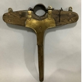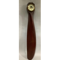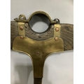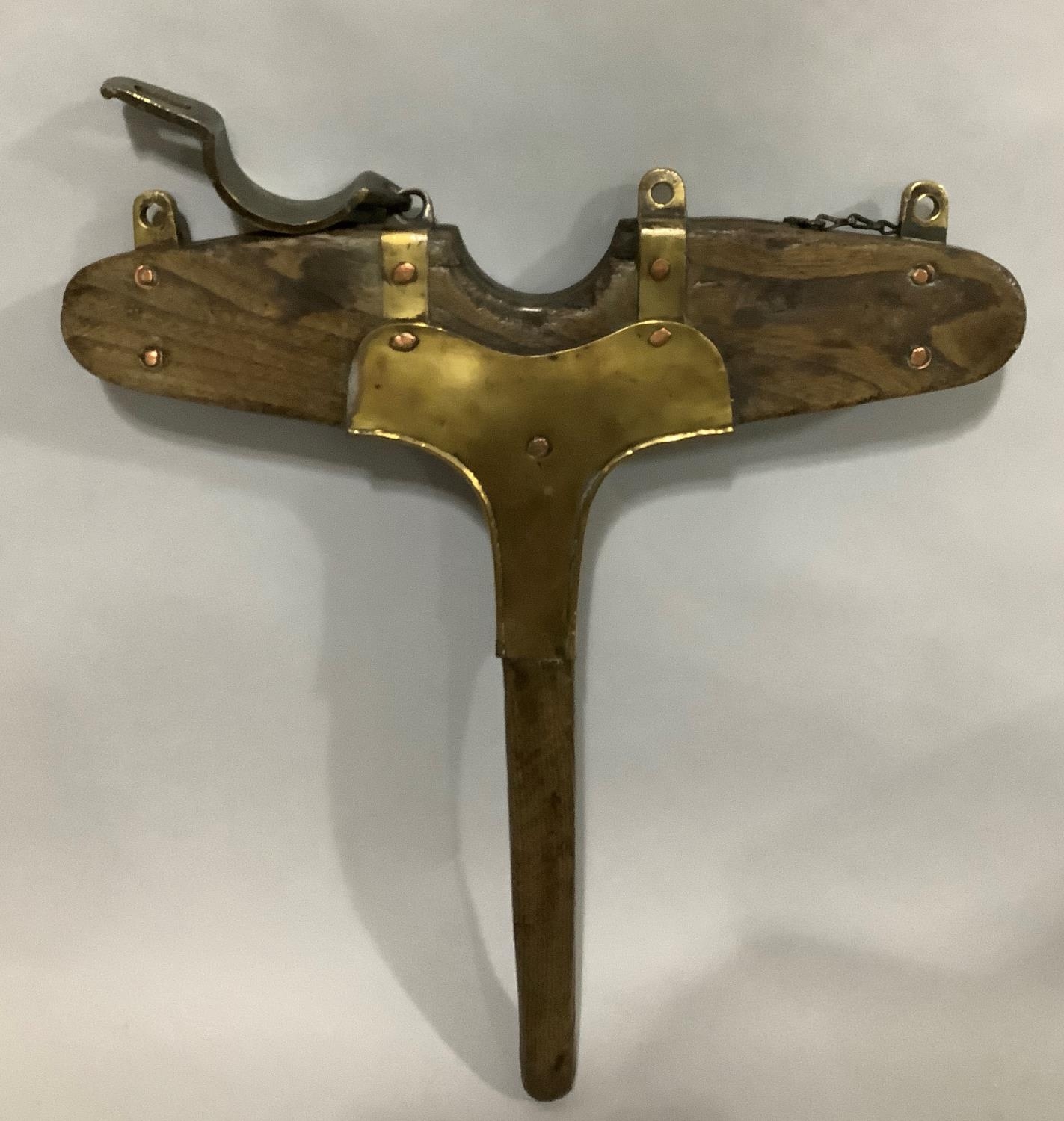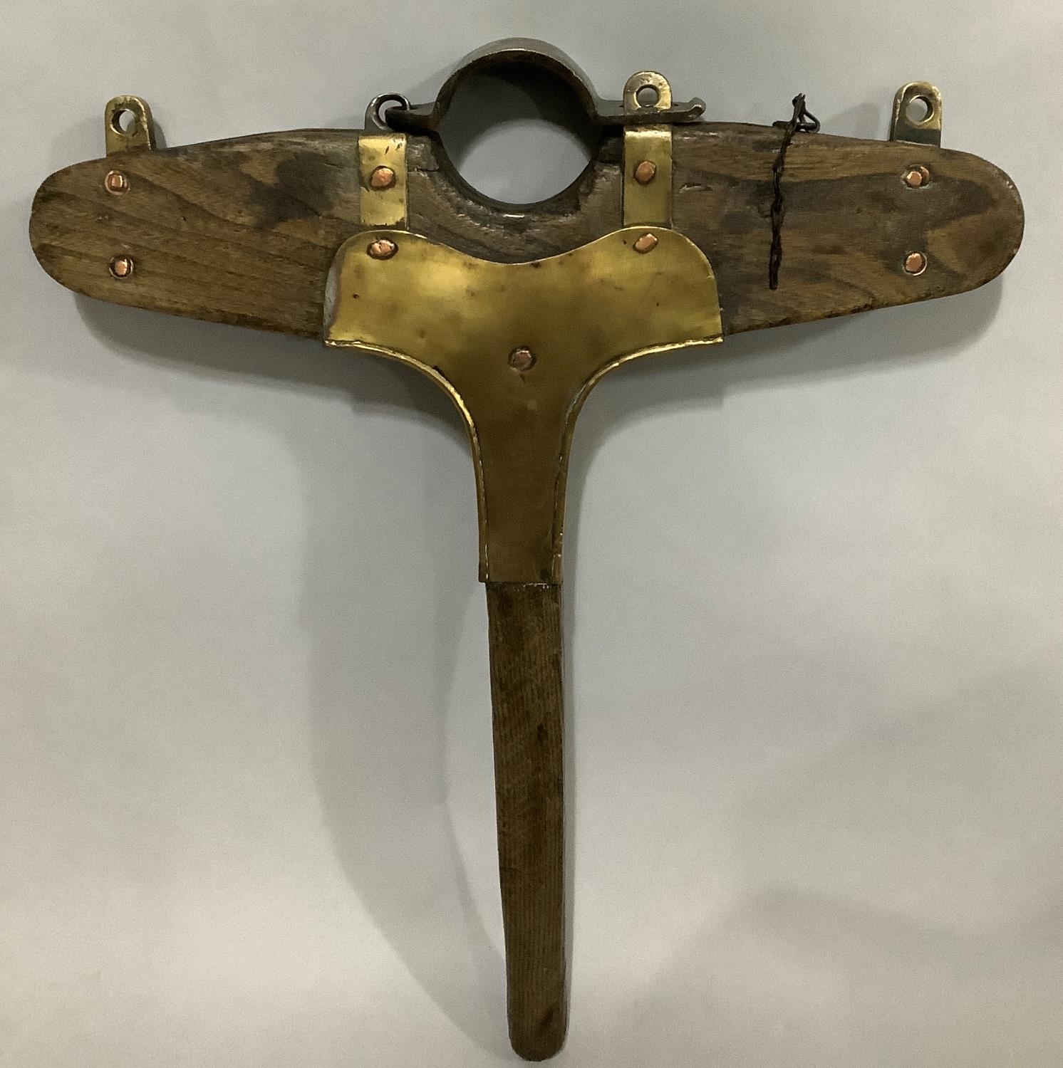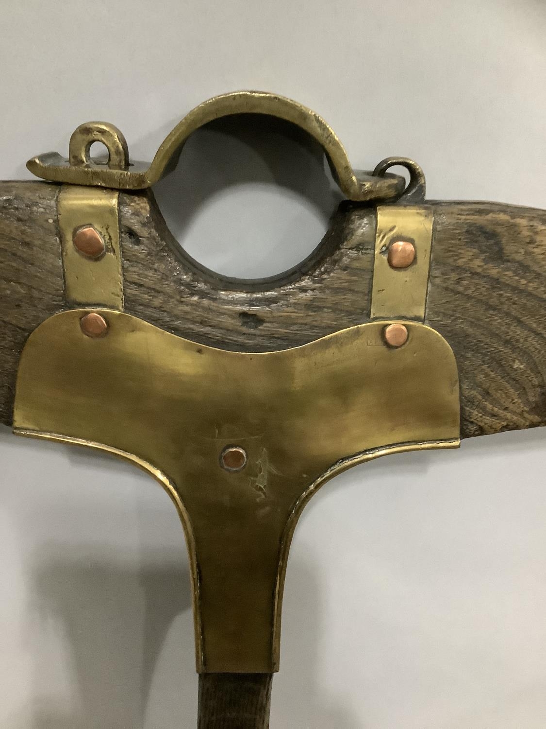 A VINTAGE TEAK AND BRASS BOUND ROWLOCK, 50.5cm wide x 57cm high