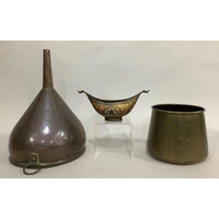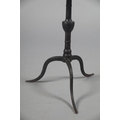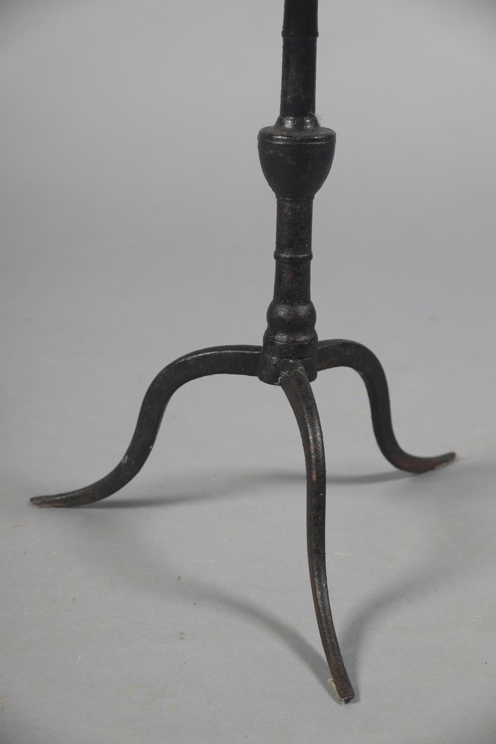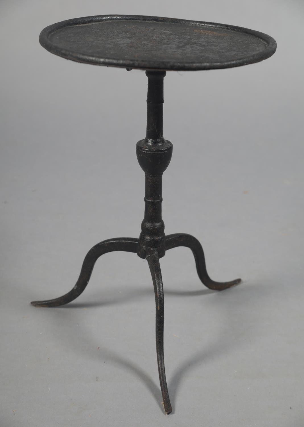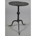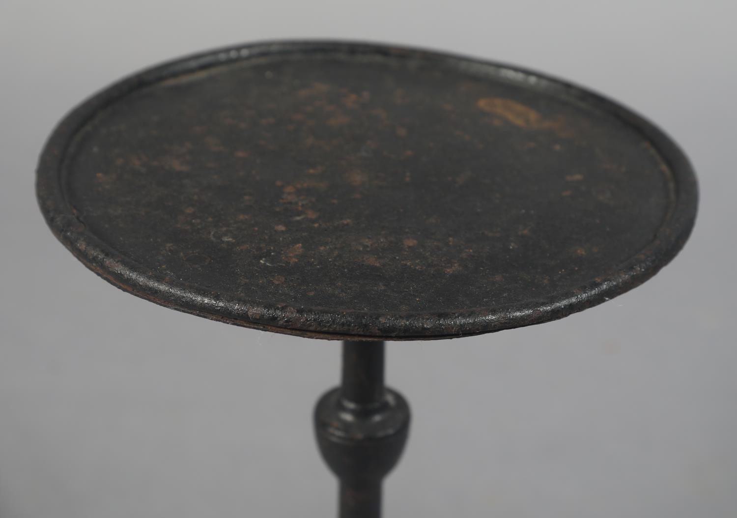 A GEORGE III TRIVET IN THE FORM OF A MINIATURE IRON TILT TOP TABLE, circular, vase column, on three cabriole legs, 25.5cm diameter x 37cm high