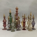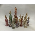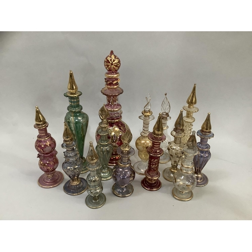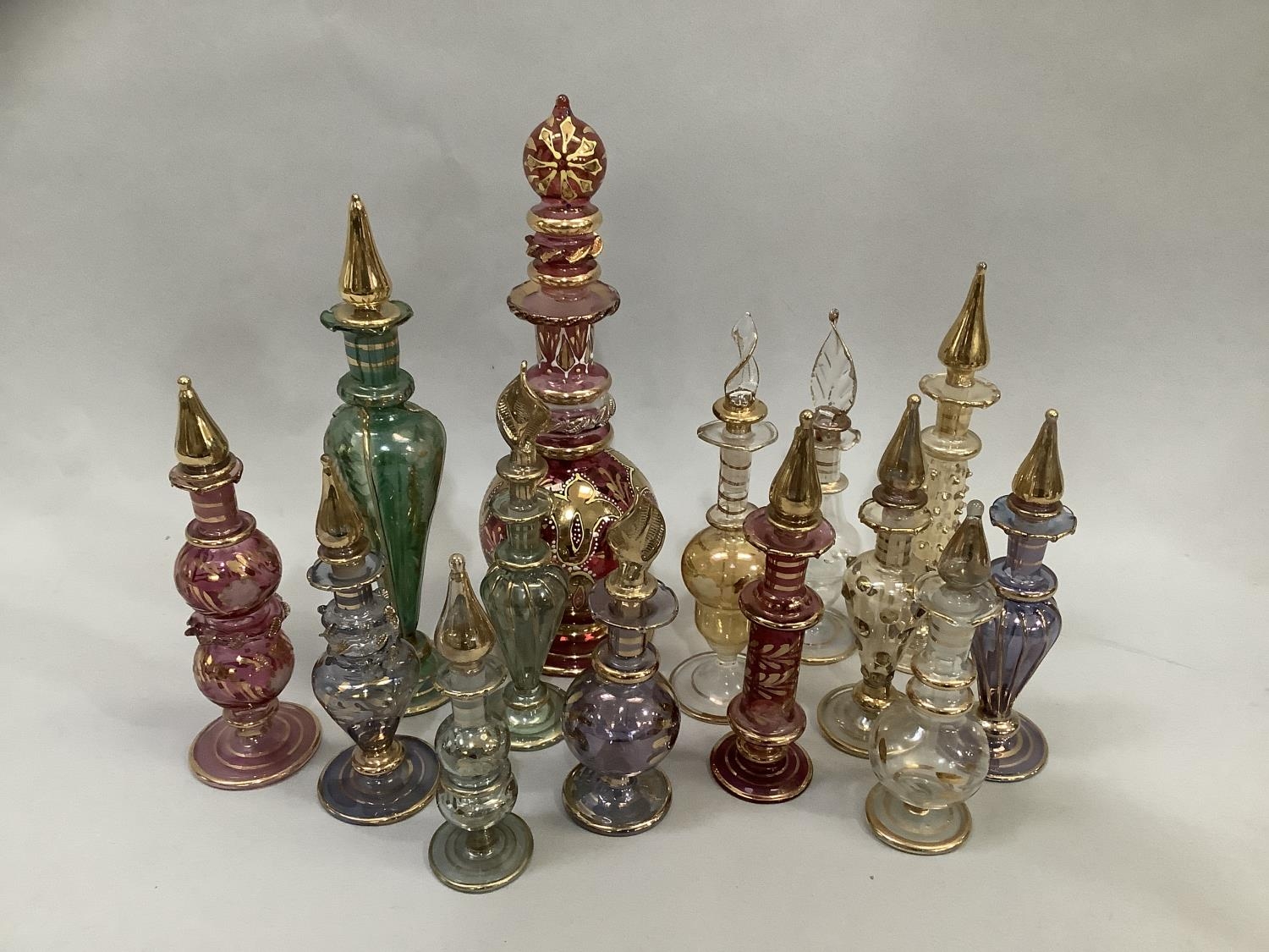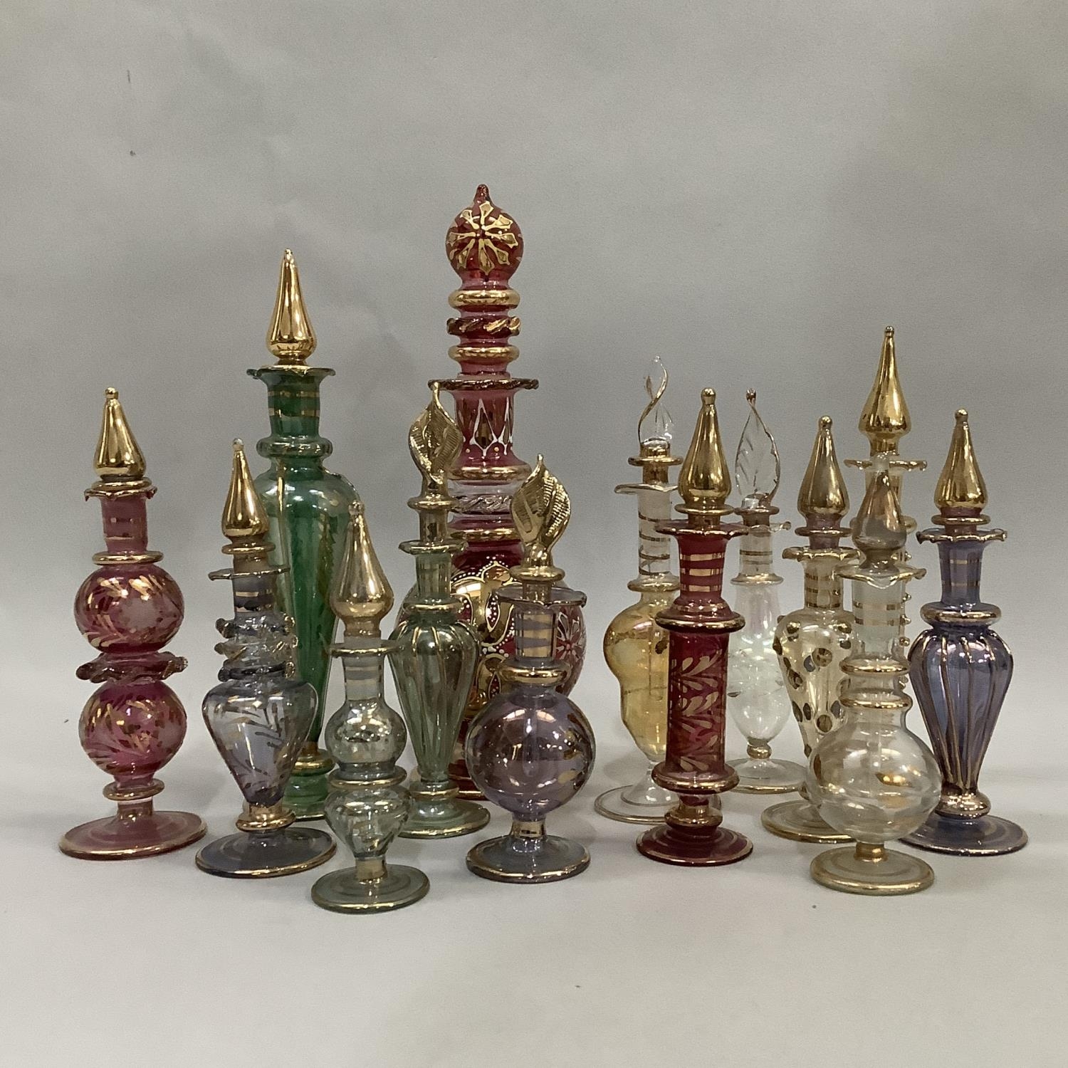 A collection of fourteen coloured glass and gilt scent bottles, measuring from 22cm to 11.5cm
