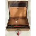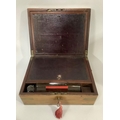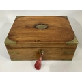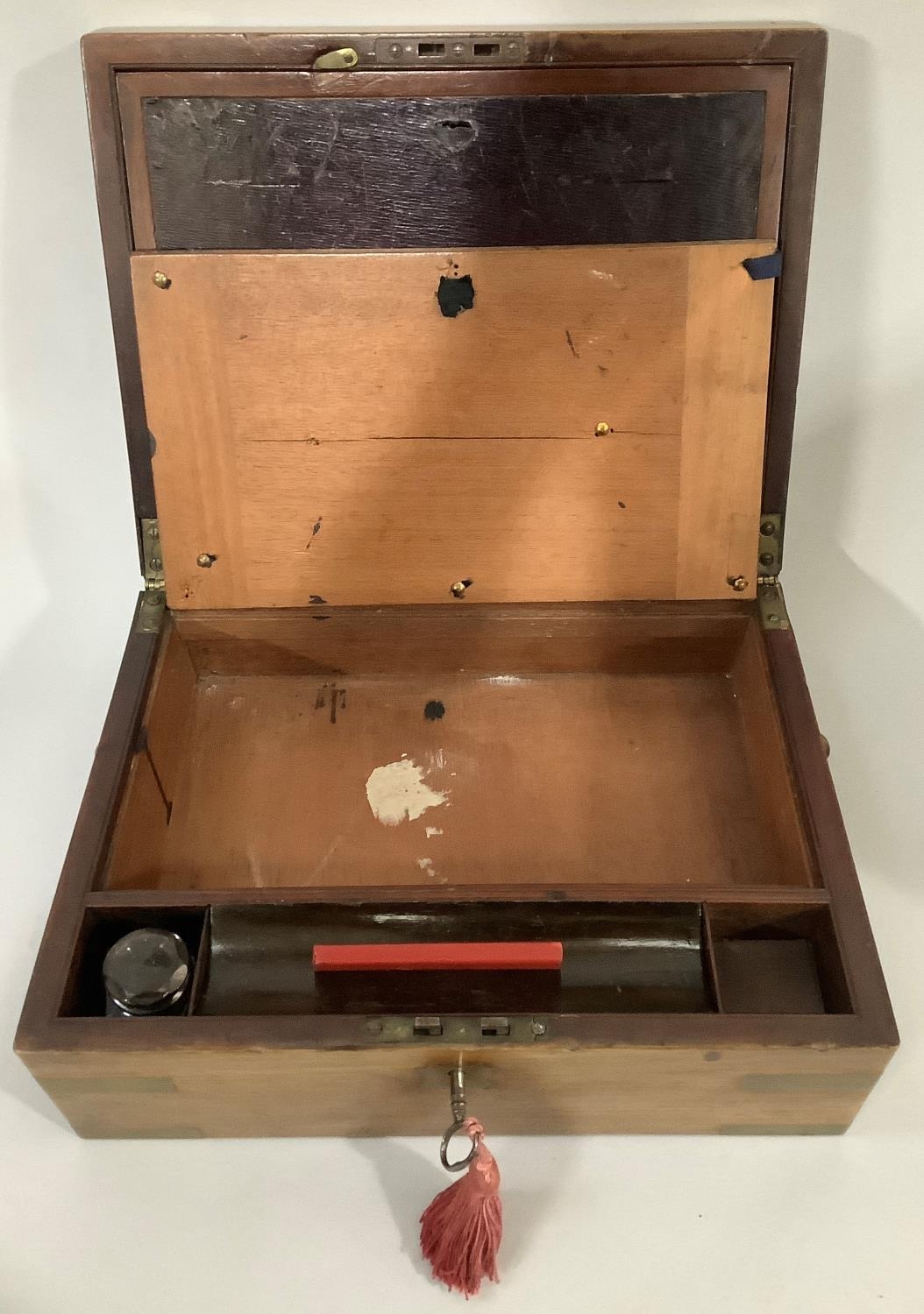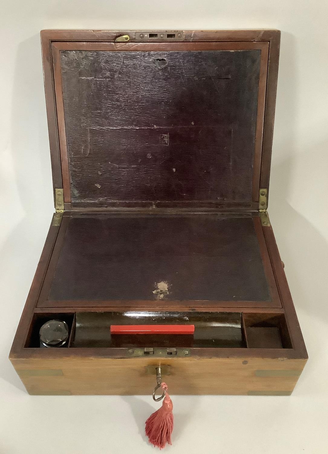 A 19TH CENTURY MAHOGANY AND BRASS BOUND WRITING SLOPE, with vacant brass cartouche to the lid and side carrying handles, the interior with leather slope, pen slide and inkwell, 30.5cm wide x 23.5cm deep x 12.5cm high