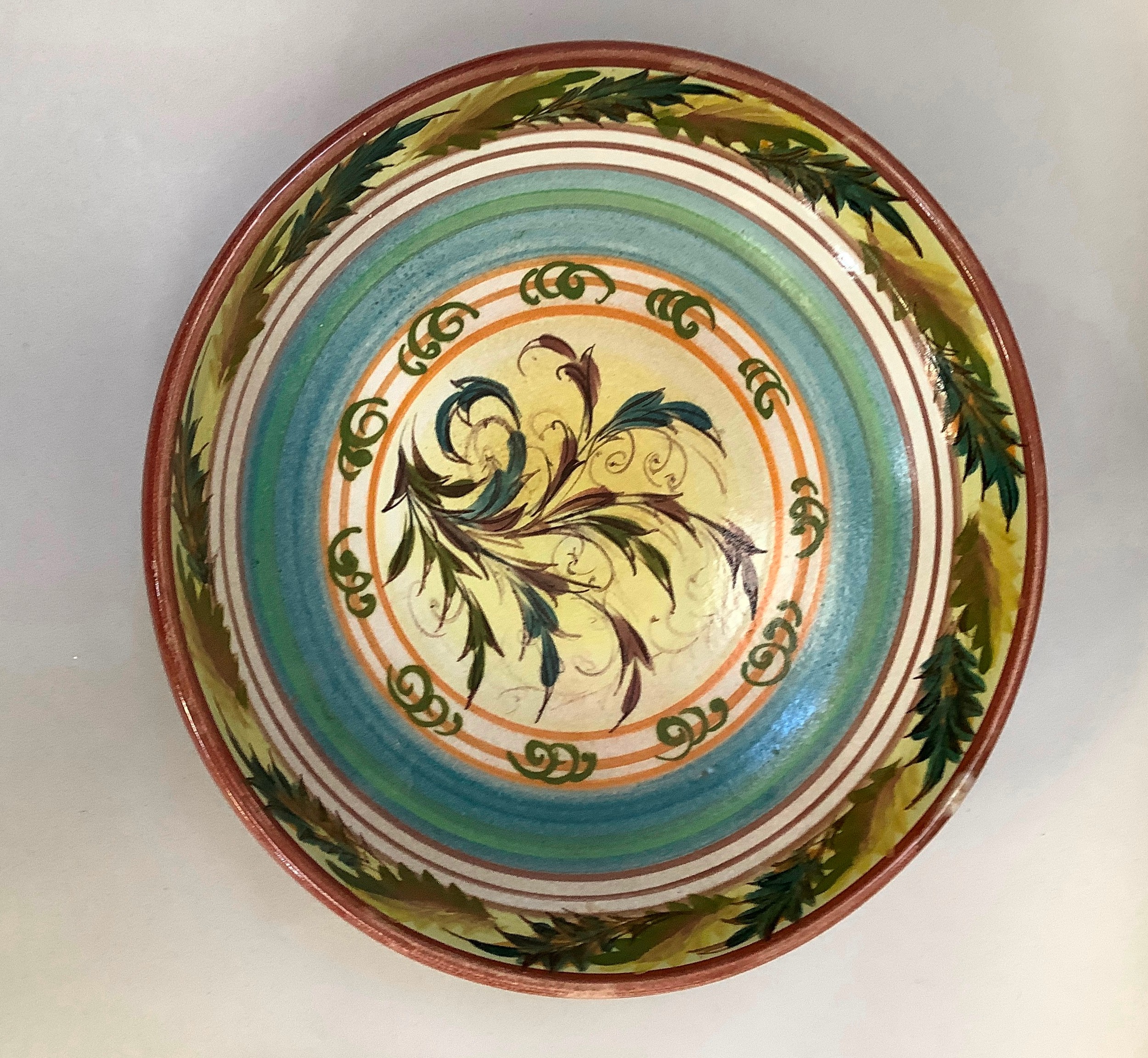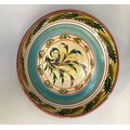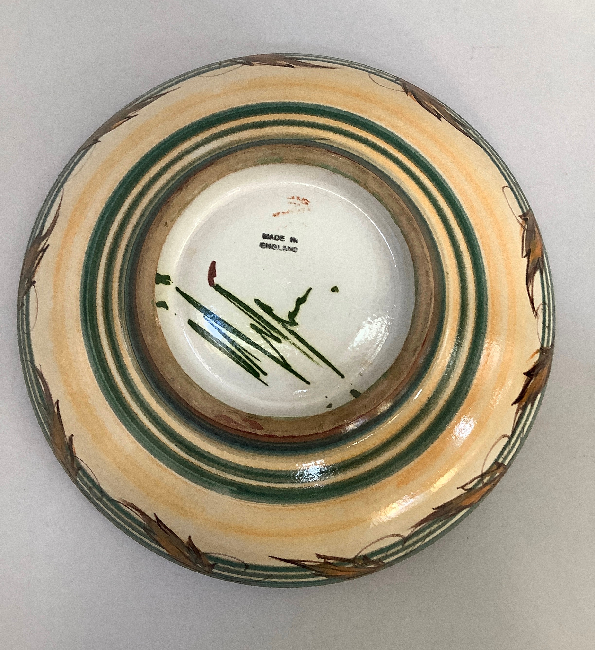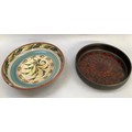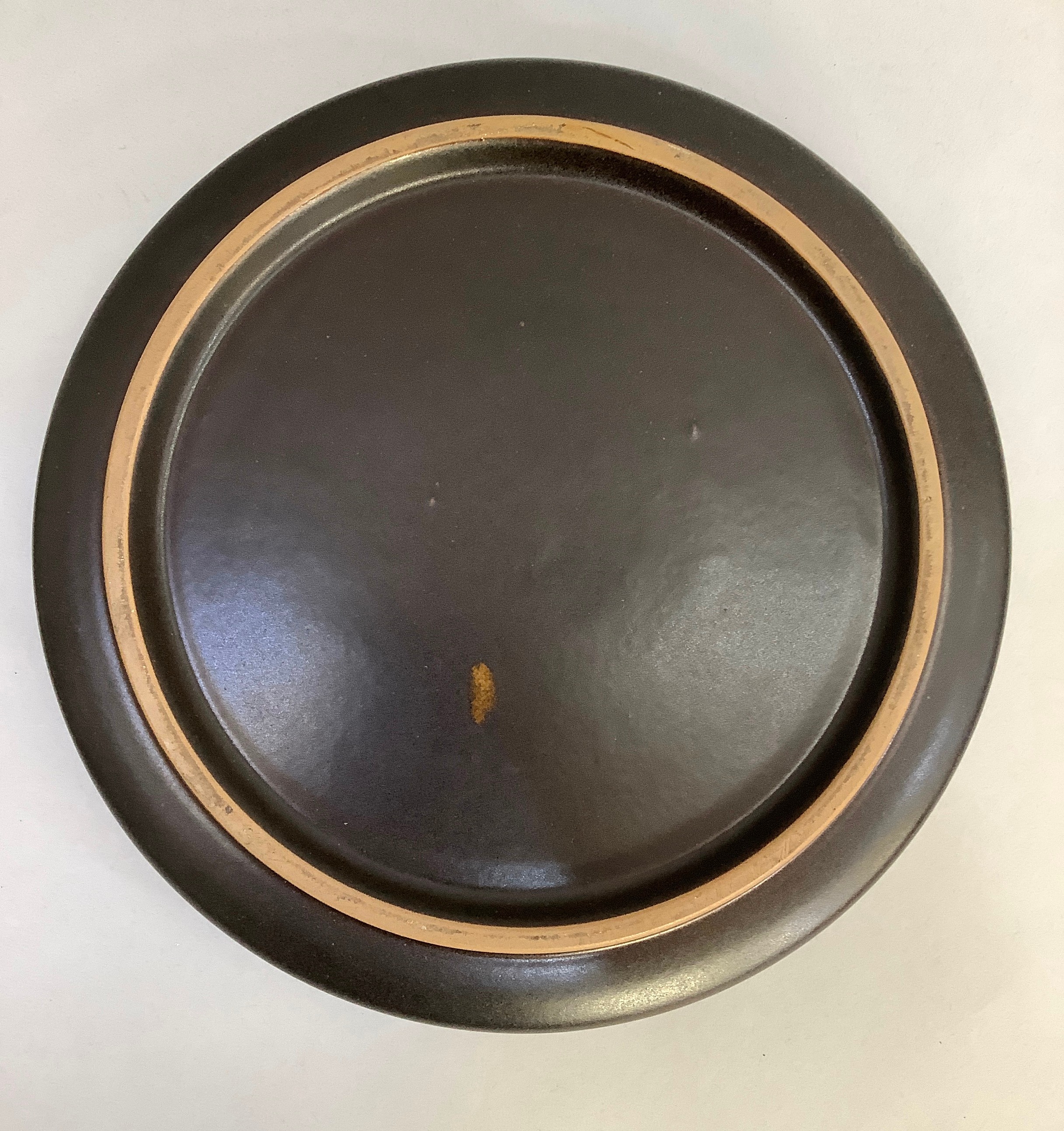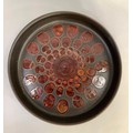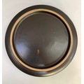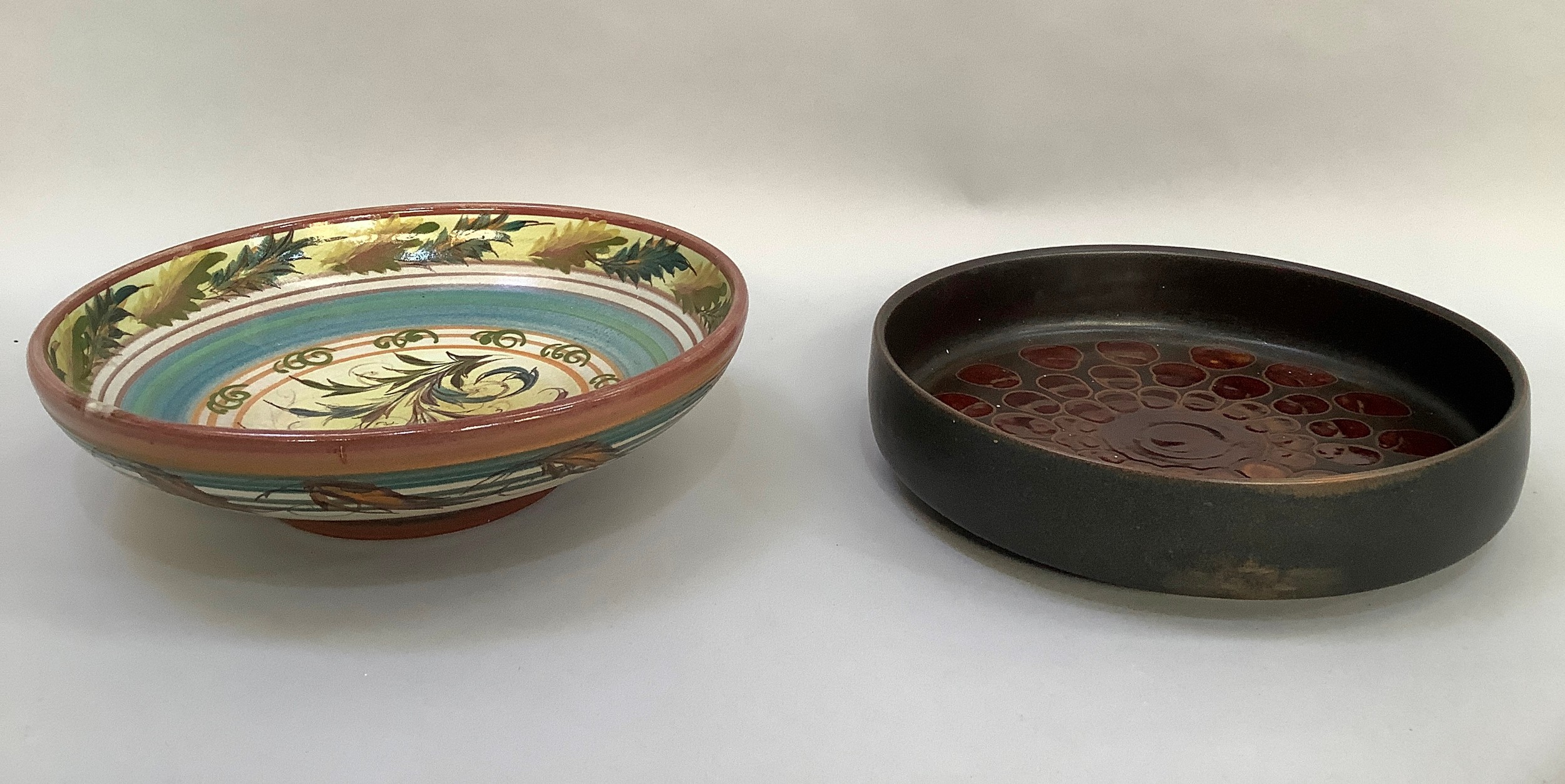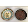 A Glen Colliery Denby dish, circular, signed in green to underside, 30.5cm diameter x 8.5cm high, together with a 1970s brown glaze pottery dish, circular, with radiating high fired glaze bubbles to the well, 29cm diameter x 6.5cm high