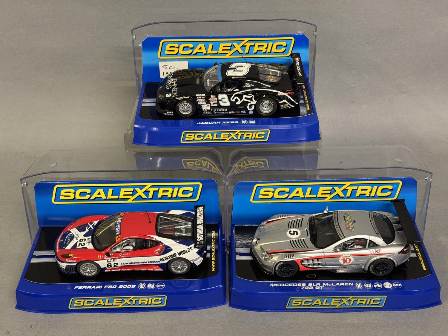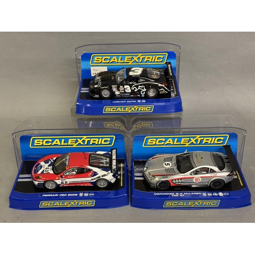 Three Scalextric NASCAR/FIA GT models, including a Ferrari F60 2009 No4, a Mercedes SLR McLaren 722GT and a Rocket Motorsports Jaguar XKR-S, all boxed