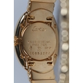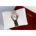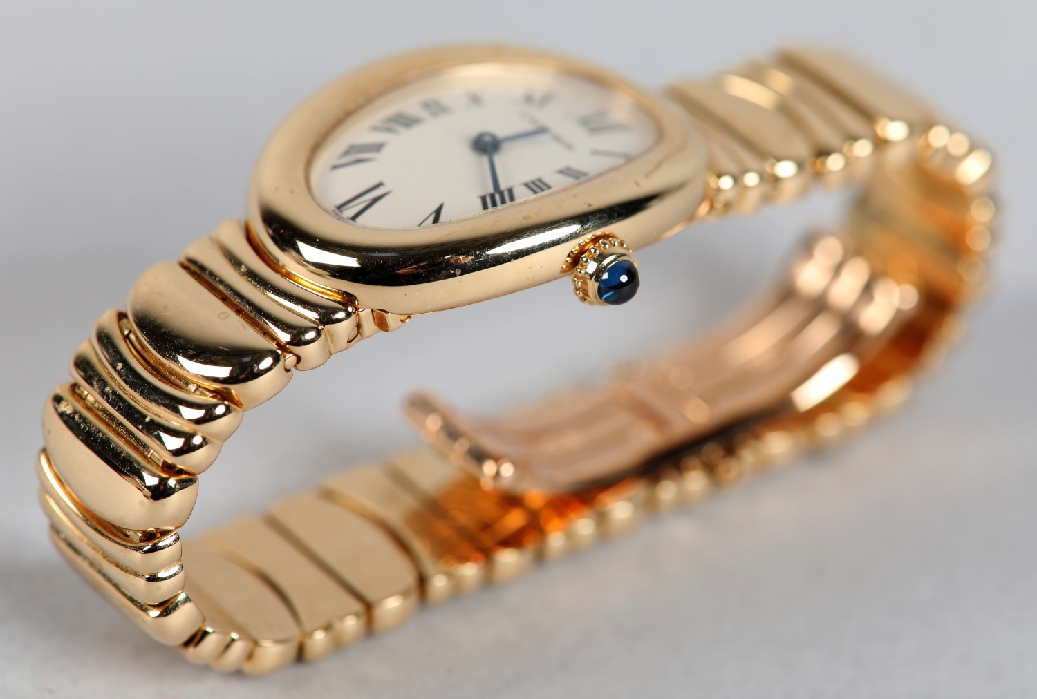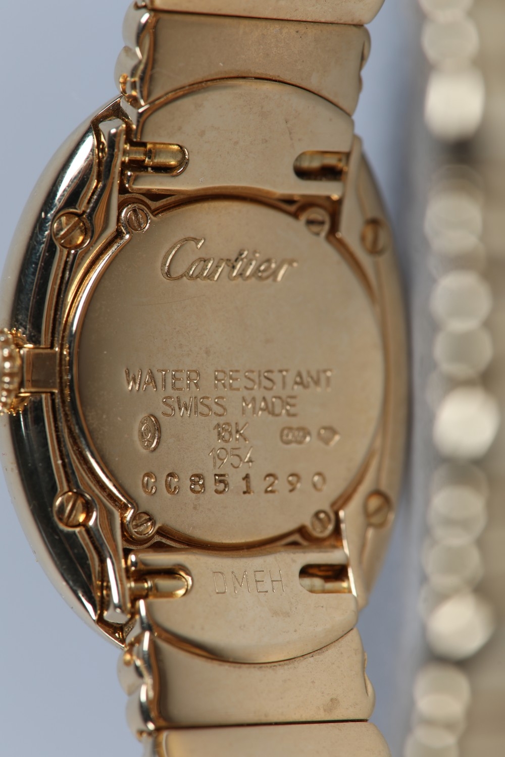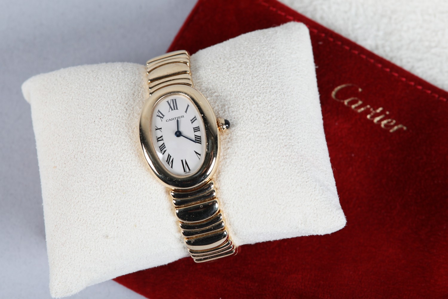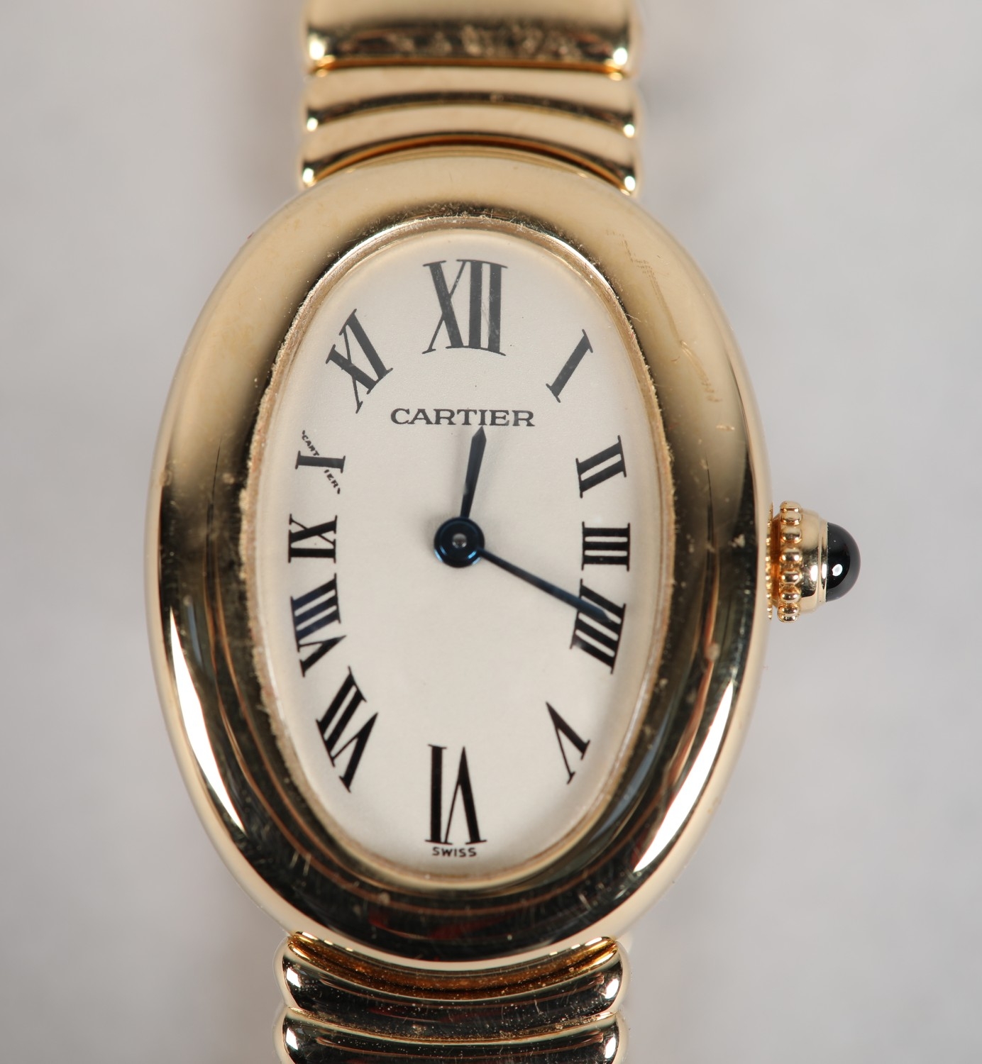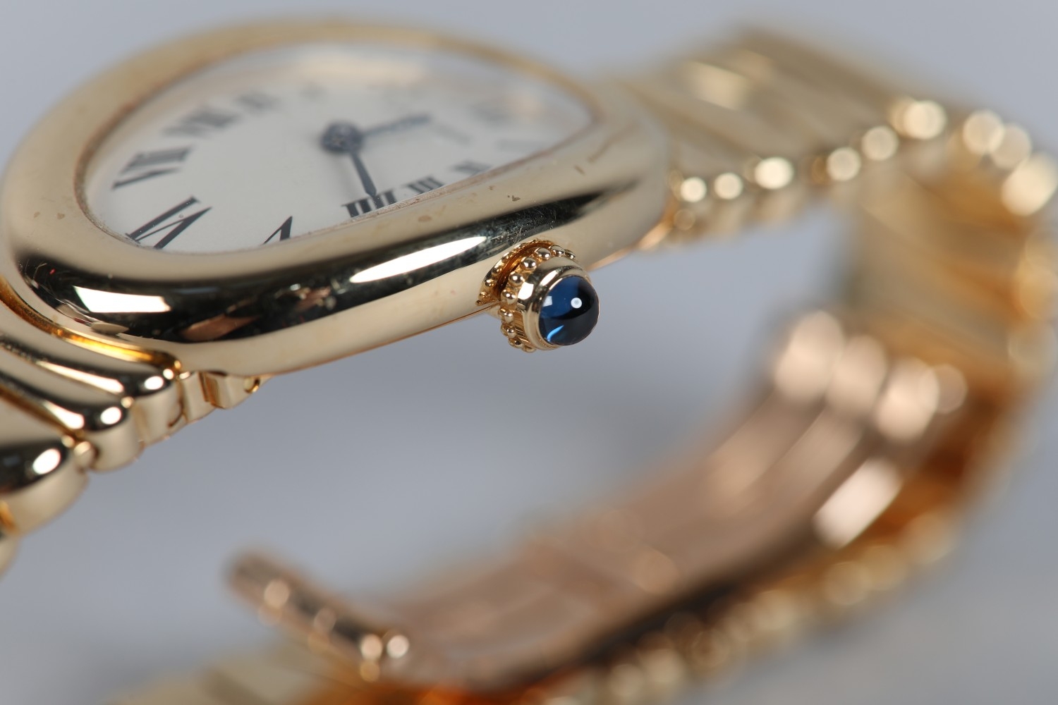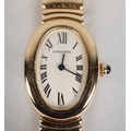 A CARTIER LADY'S BAIGNOIRE 1954 QUARTZ WRISTWATCH, in 18ct gold case no. CC851290, an oval cream secret signature dial with black Roman numerals and blue steel pointed baton hands, cabochon sapphire crown, on original 18ct gold bracelet, with Cartier suede pouch and cushion, approximately 30mm x 22mm, weight 79.6g
