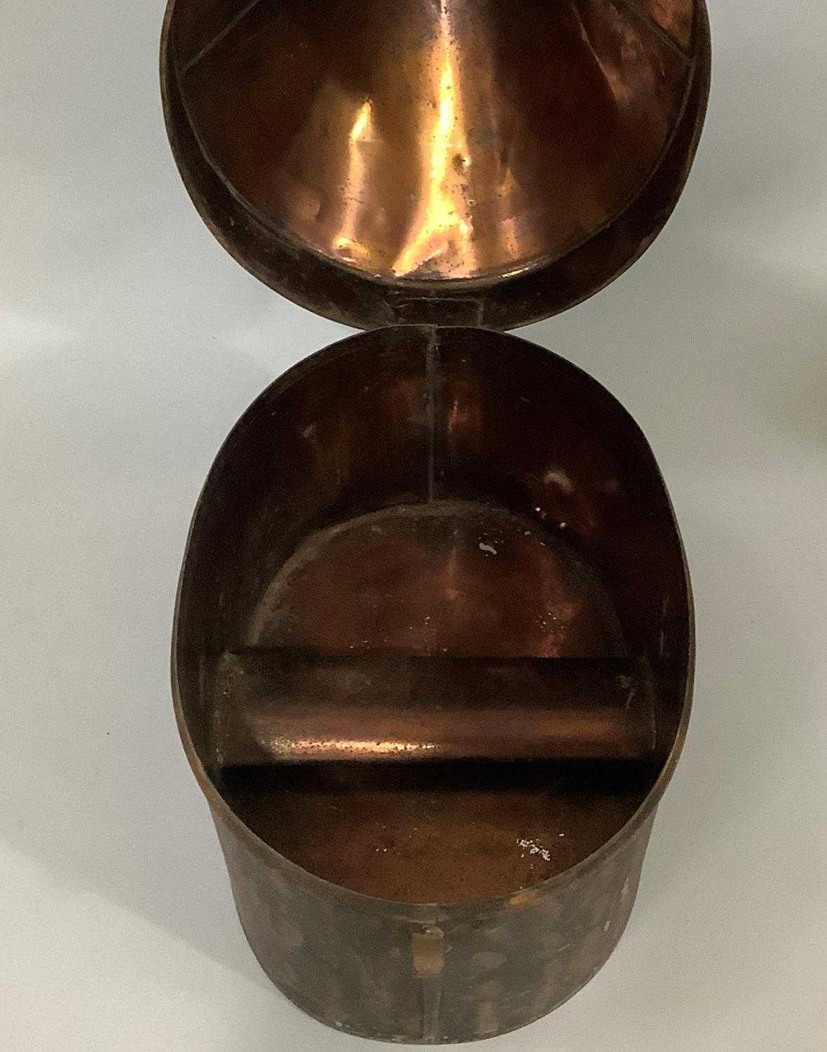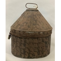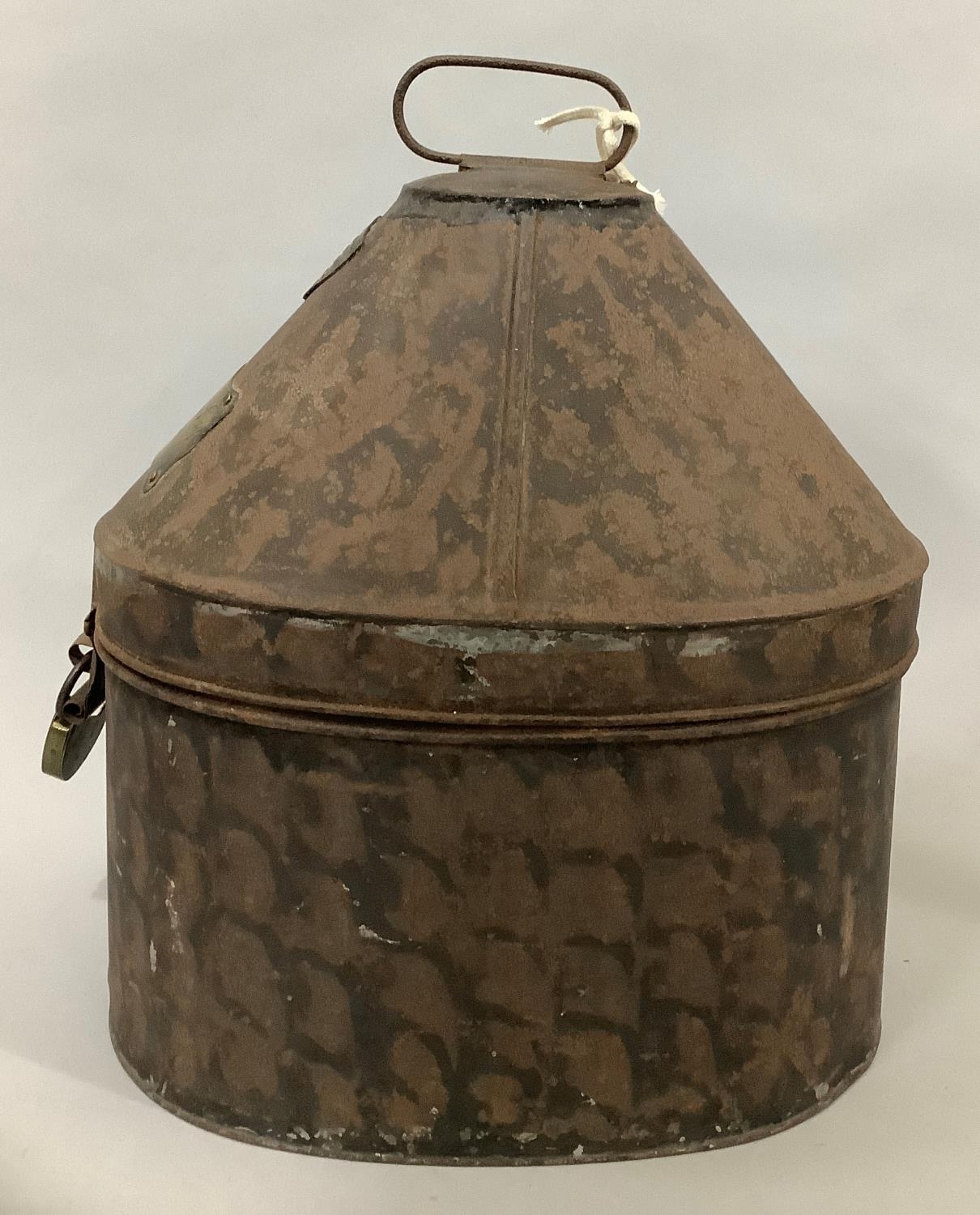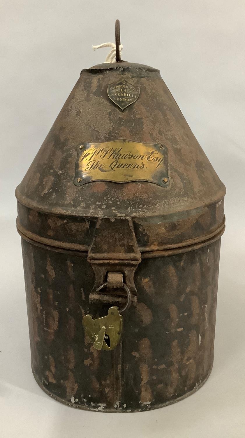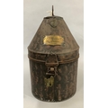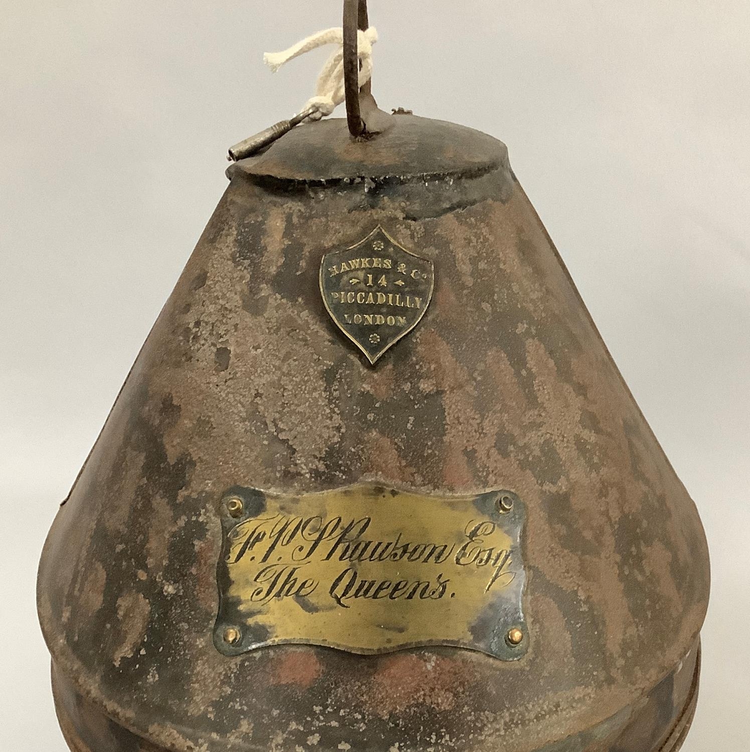 A 19TH CENTURY TOLEWARE MILITARY HELMET BOX by Hawkes & Co, 14 Piccadilly, London, brass name plate engraved 'F PS Rawson Esq The Queens' and small brass padlock, with later key, 30.5cm high