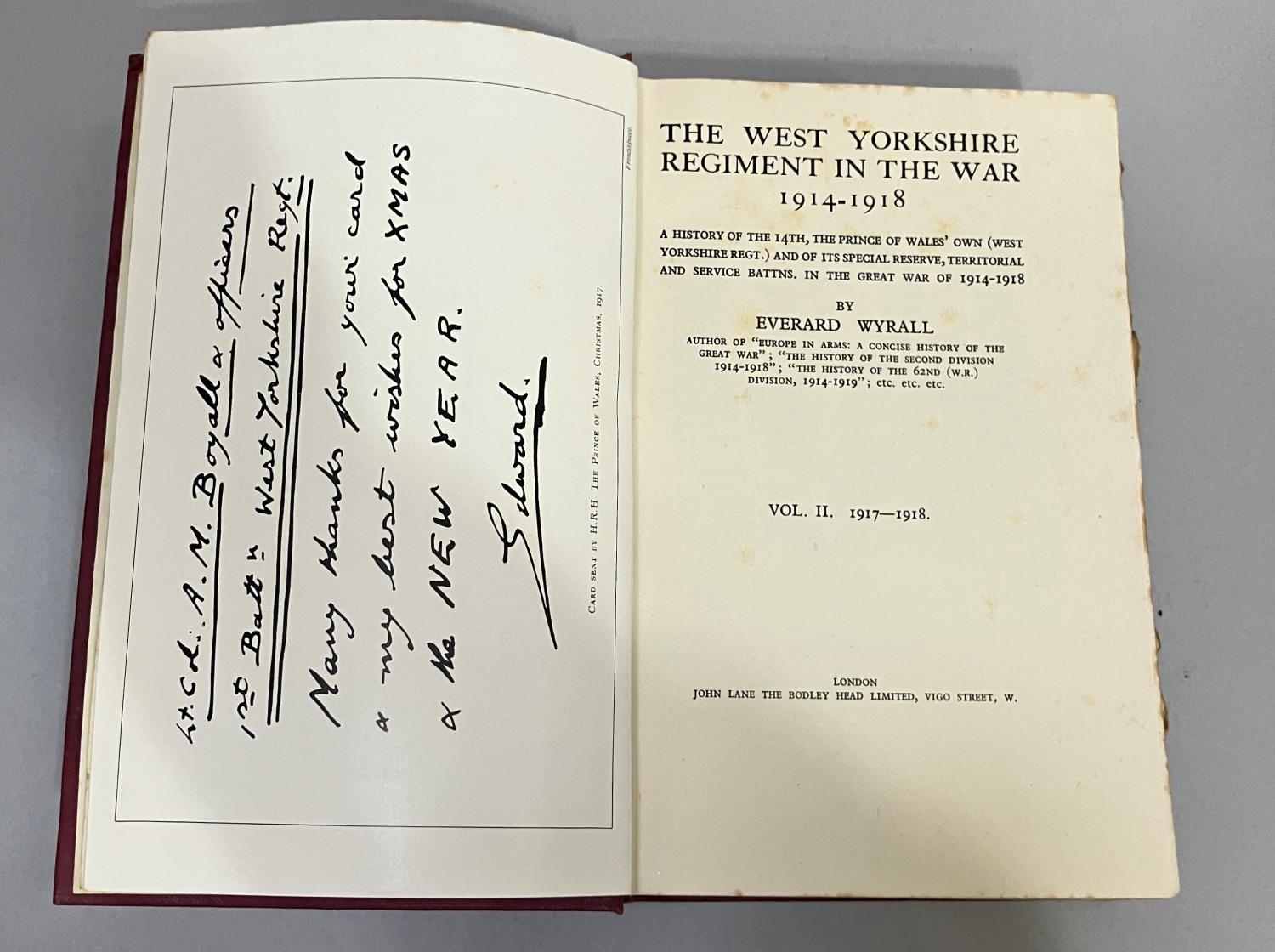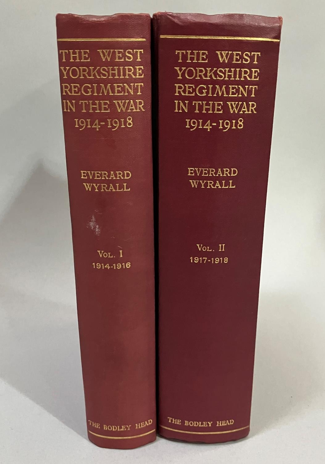 WYRALL, EVERARD - THE WEST YORKSHIRE REGIMENT IN THE WAR 1914 1918, two volumes, pub. The Bodley Head, original red cloth, all folding maps present