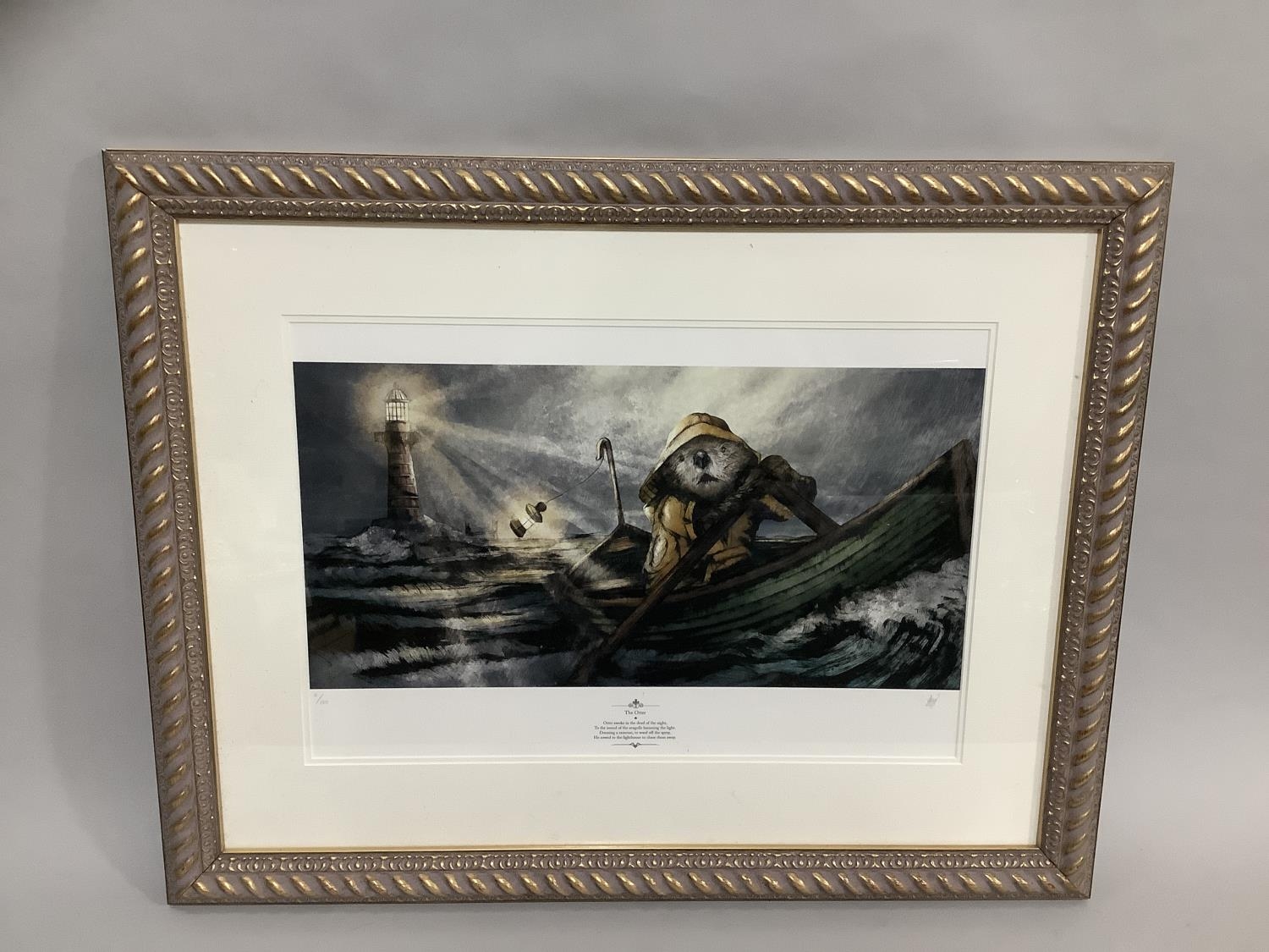 After Izzy Hodge The Otter colour print limited edition 11/150 with verse to the margin 'Otter awoke in the dead of the night, to the sound of the seagulls harassing the light. Donning a raincoat to ward off the spray, he rowed to the lighthouse to chase them away.', 60cm x 78cm overall