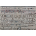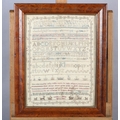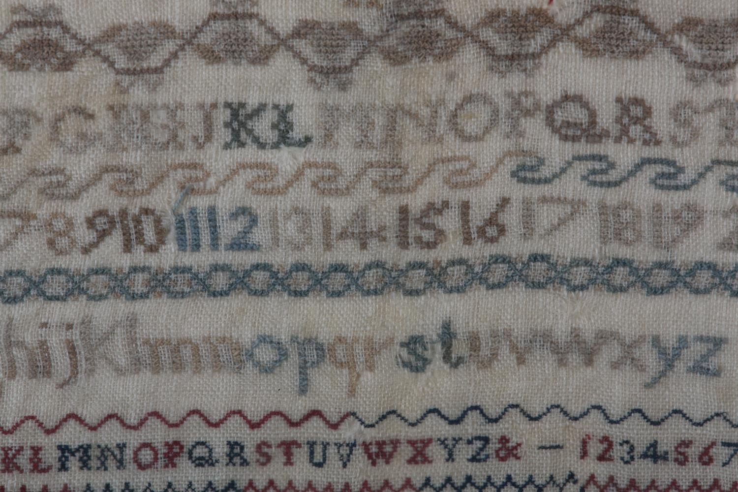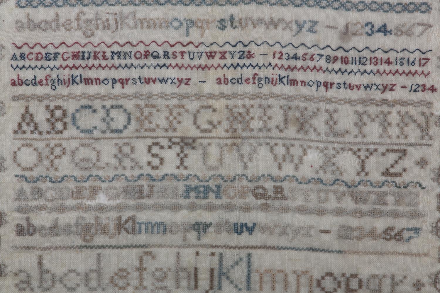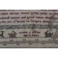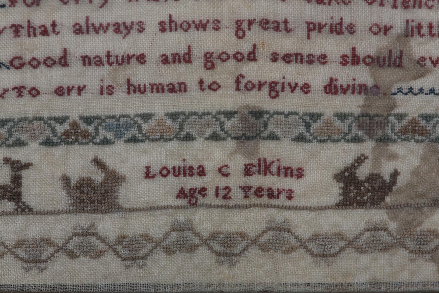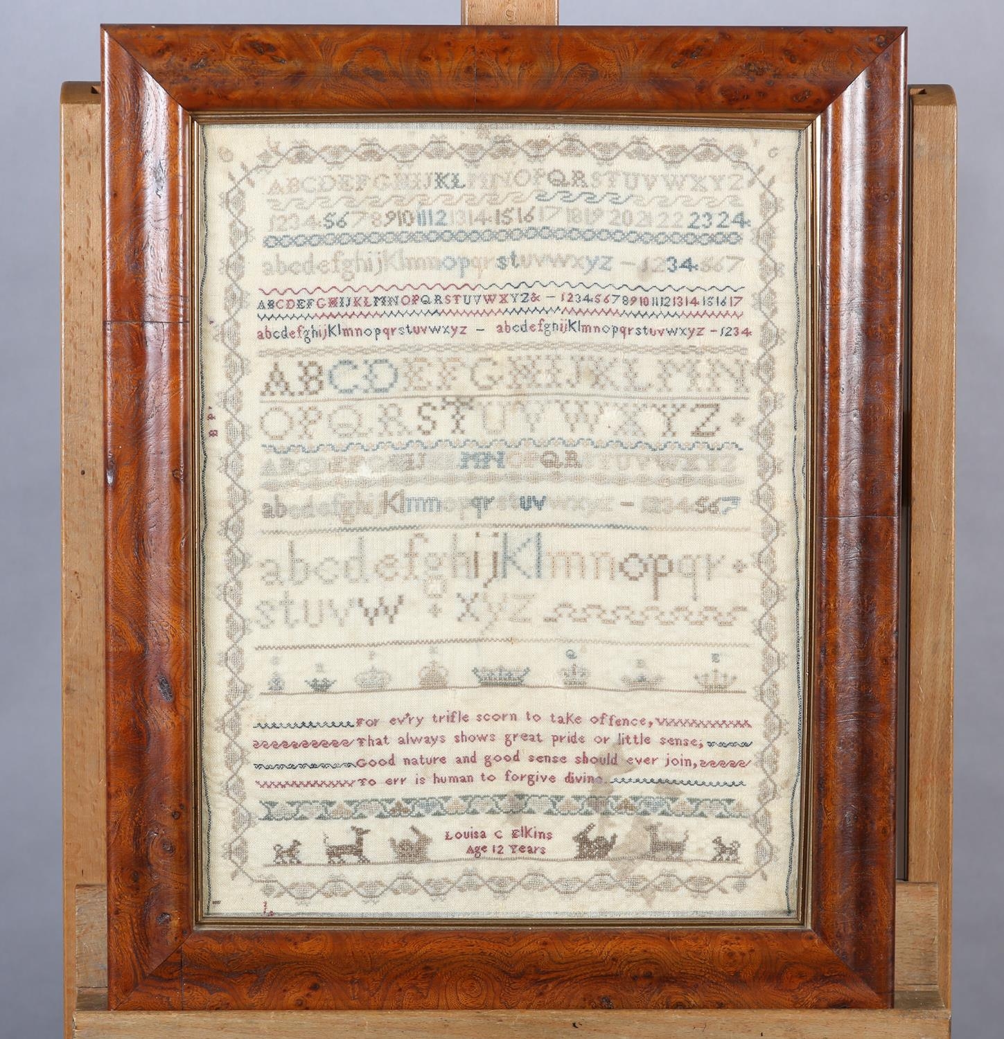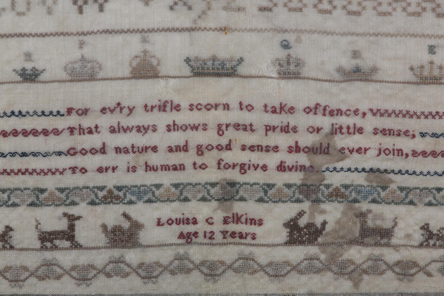 AN EARLY TO MID 19TH CENTURY SAMPLER worked by Louisa C Elkins age 12 years, in silks with alphabet and numerals and the verse For Ev'ry trifle scorn to take offence... amongst crowns, rabbits, deer and hounds, in later frame (faults), 42.5cm x 32cm