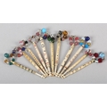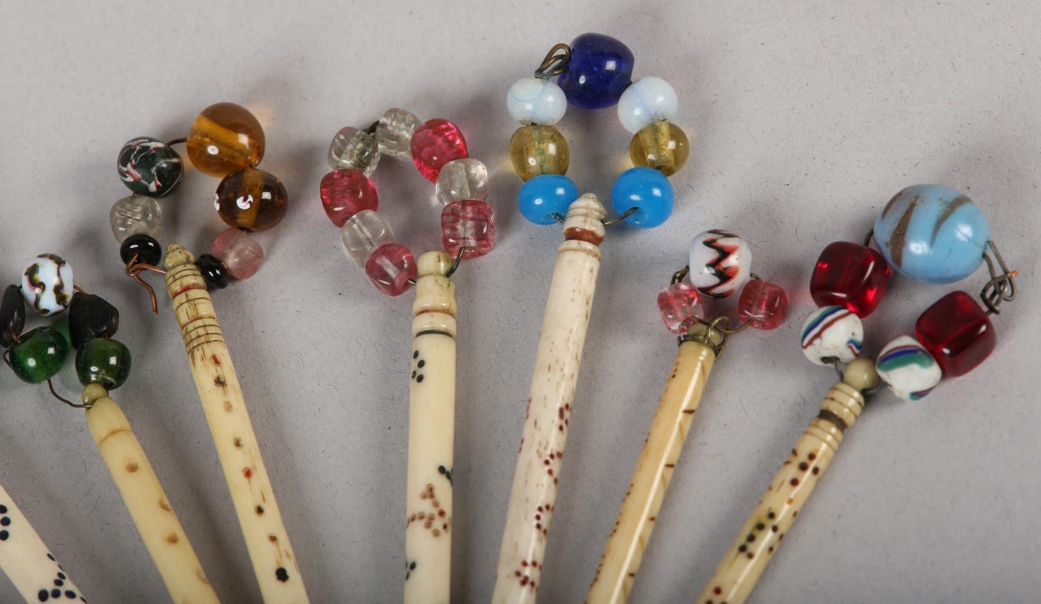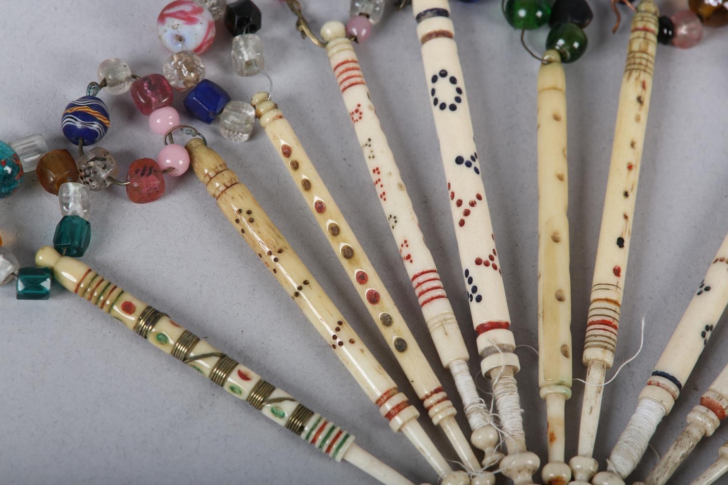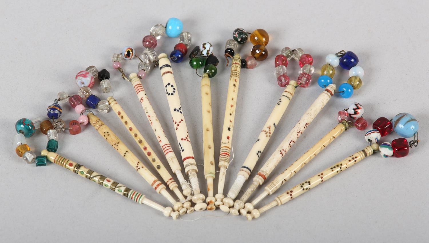 A COLLECTION OF ELEVEN 19TH CENTURY BONE AND BEADED LACE BOBBINS decorated with coloured bands and named for Harriot, Charles, Betsy, Saly, Hannah and others