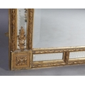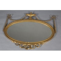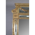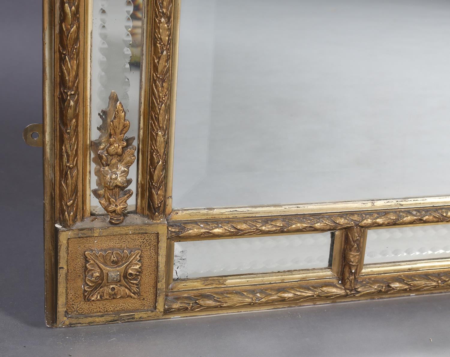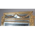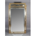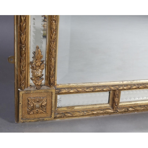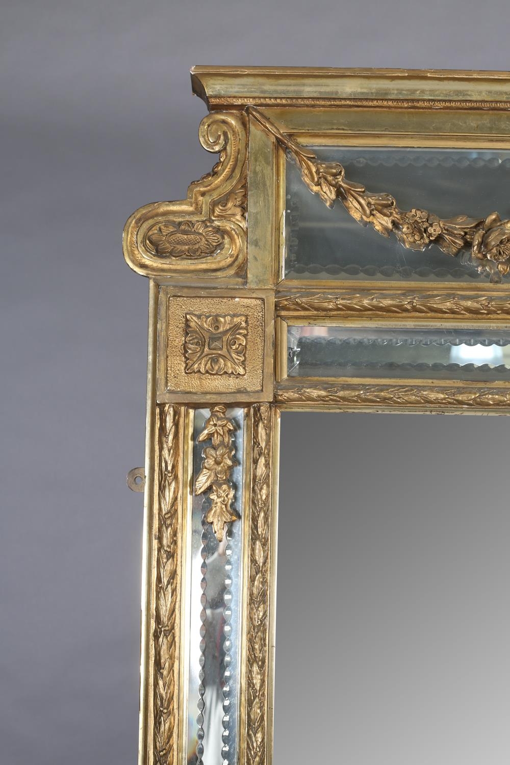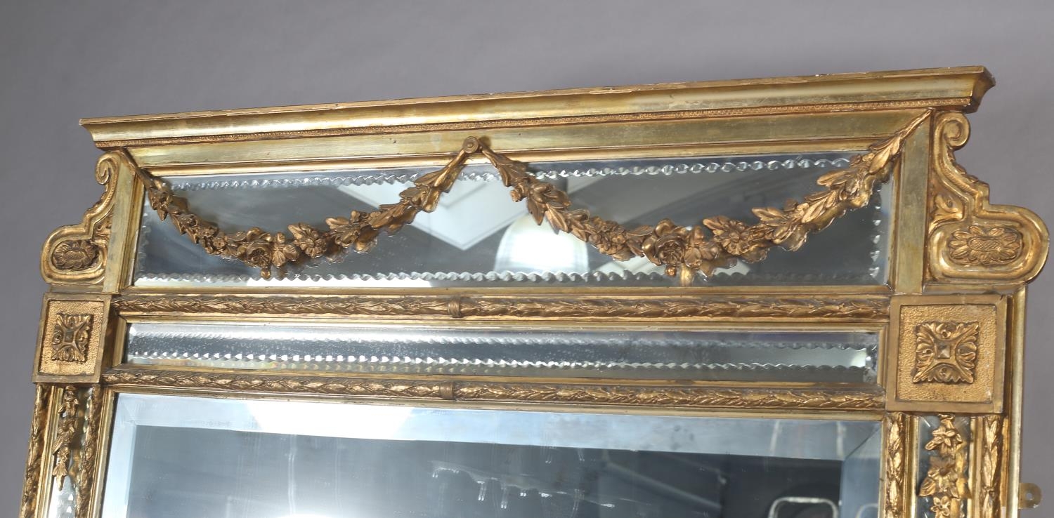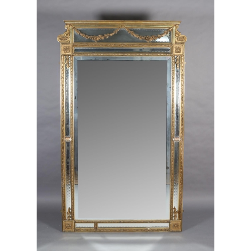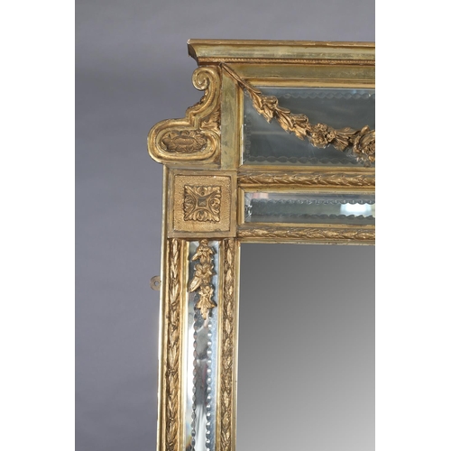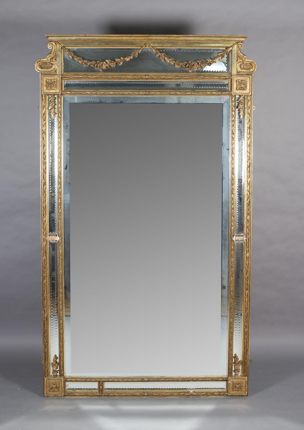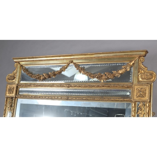 A LARGE 19TH CENTURY GILTWOOD AND GESSO WALL MIRROR, having moulded cornice with scrolled angles above a mirrored panel applied with pendant floral swags, the bevelled glass with edge-cut mirrored margins, between laurel leaf moulded borders, with paterae to each corner, 133cm wide x 222cm high
