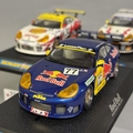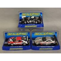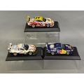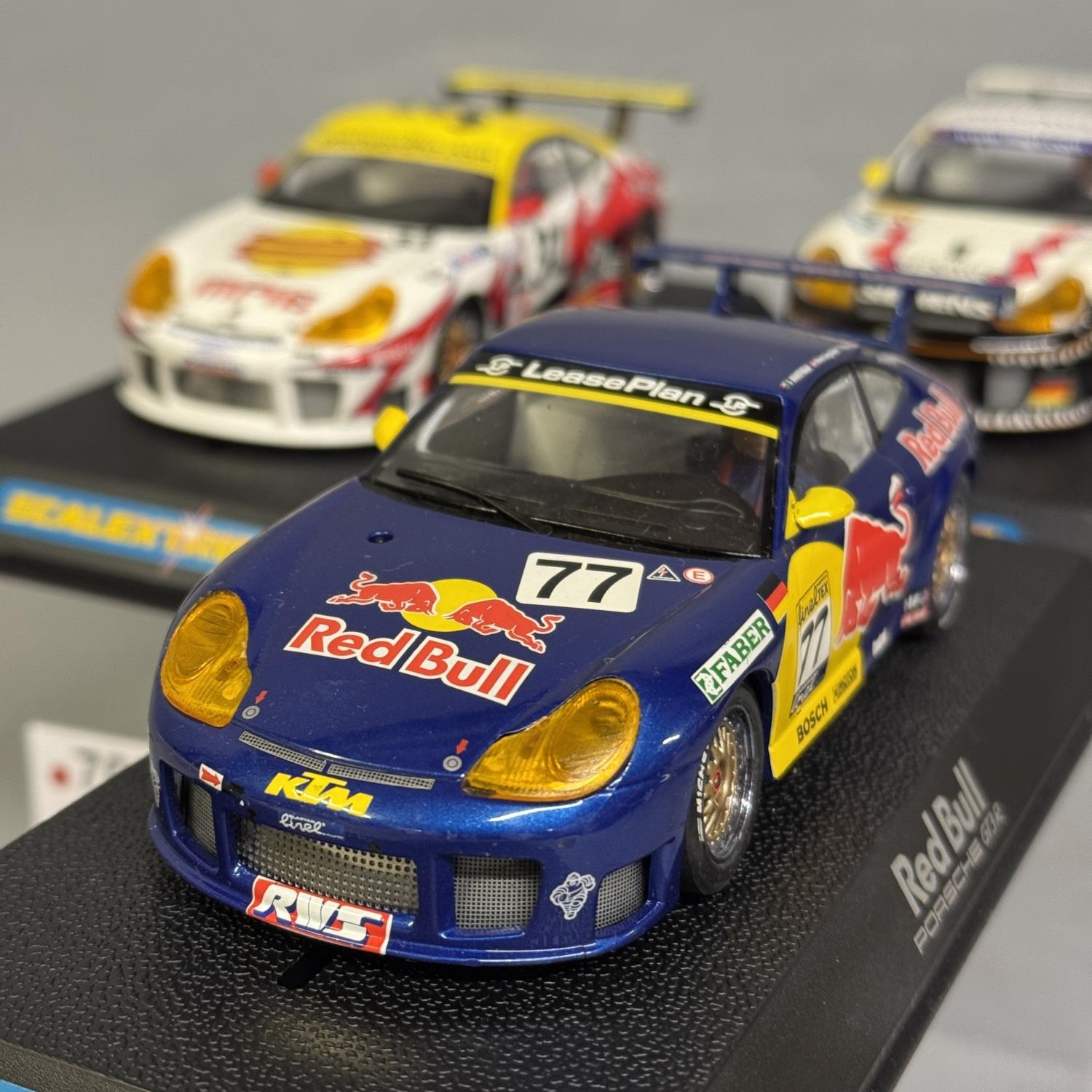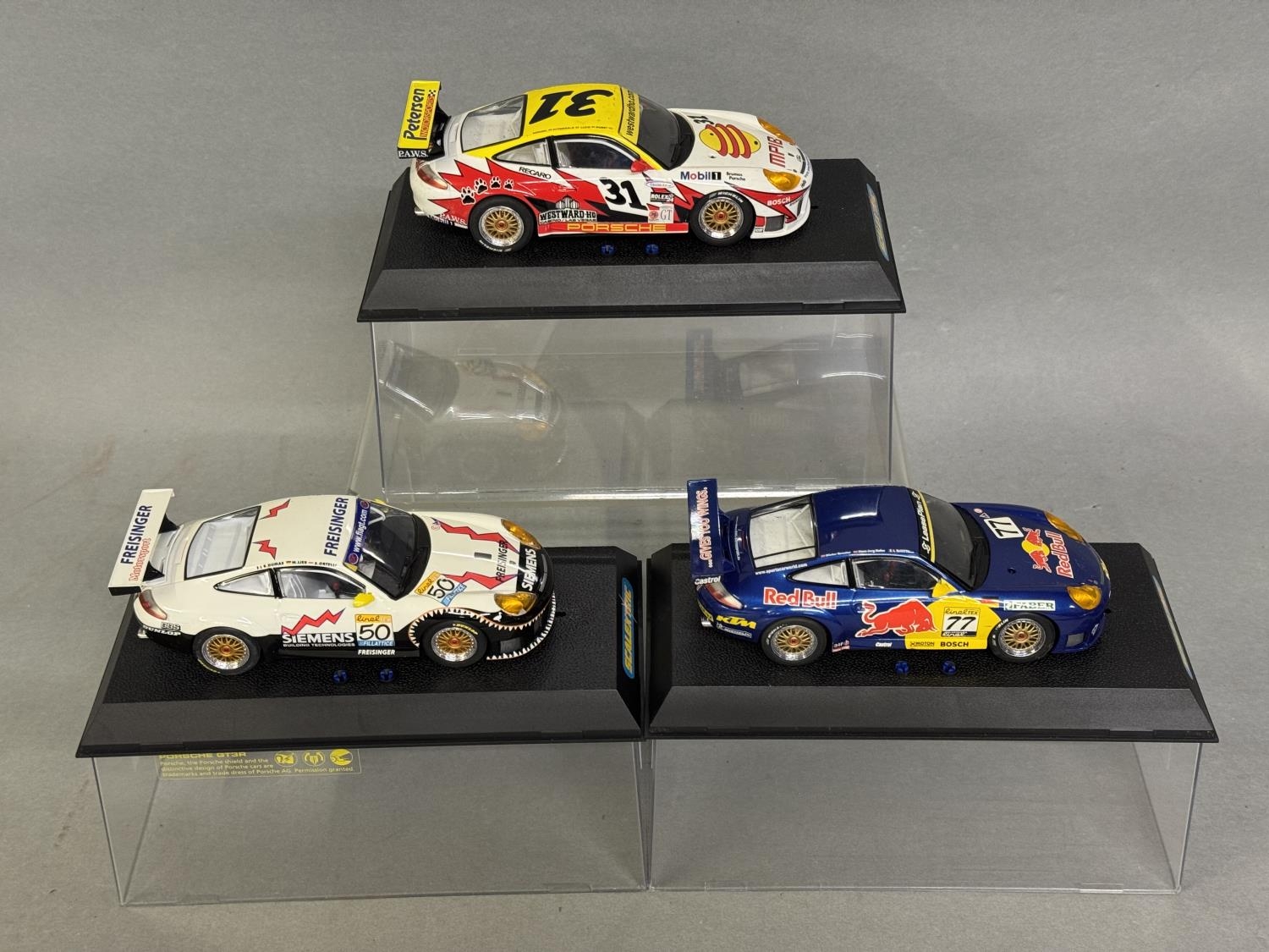 Three Scalextric NASCAR/FIA GT models, including a Red Bull Porsche 911 GT3-R, a Freisinger Motorsport Porsche 911 GT3-R and a White Lightning Porsche 911 GT3-R, all boxed