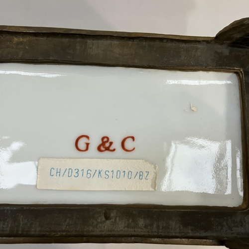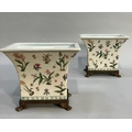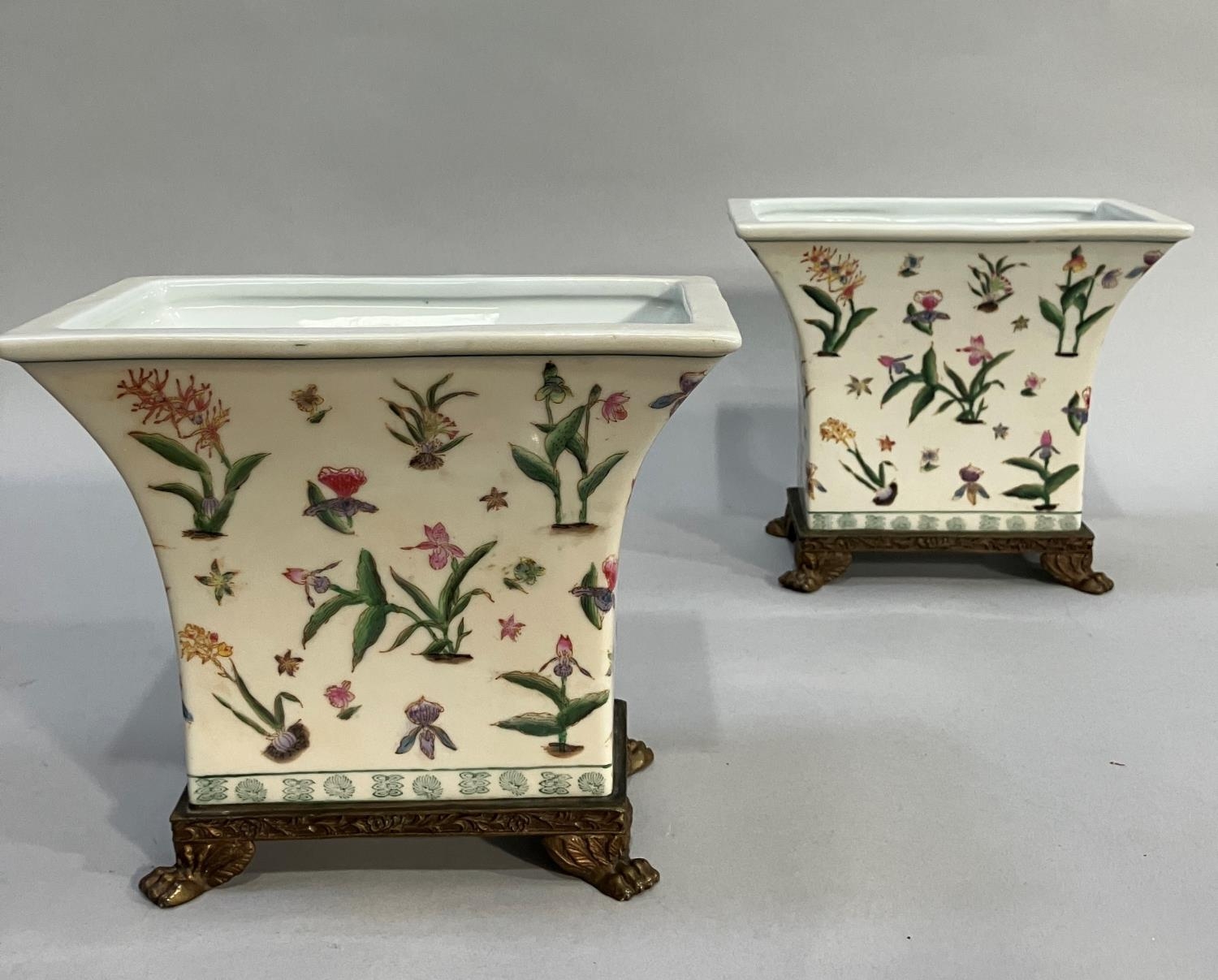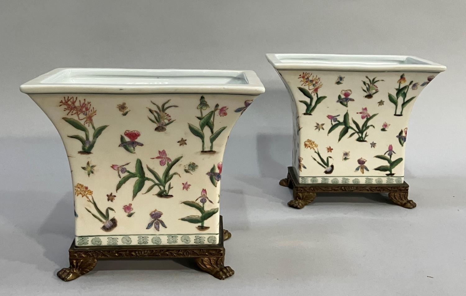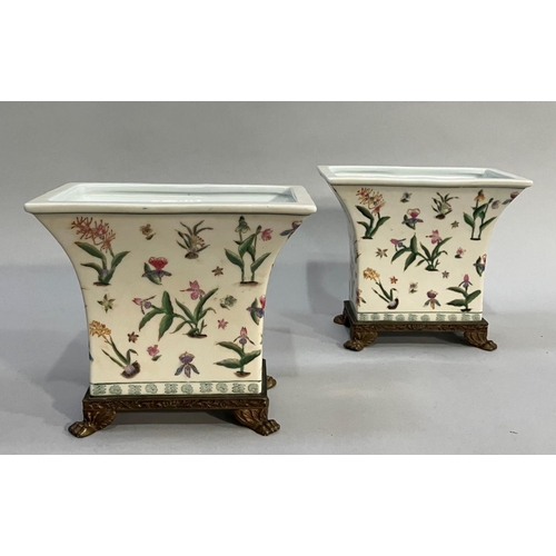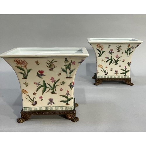 A pair of gilt metal mounted pottery planters of flared rectangular form, printed and enamelled with plant forms and on gilt metal paw feet in the French style, 22.5cm wide x 19cm high