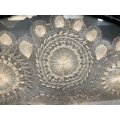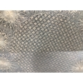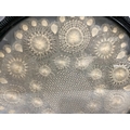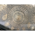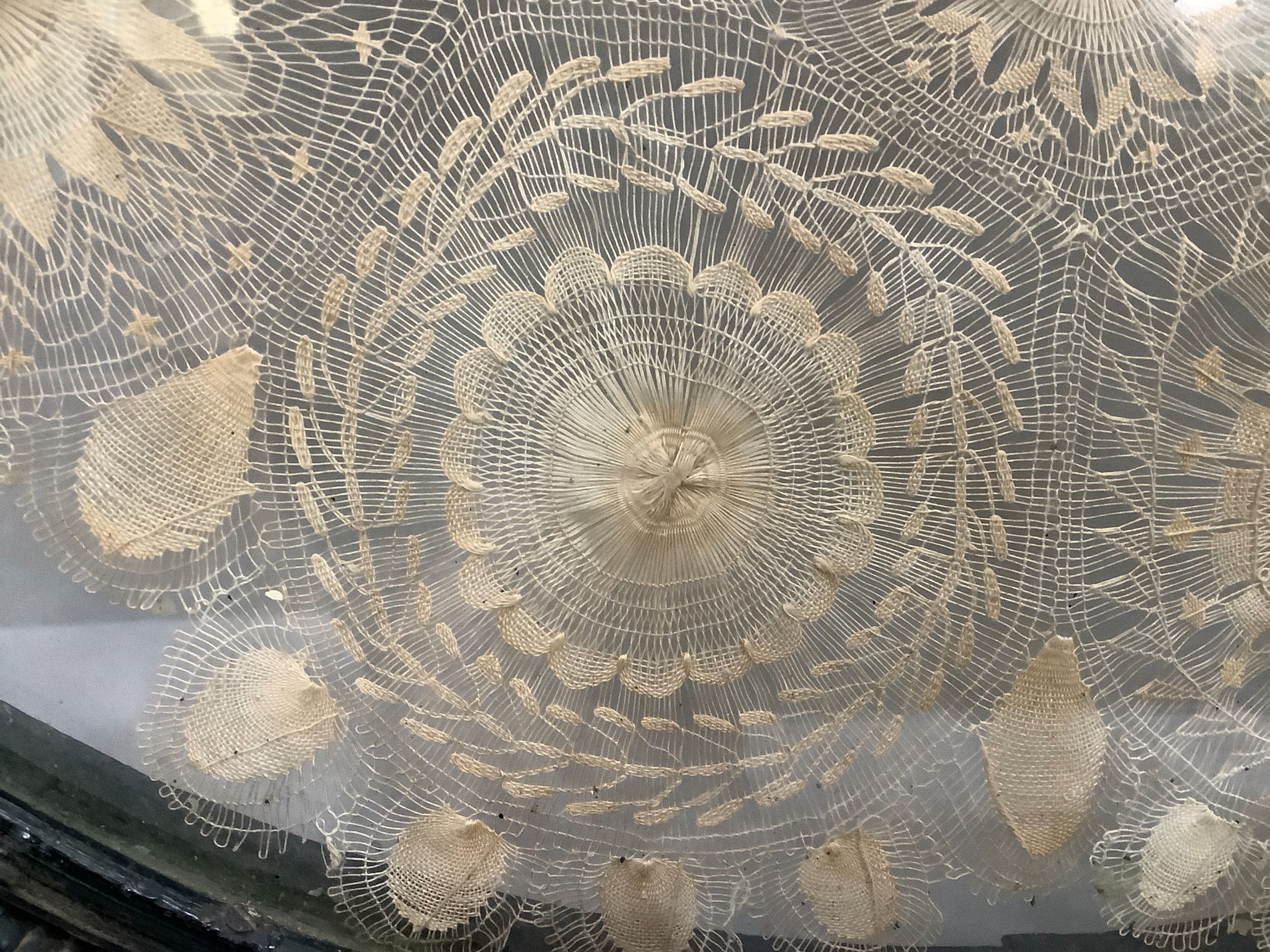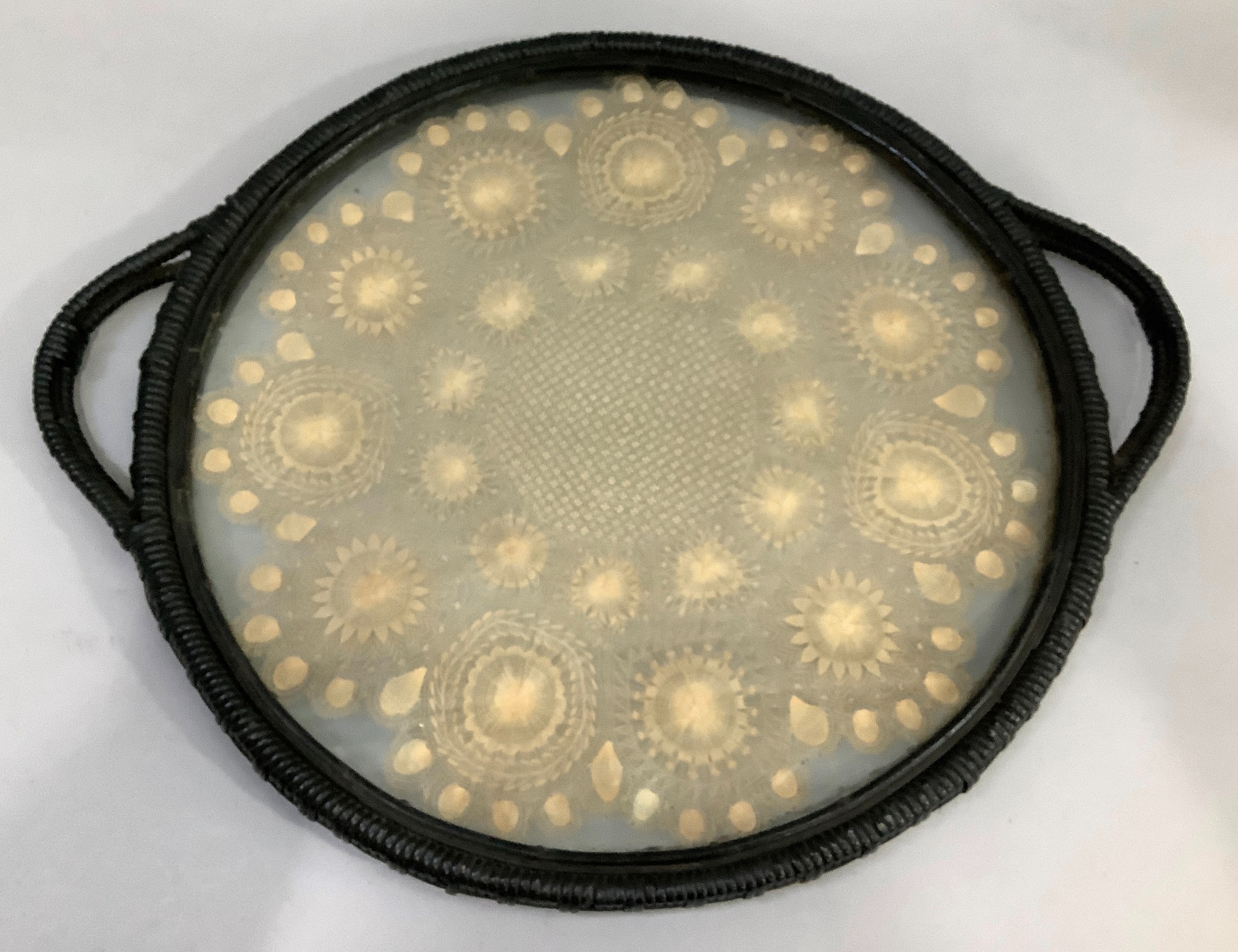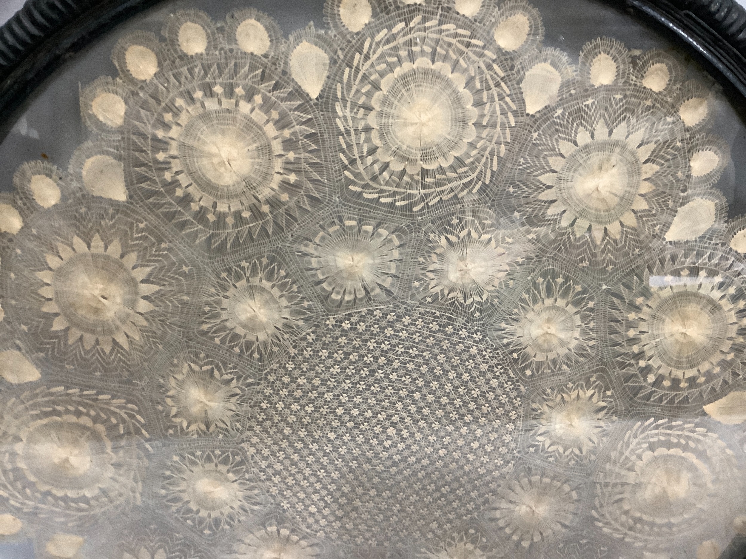 AN ITEM OF NANDUTI LACE DISPLAYED WITHIN A GLASS TWO-HANDLED TRAY, the ecru lace panel finely worked with a series of panels filled with stylised florets and wreaths, scalloped rim, the frame ebonised raffia, 49.5cm diameter, 58cm over handles