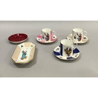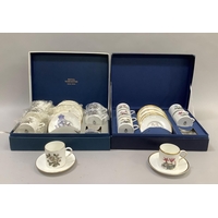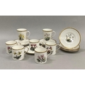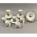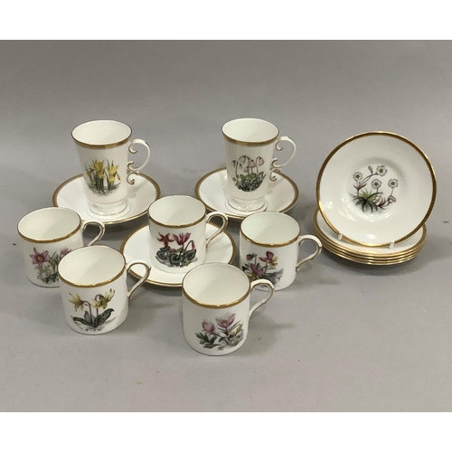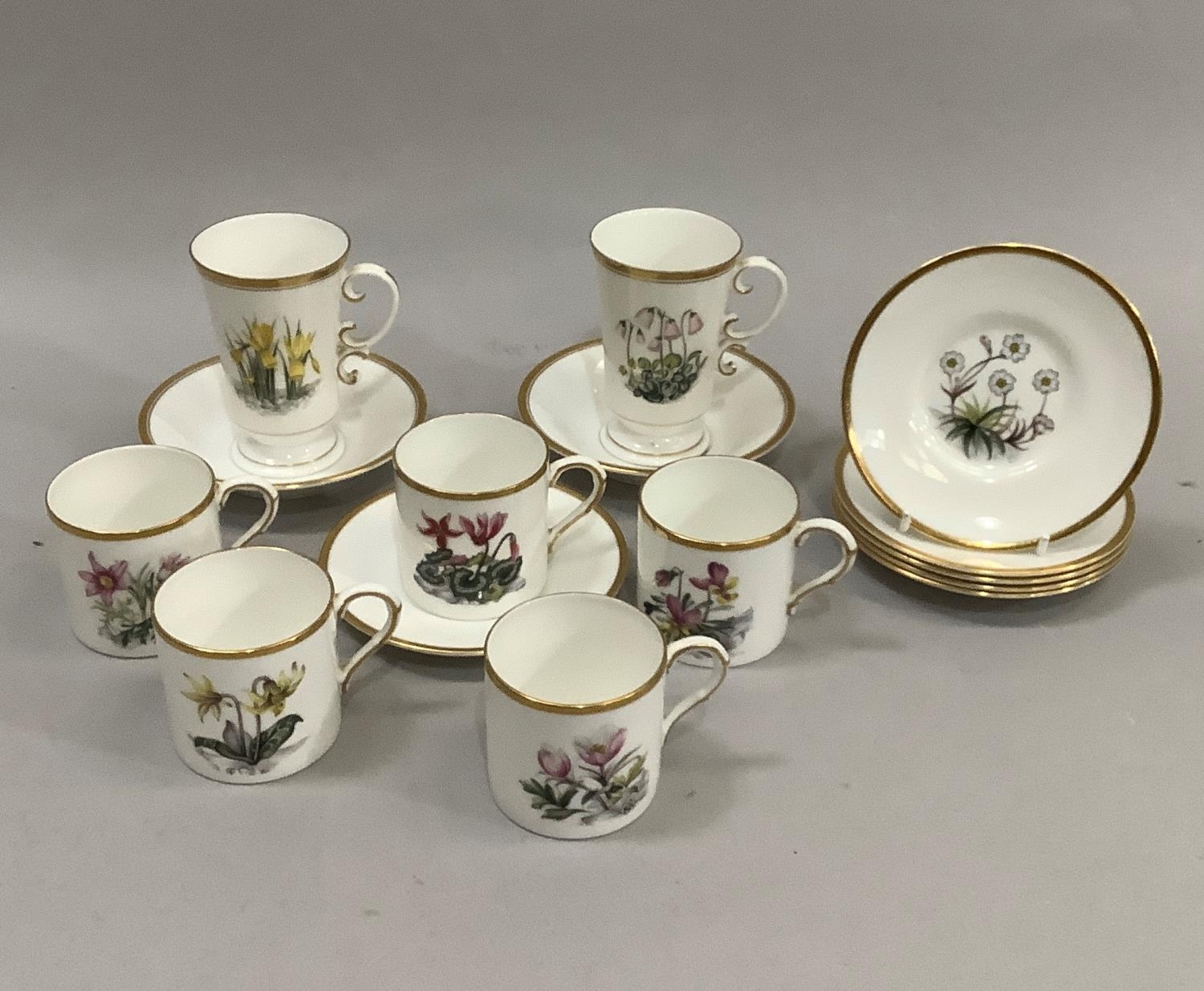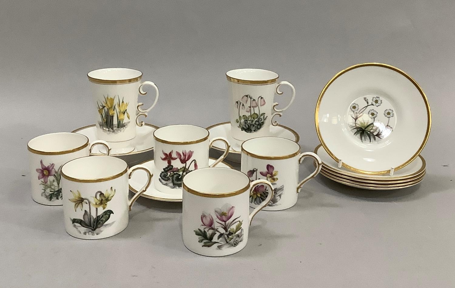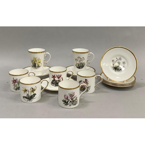 A Royal Worcester set of five coffee cans and six saucers, two café au lait cups and saucers each decorated with a botanical study and gilt rimline