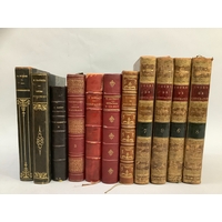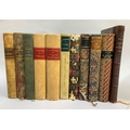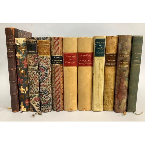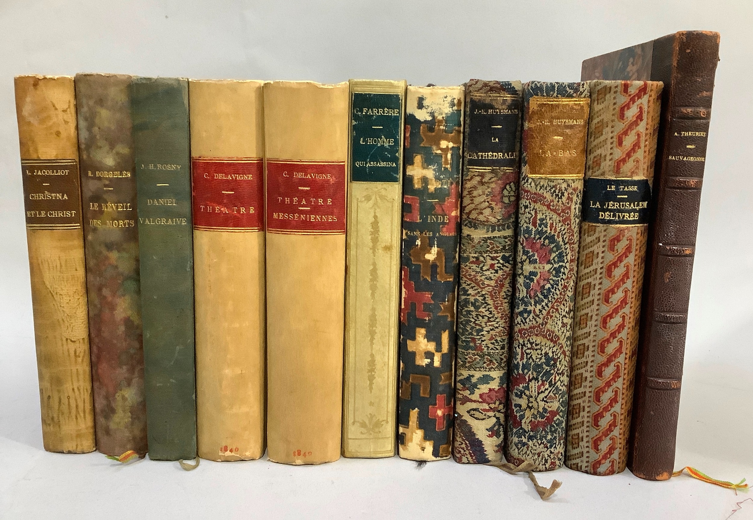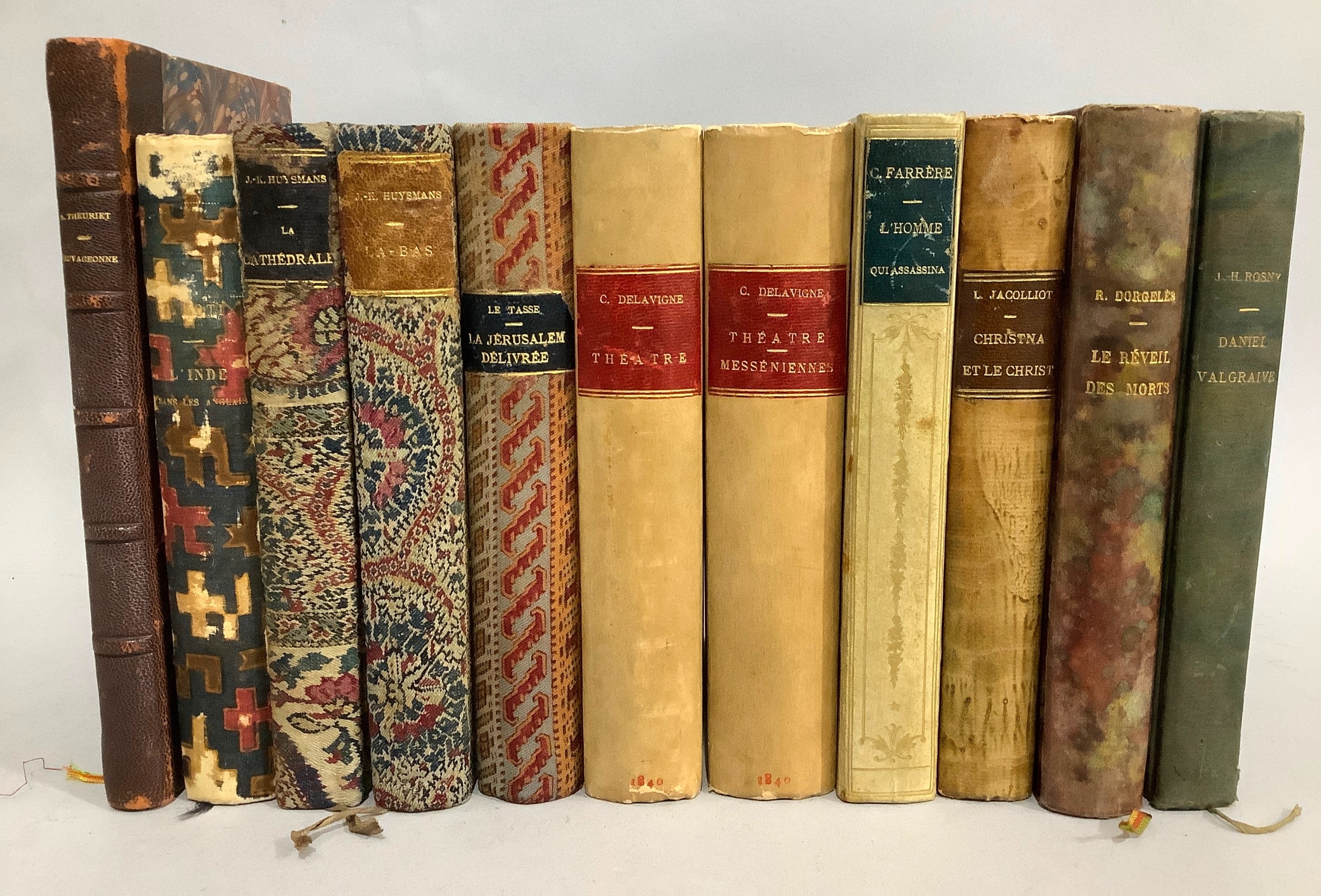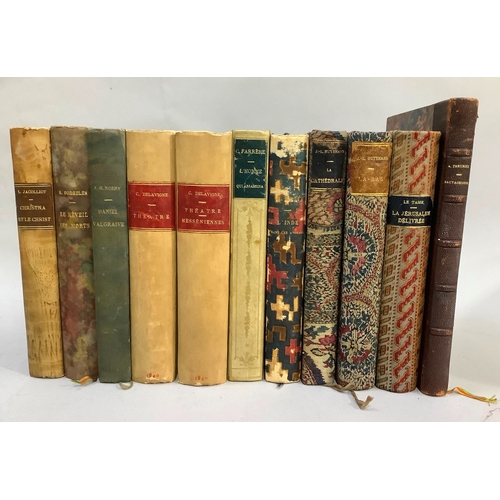 A quantity of French language books with decorative bindings including marbled, calf and printed cloth, Maurice Magre and others in two boxes