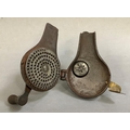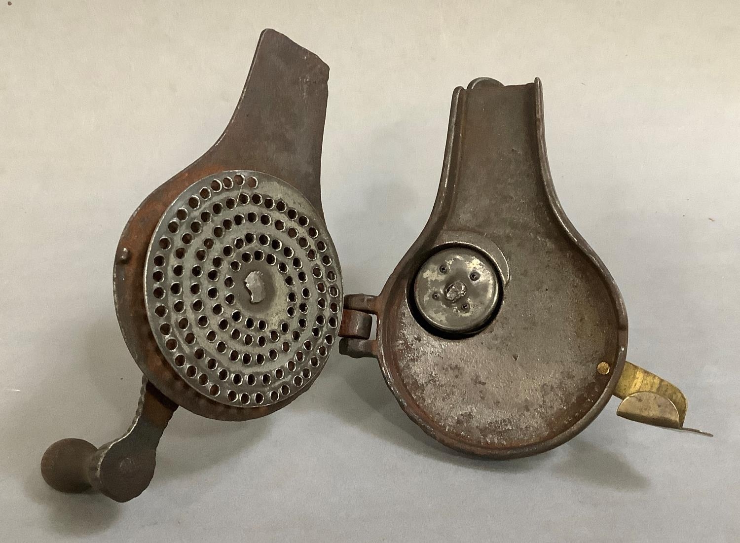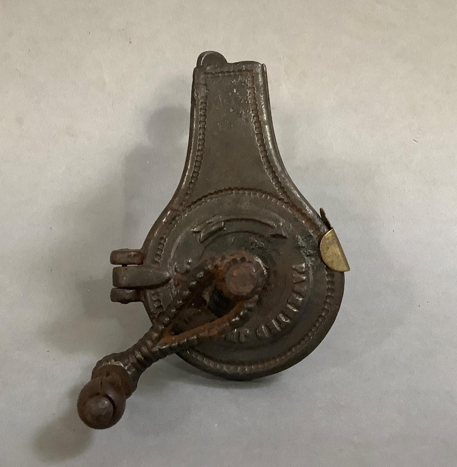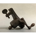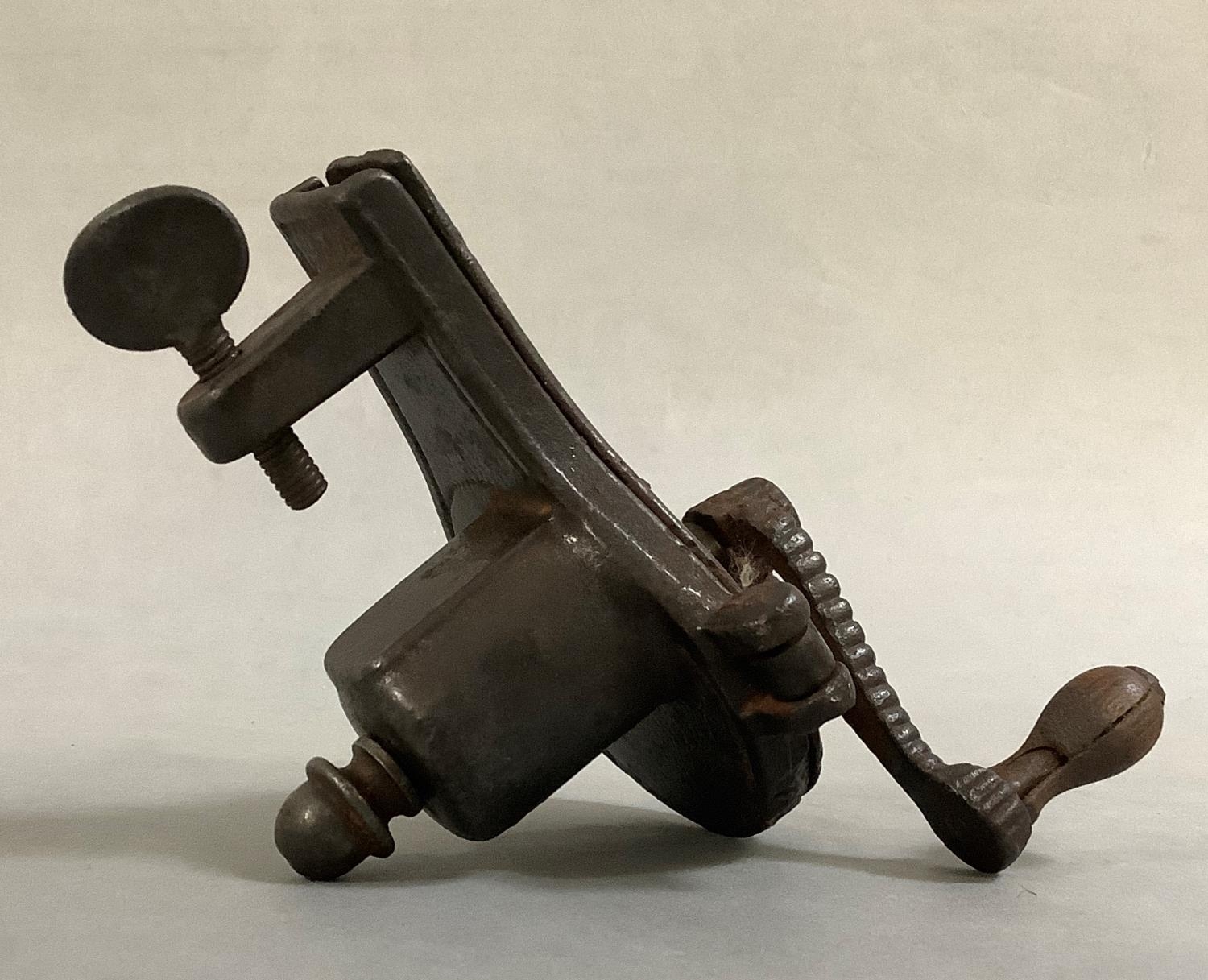 A 19TH CENTURY IRON NUTMEG GRATER, cast with 'Patented June 28 1870' with crank handle and integral small hand vice, 13cm long