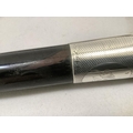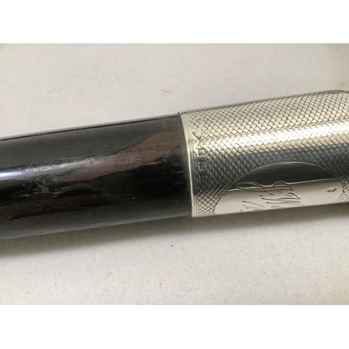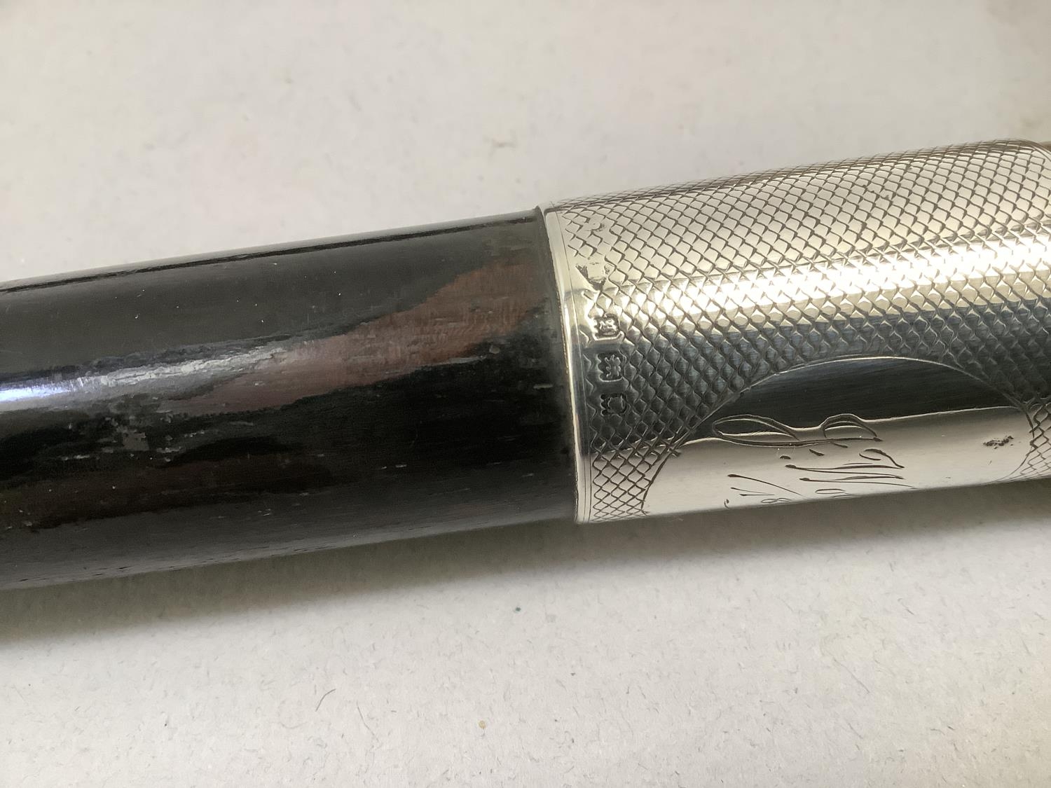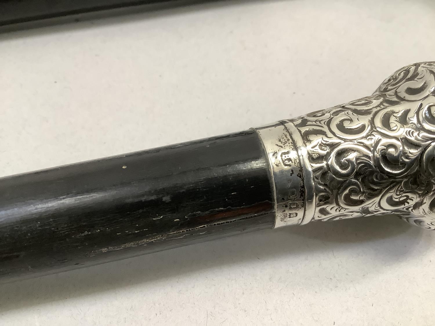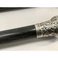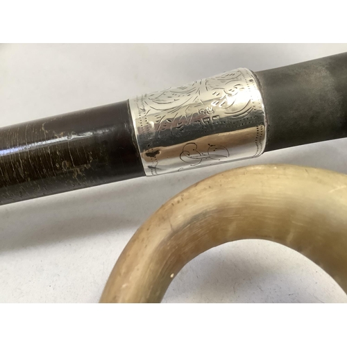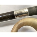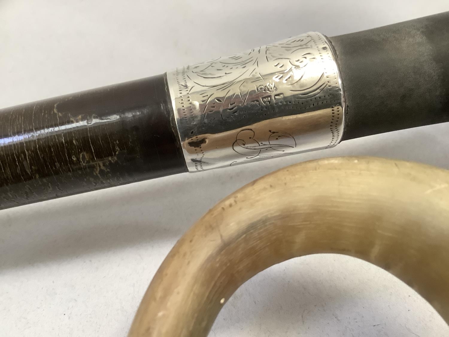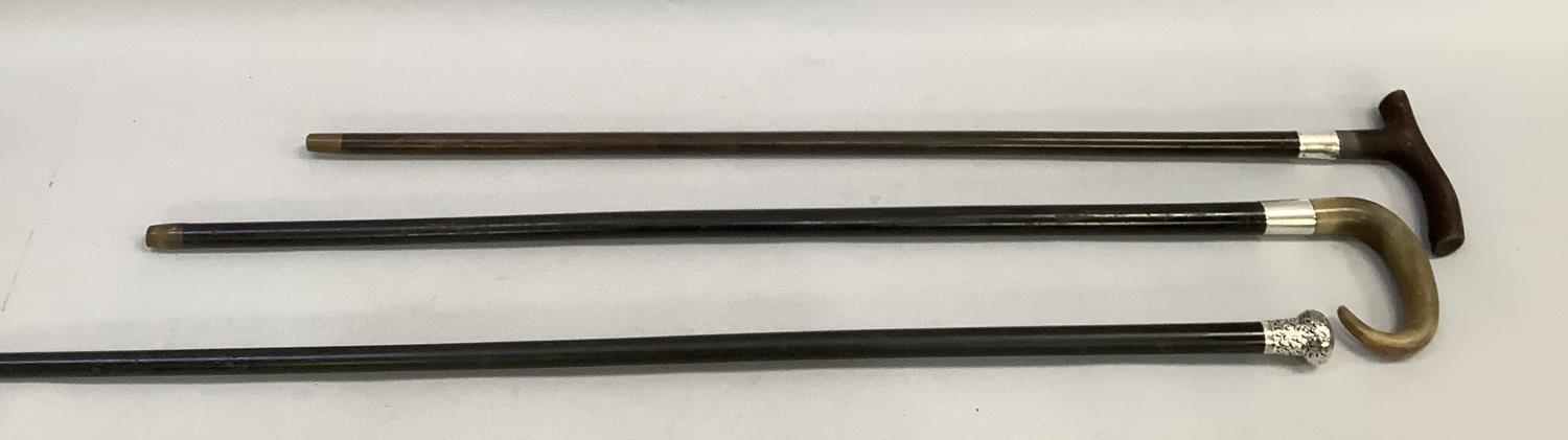 A late Victorian horn handled and silver mounted ebonised walking stick, another with silver mount and an ebonised and silver handled walking cane