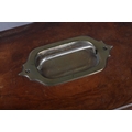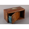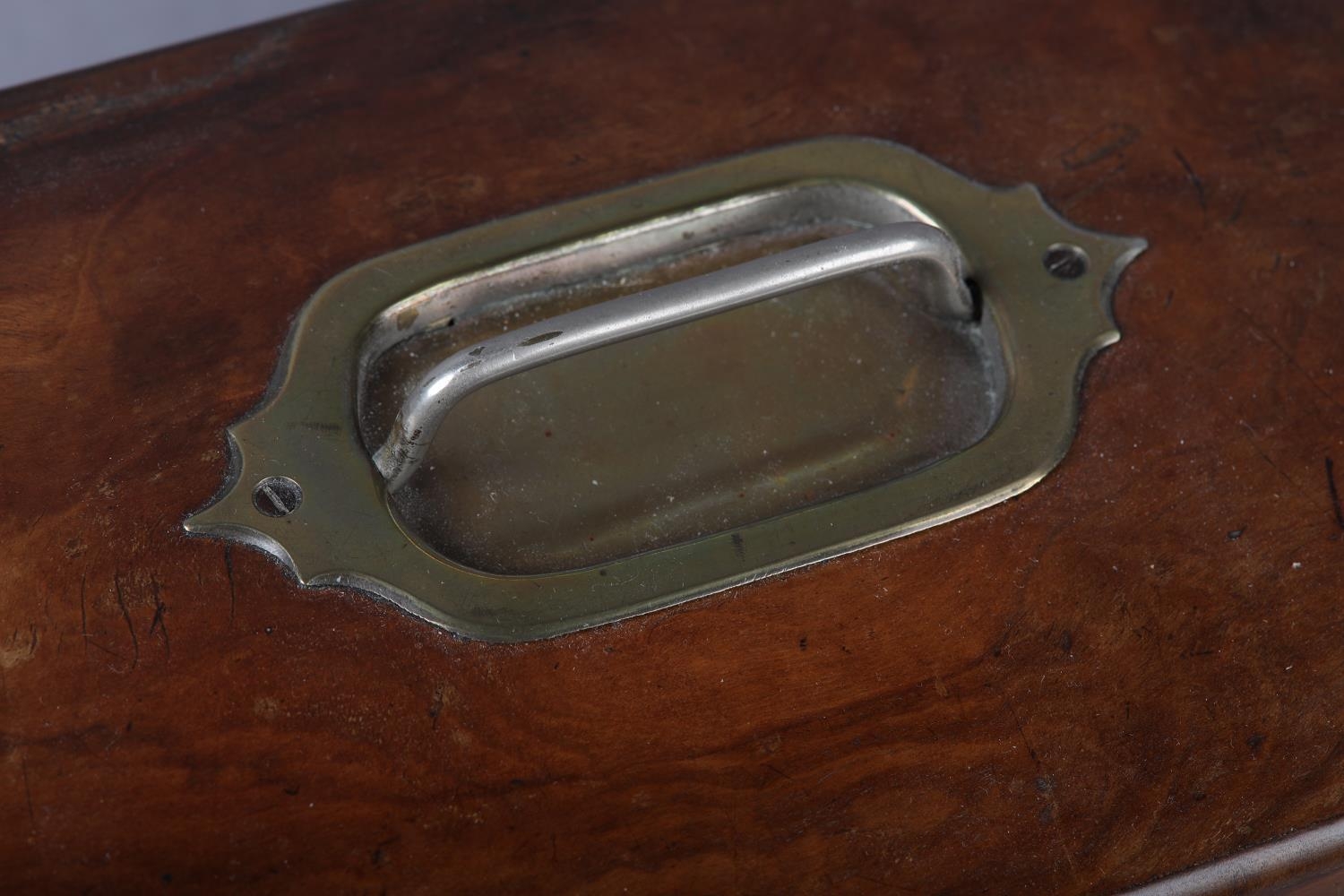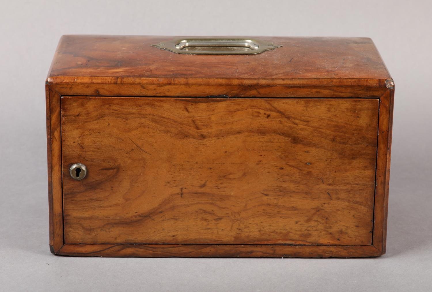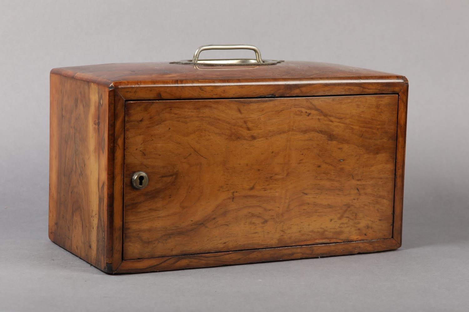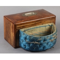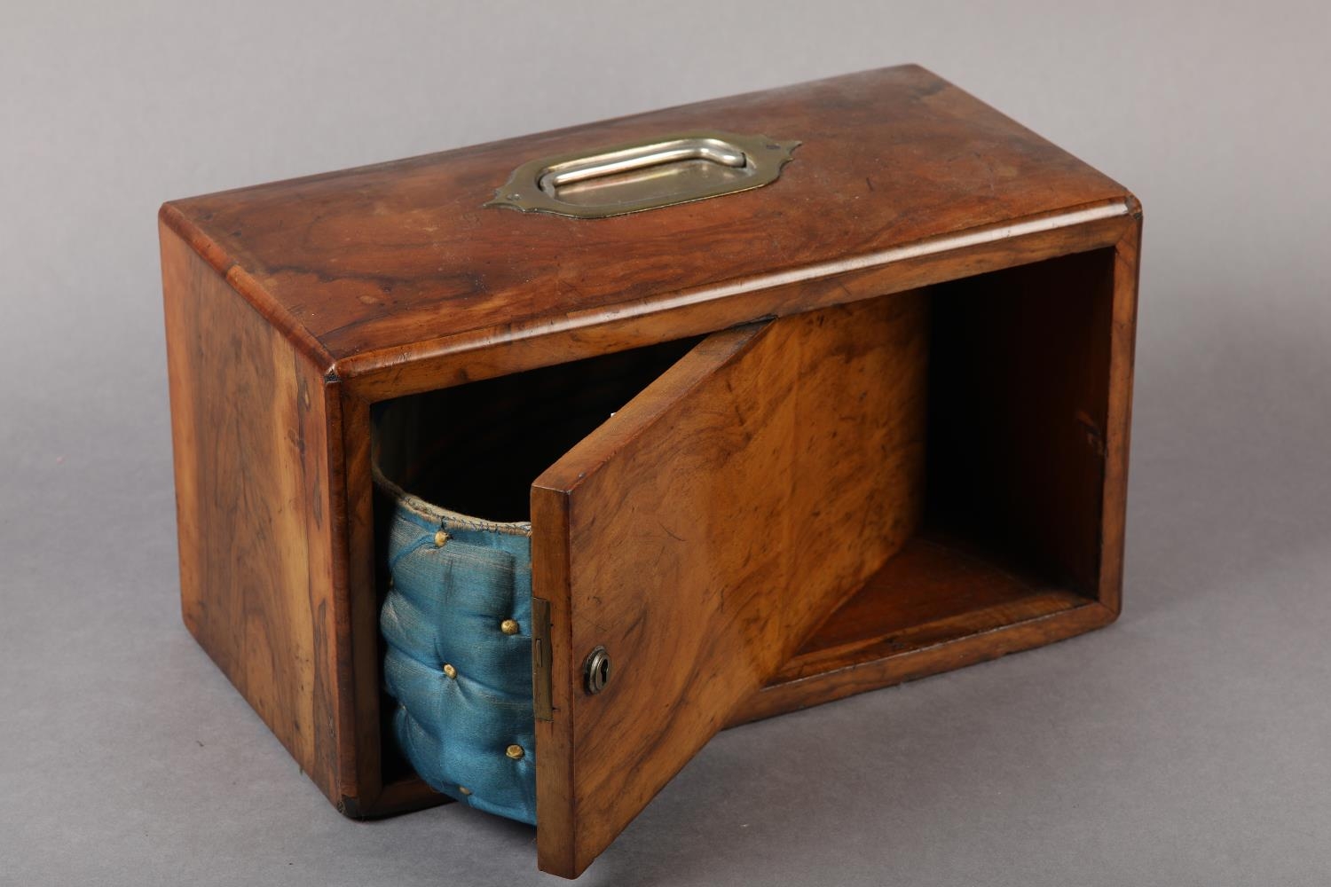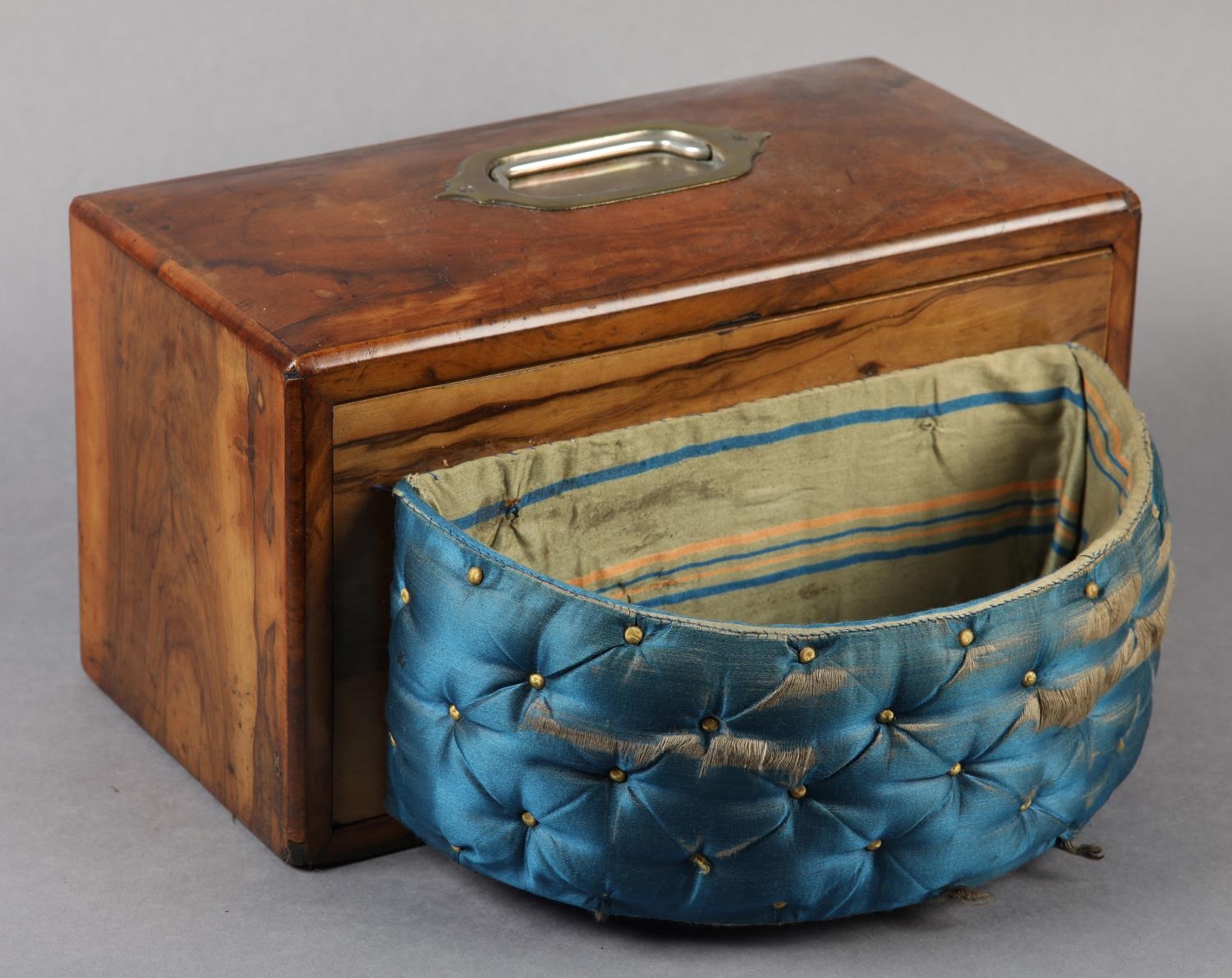 A VICTORIAN WALNUT WORK BOX, rectangular with swivelling front panel and silk semi-circular work basket, recessed carrying handle, 32cm wide x 16cm deep x 18cm high