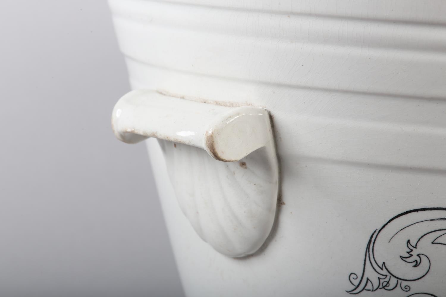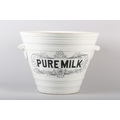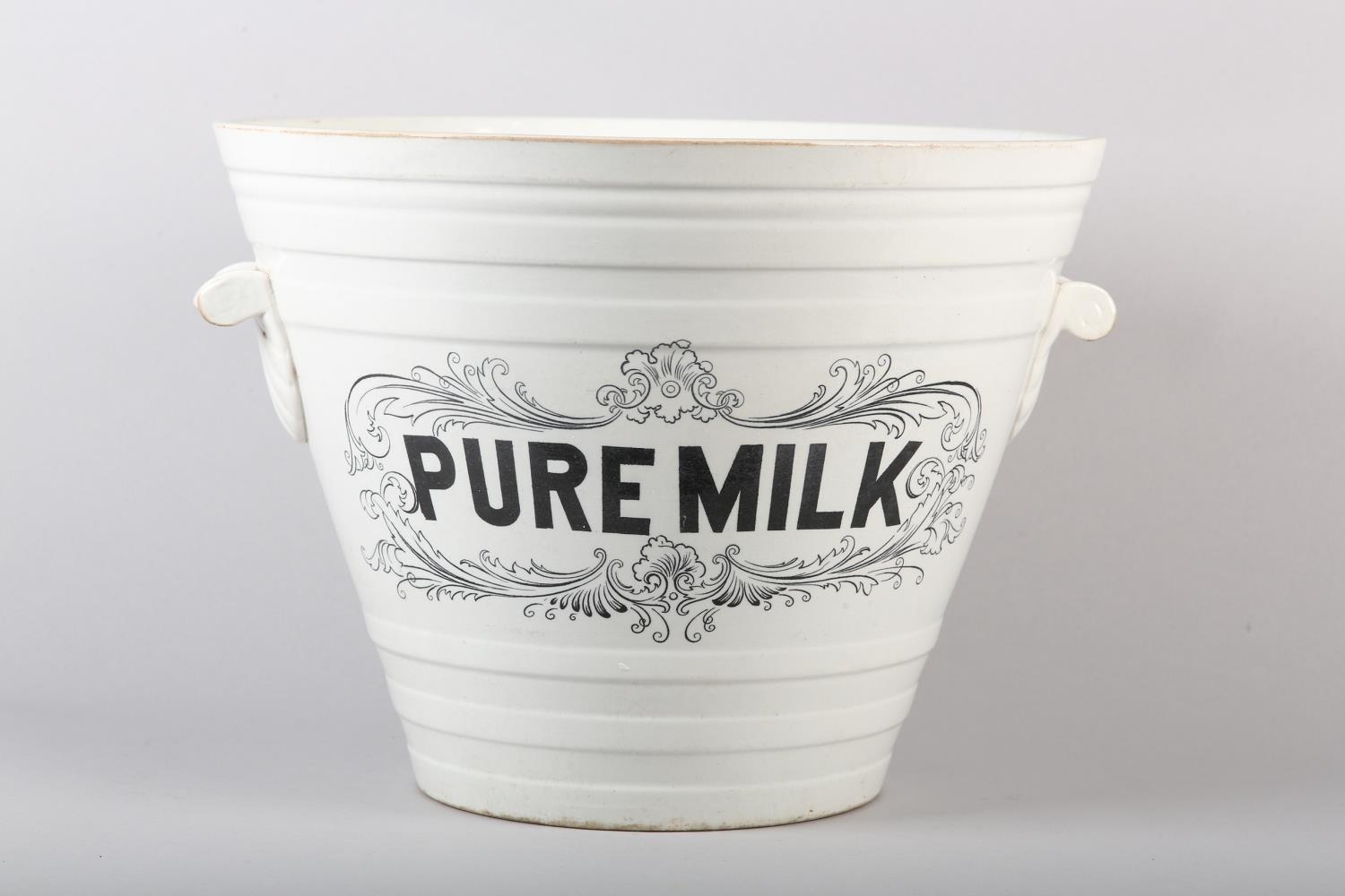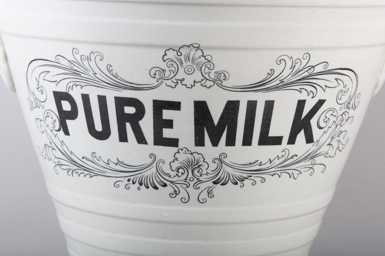 A WHITE GLAZE POTTERY PURE MILK TWO-HANDLED DAIRY PAIL, lettered in black 'PURE MILK' within scrollwork, 39cm diameter x 31cm high