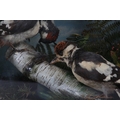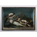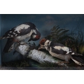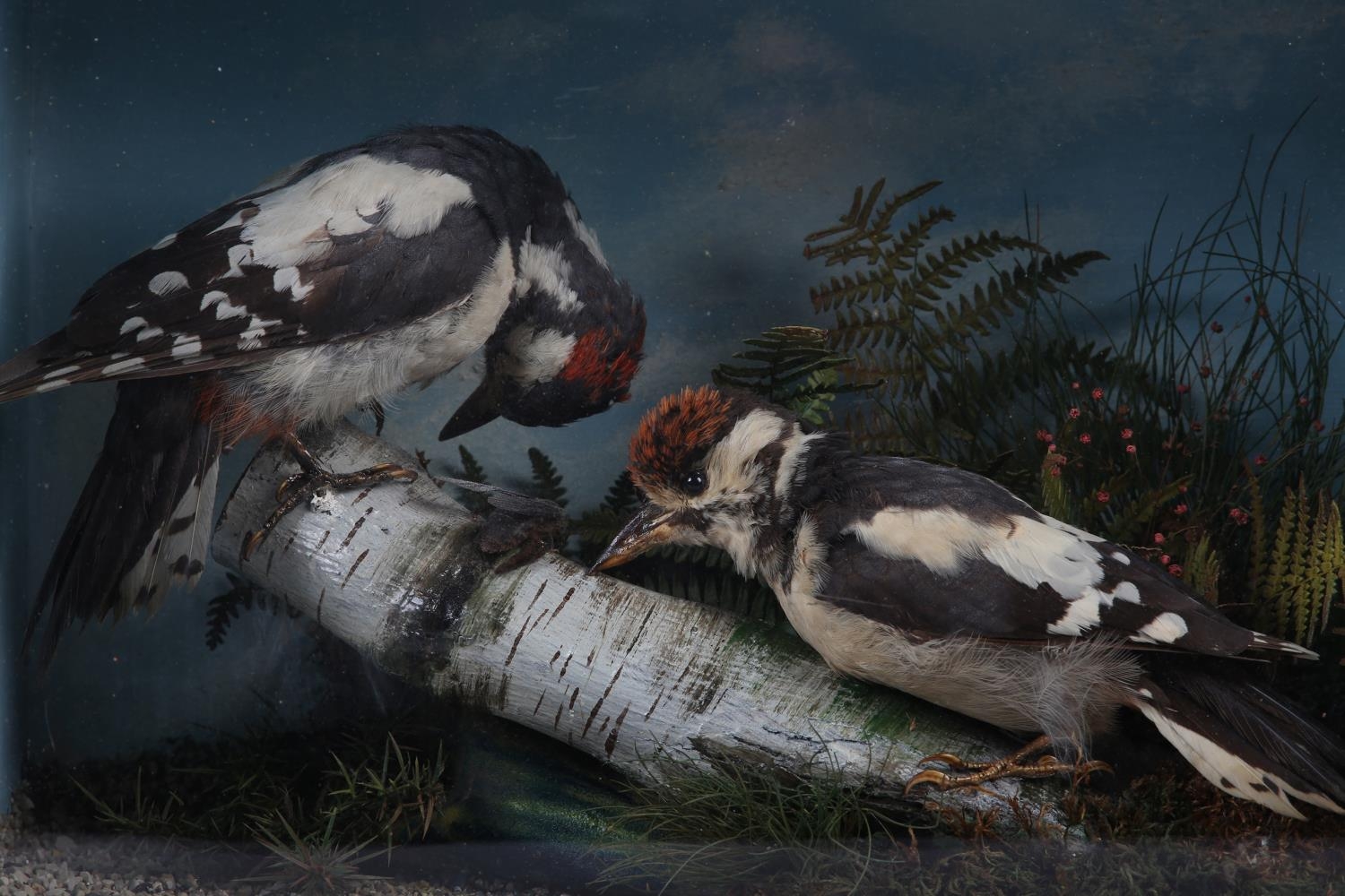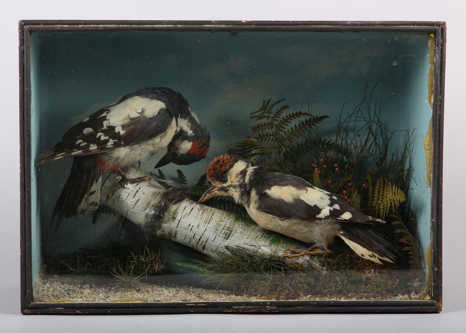 TAXIDERMY: A PAIR OF GREAT SPOTTED WOODPECKERS, (Dendrocopos major) cock and hen, perched on a silver birch branch, amongst grasses and ferns, glazed case, with maker's label verso for Edward Allen, no. 6 Eastgate, York, 34cm wide x 16.5cm deep x 23.5cm high