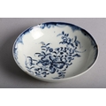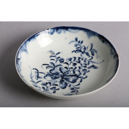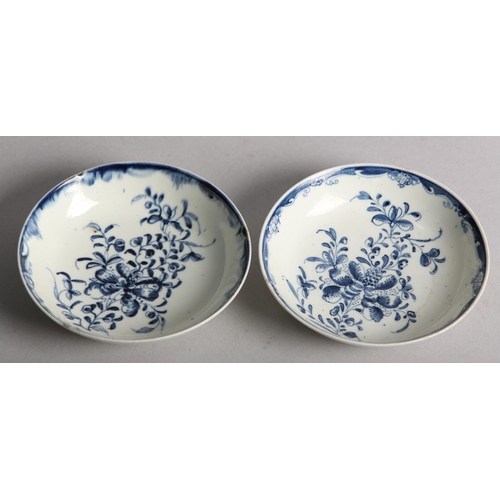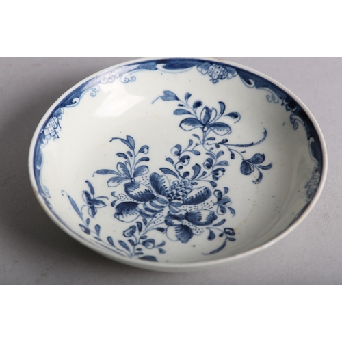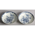 TWO 18TH CENTURY BLUE AND WHITE PORCELAIN SAUCER DISHES, each painted with a version of the Mansfield pattern, within a diaper cell panel and scroll border to the rim, unmarked, 12cm diameter