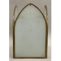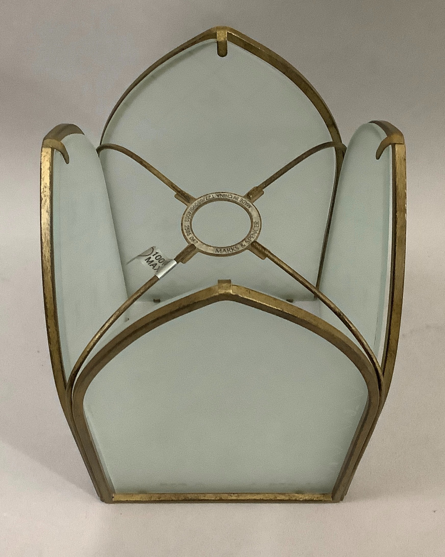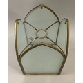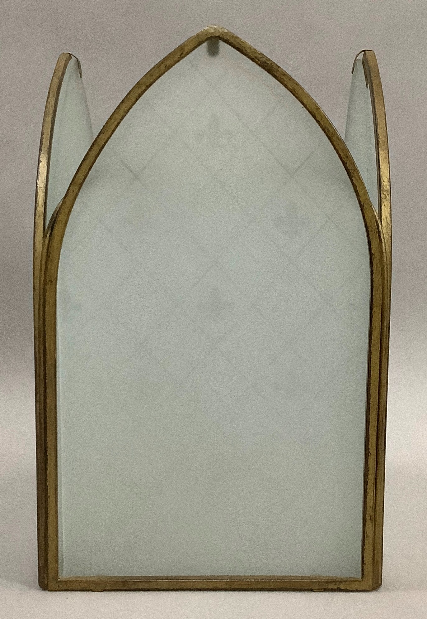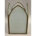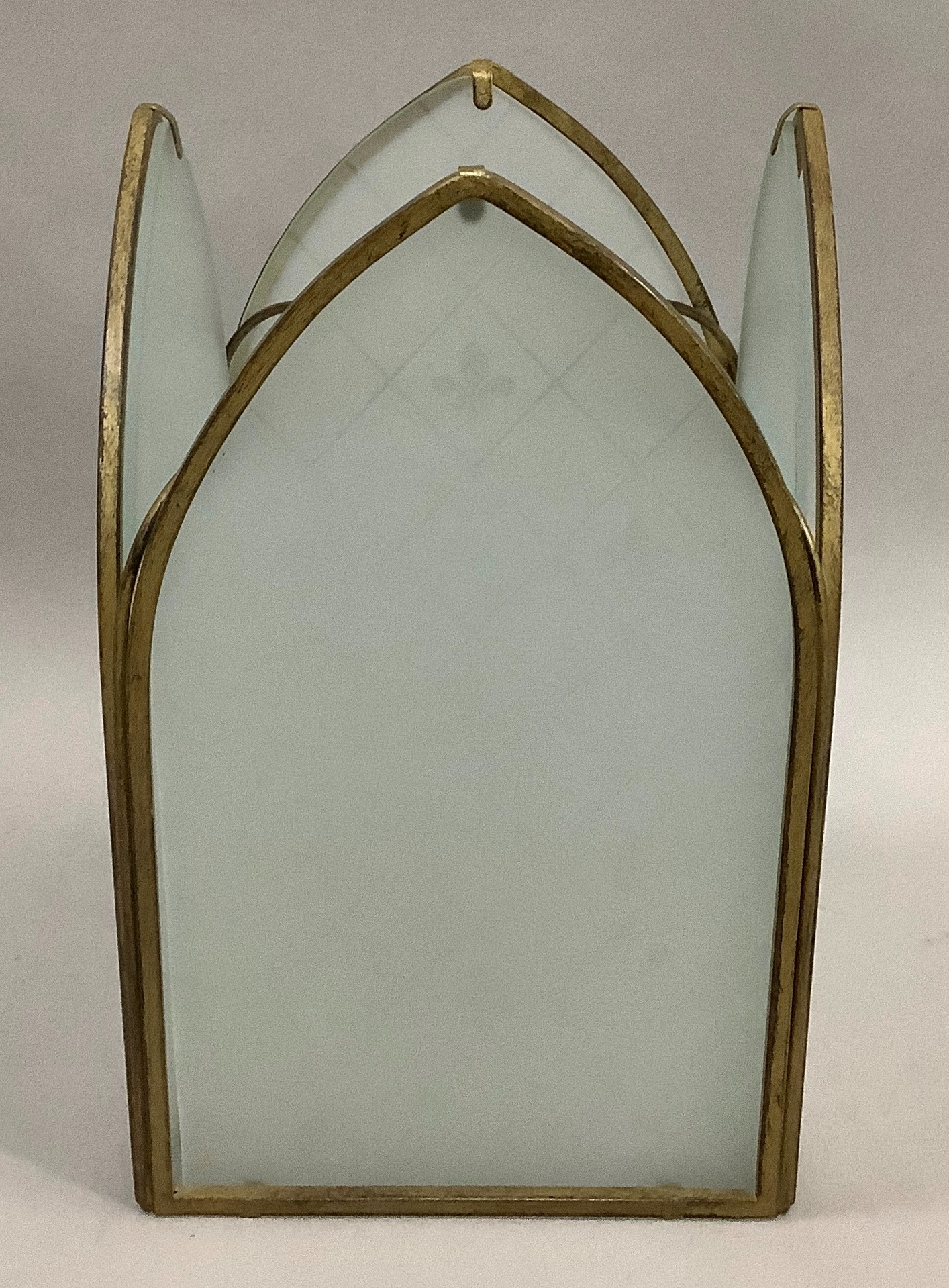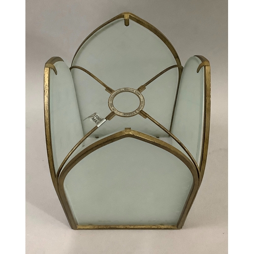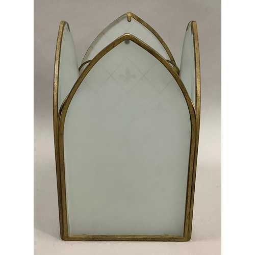 An opaque glass and metal framed four sided pendent light fitting each panel of lancet form, 26cm drop x 16cm square