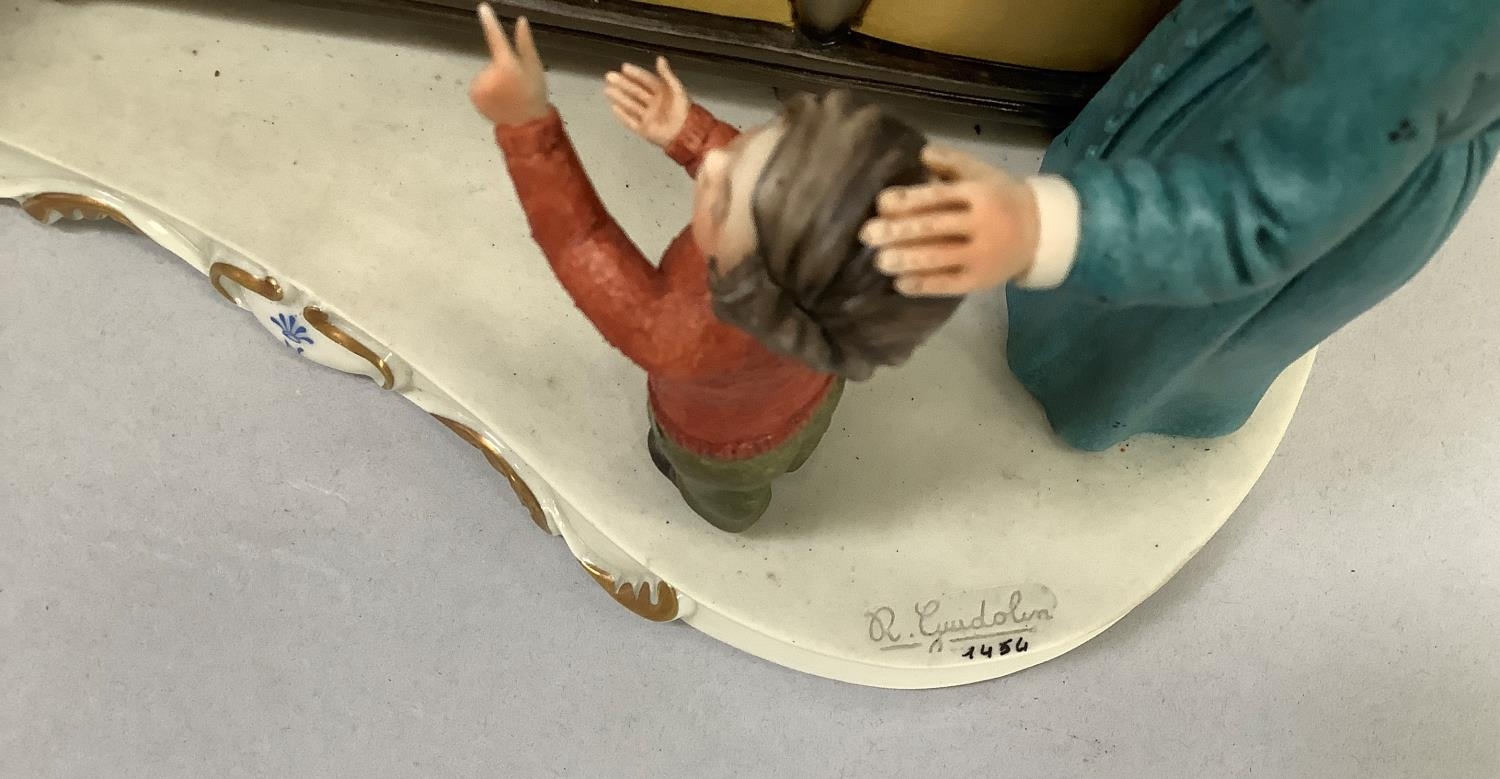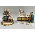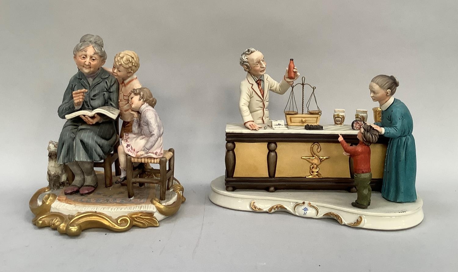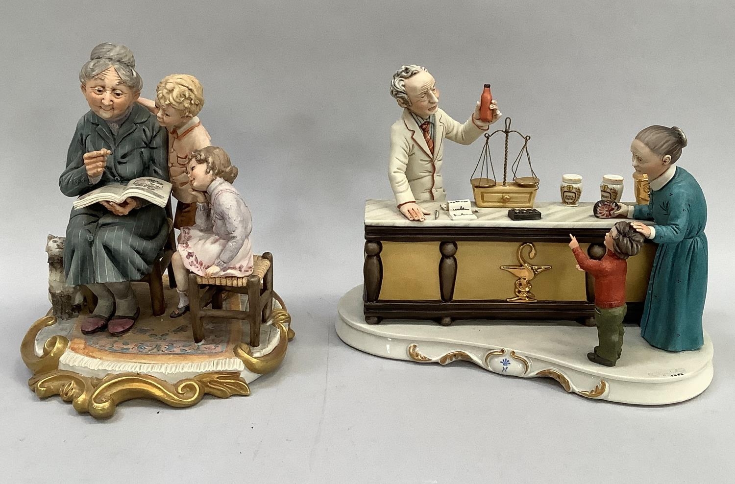 Two Italian ceramic groups in the style of Capodimonte, one a grandmother reading to her grandchildren, 23cm high, the other grandmother and child visiting the chemists, the second inscribed with signature R Gudolin, 21.5cm high