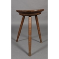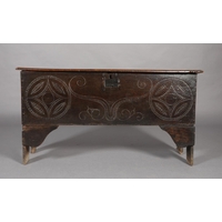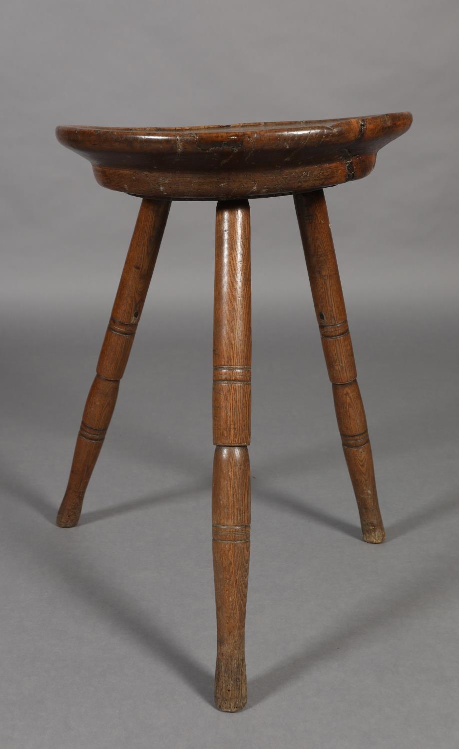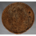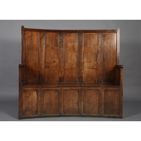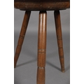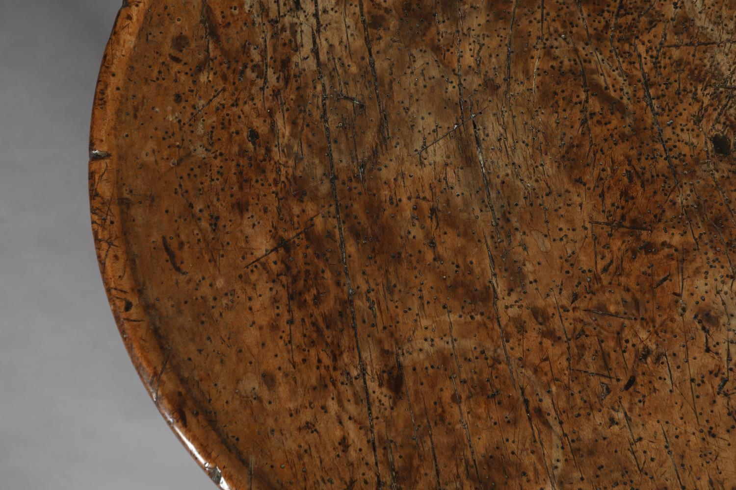 The top of the seat has a lot of old scoring and old woodworm holes. There are also splits that have been filled. There are further splits to the underside which have been filled. The legs maybe later replacements which were formerly joined by stretchers. In good rustic condition. Please see images for further details.