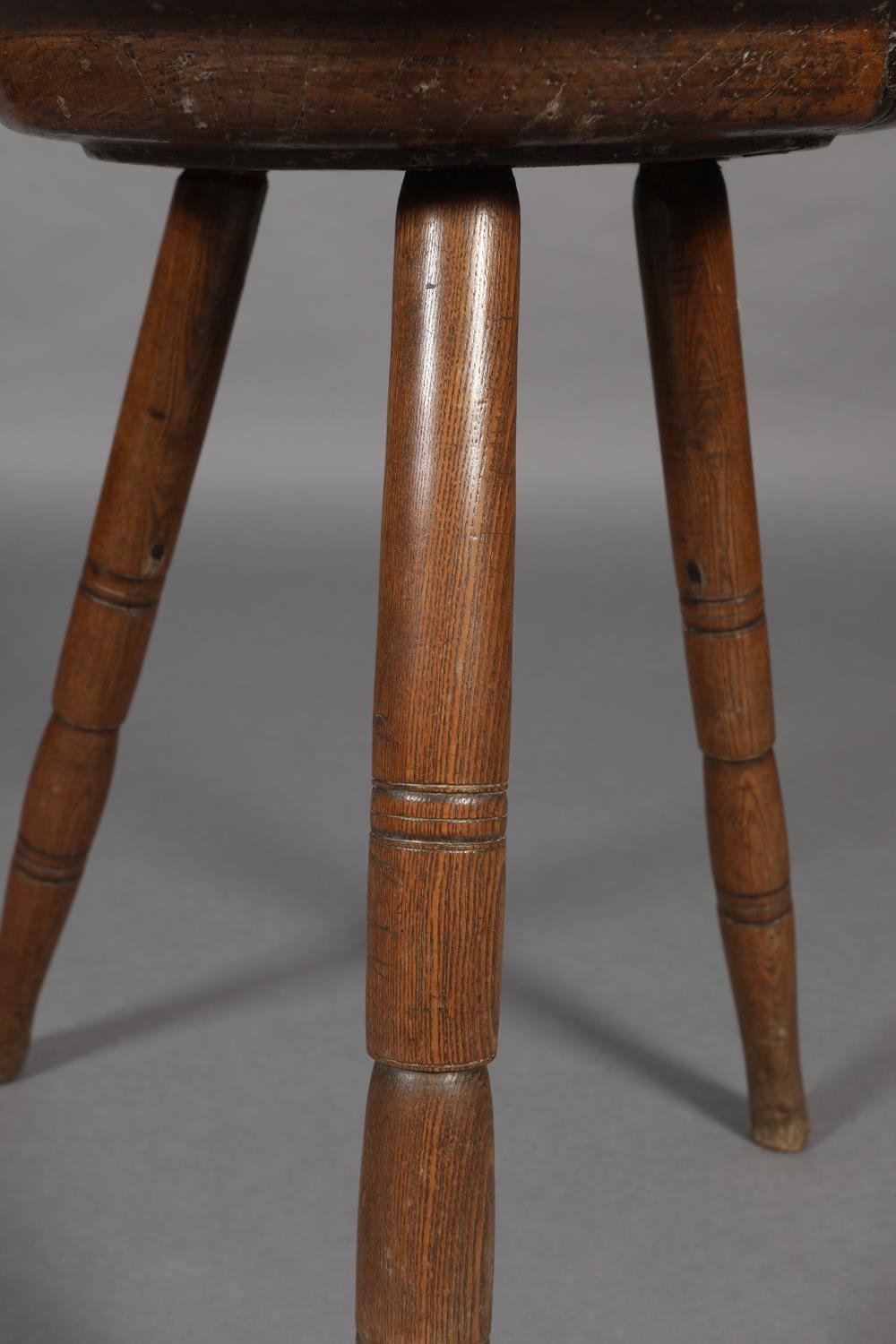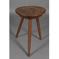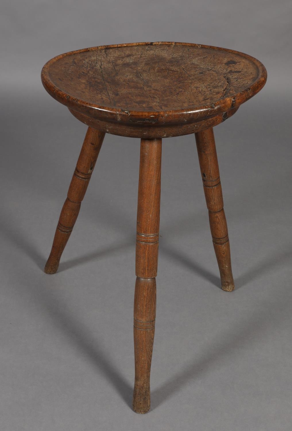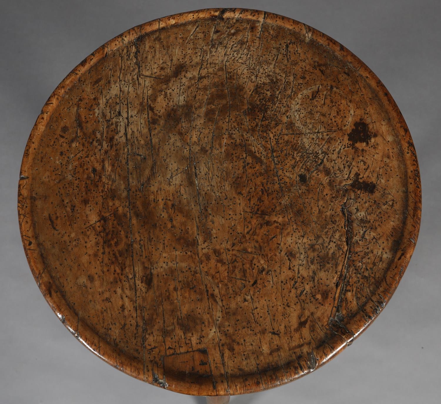 AN 18TH CENTURY SWISS FRUITWOOD CHEESE TABLE, dished circular top, on three turned legs, 48.5cm diameter x 66cm high