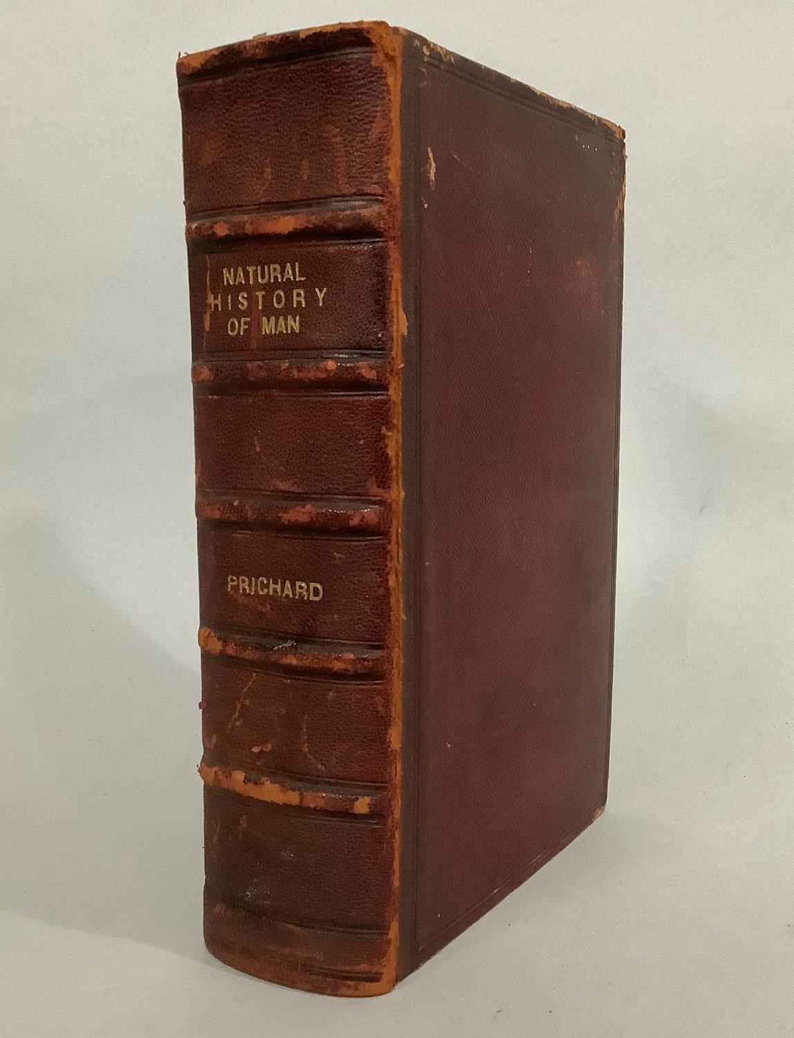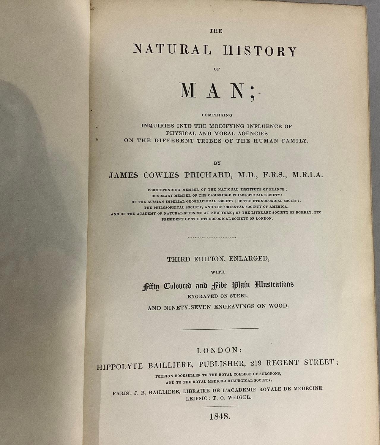 PRICHARD, JAMES COWLES - THE NATURAL HISTORY OF MAN, 3rd ed., enlarged, illus. pub. Hippolyte Bailliere, 219 Regent Street, London, 50 col illus., red morocco binding (missing plate number 28)